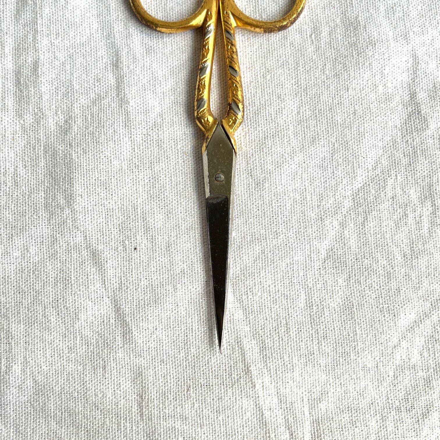貴賓あるオールドレザーのケースを開くとサイズの異なるゴールドの装飾されたハサミが3本!