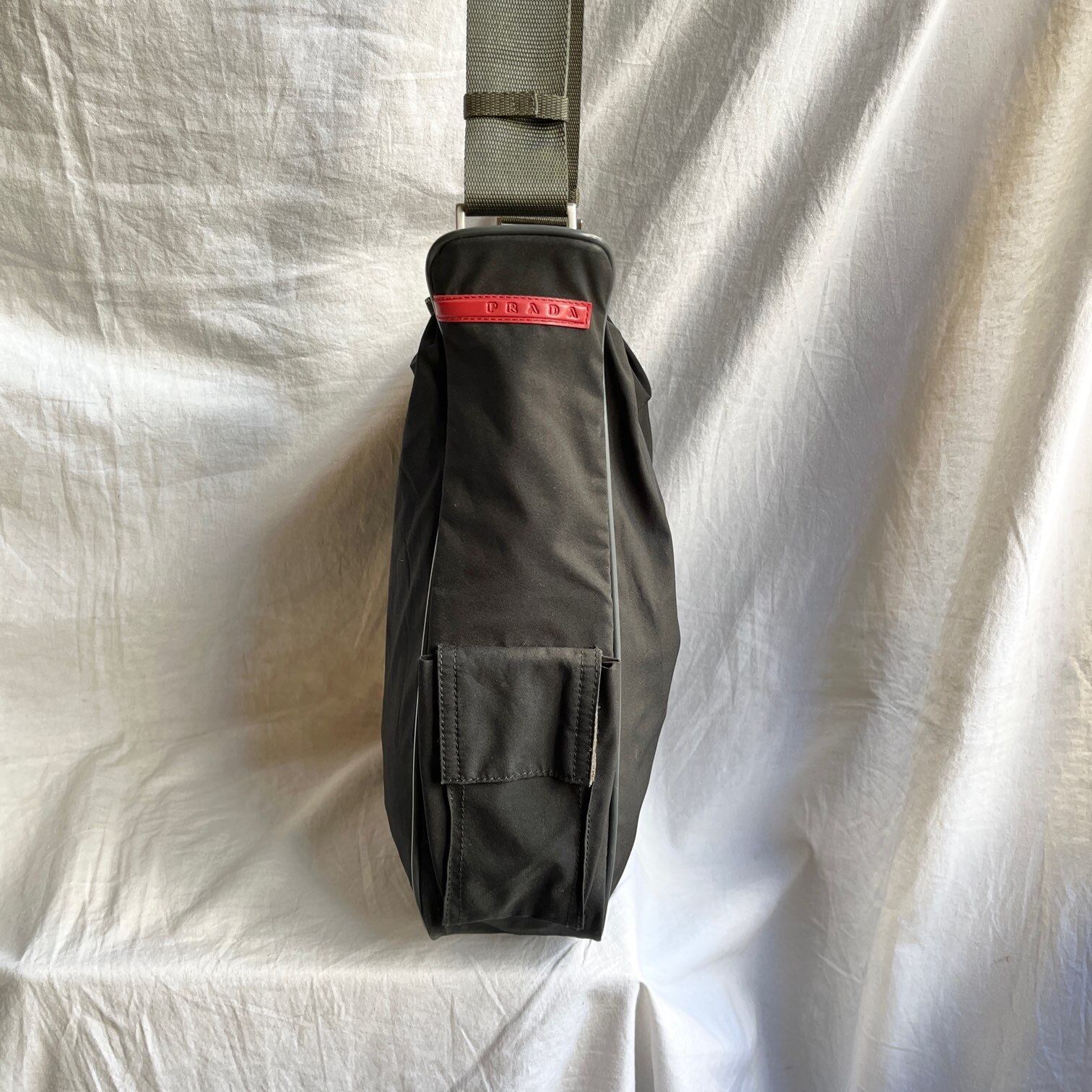 大きめサイズが嬉しいPRADA Sportsナイロンショルダーバッグ。マニッシュなマットブラックとグレーに赤タグのコントラストがスタイリッシュでモードな雰囲気。