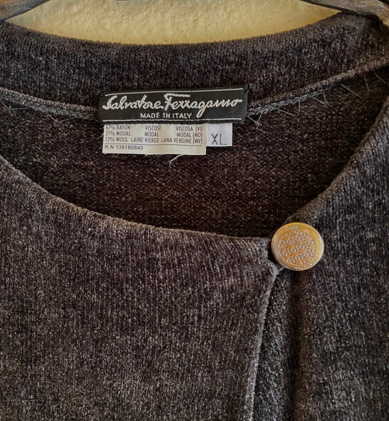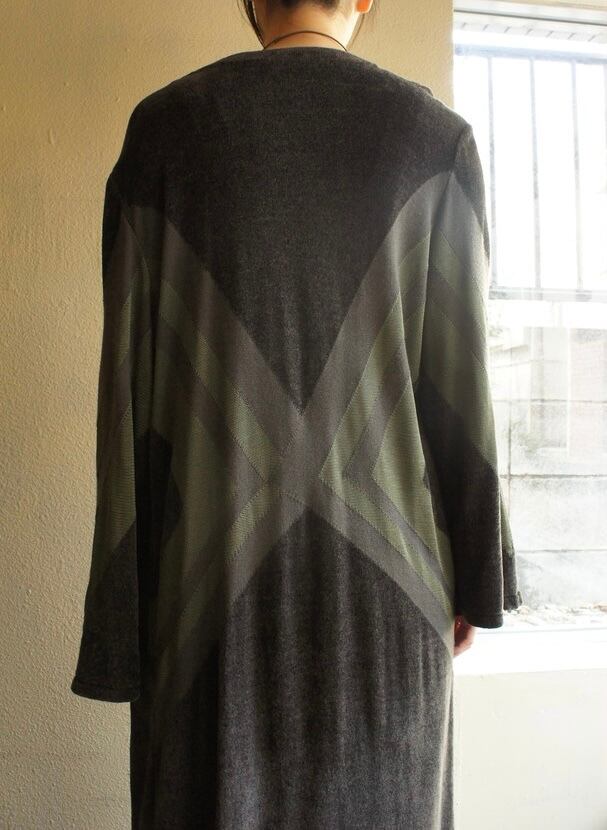 グレー×グリーンの繊細なサマーニット織りと、サマーベロア の異素材ニットデザインがアクセントに効いたFerragamoロングカーディガン。