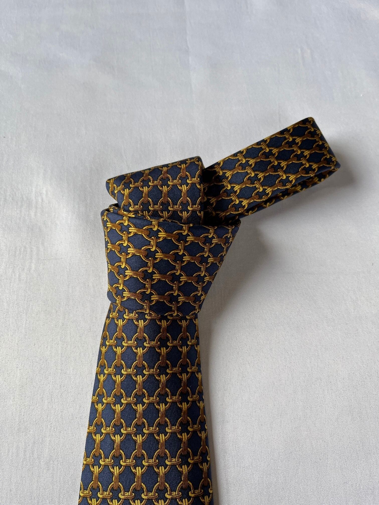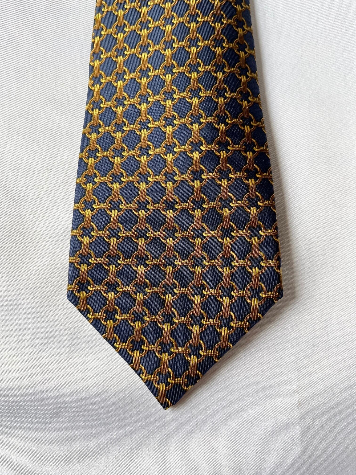 Hermes “Chain Pattern” Navy × Gold Silk Tie
