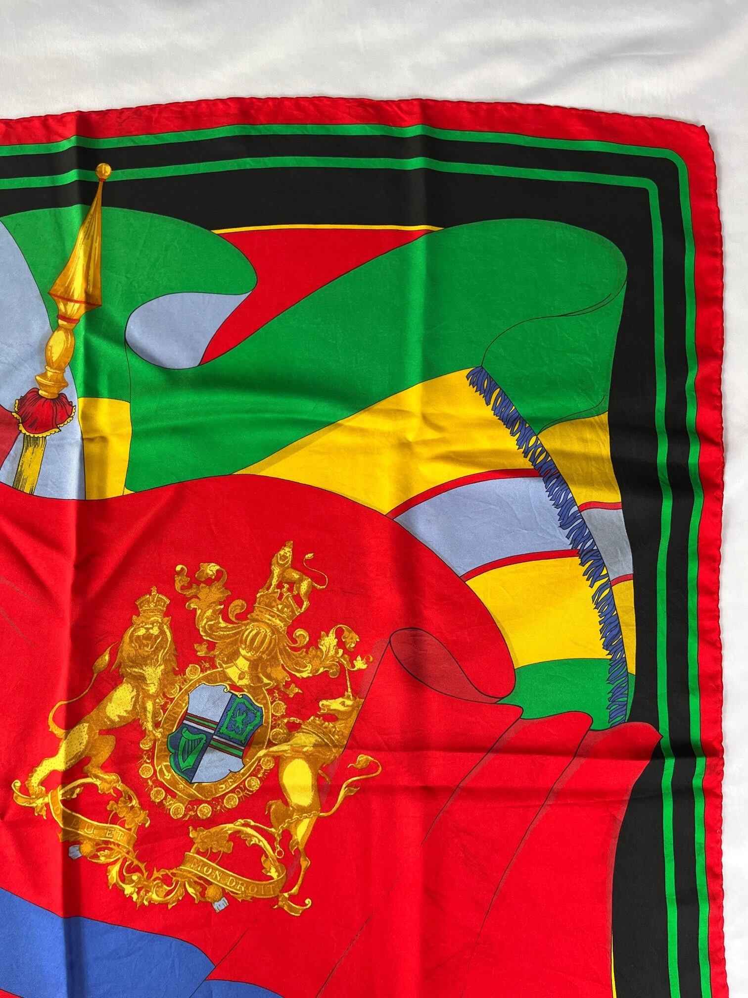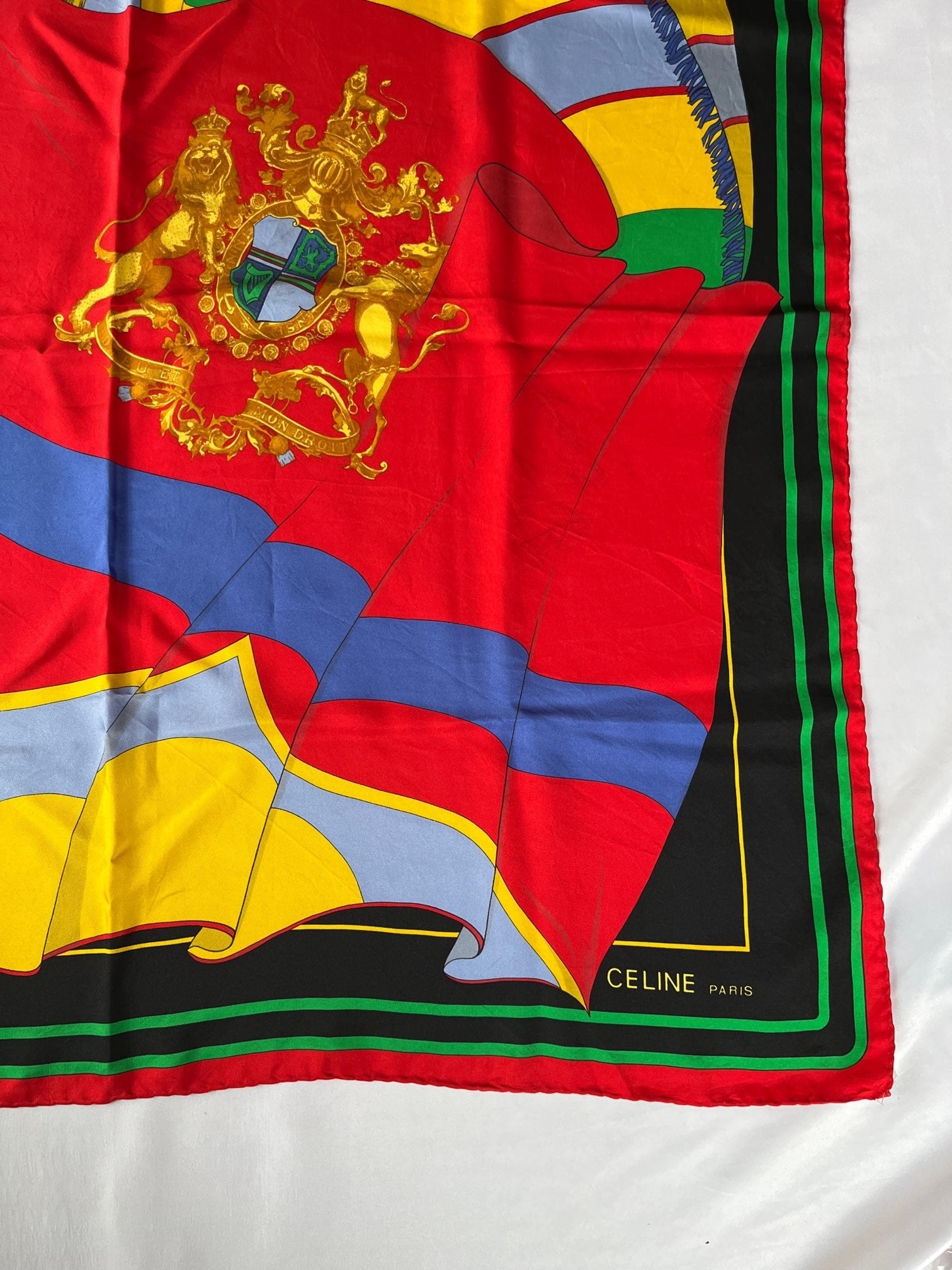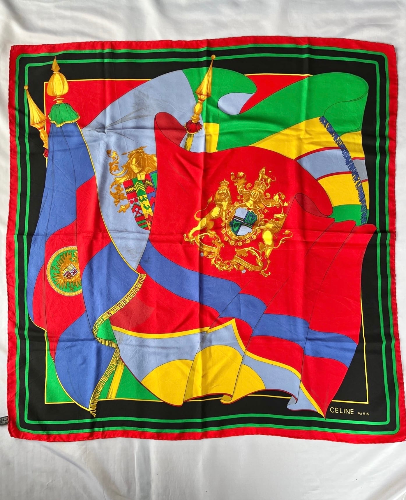 マルチカラーのフラッグモチーフが潔く、目を惹くCELINEヴィンテージスカーフ。中央にはイギリスの国章が描かれており、カラフルでポップな印象もありながら迫力のある一点。コーディネートを華やかに彩ってくれる一点です☆