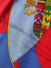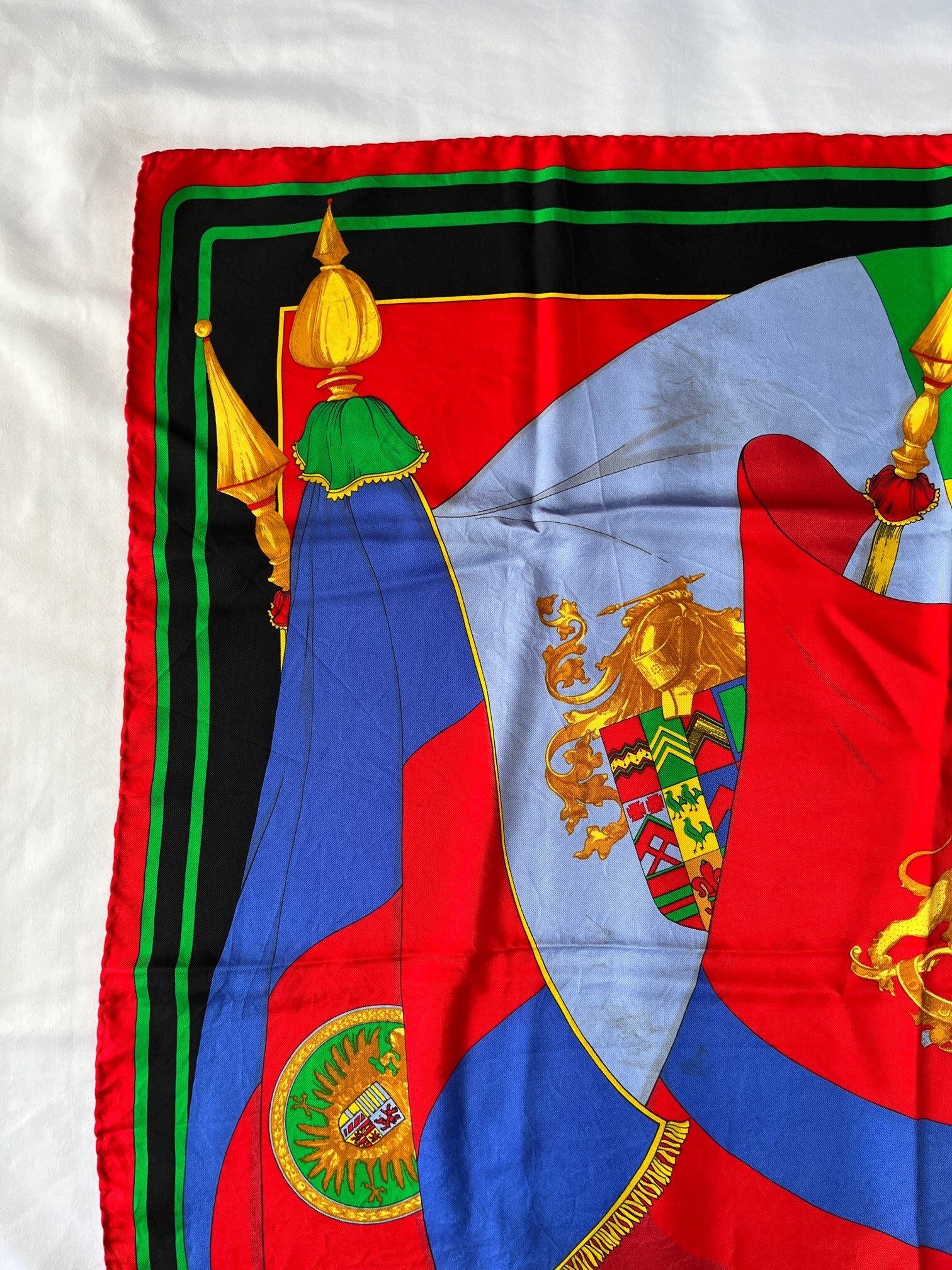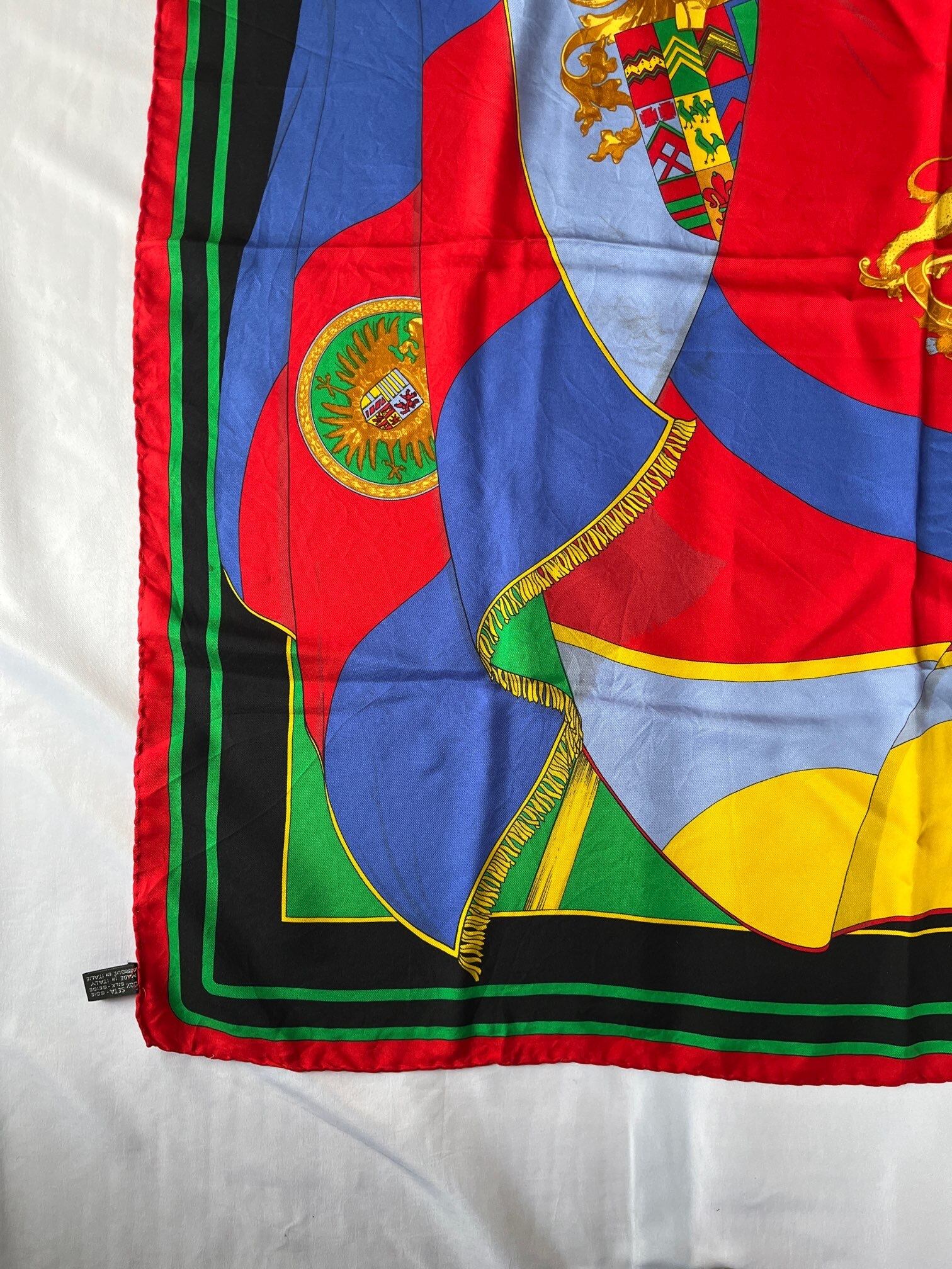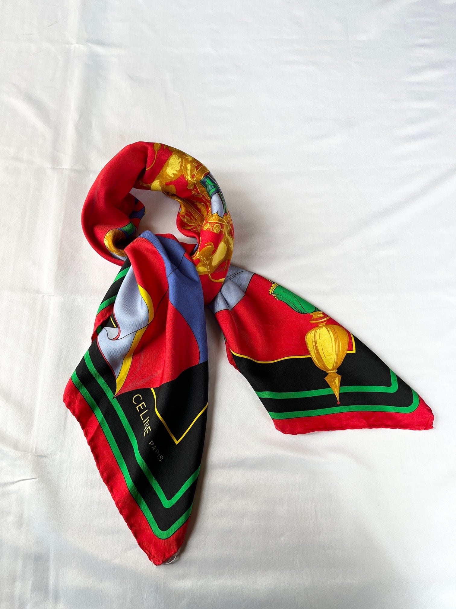 マルチカラーのフラッグモチーフが潔く、目を惹くCELINEヴィンテージスカーフ。中央にはイギリスの国章が描かれており、カラフルでポップな印象もありながら迫力のある一点。コーディネートを華やかに彩ってくれる一点です☆
