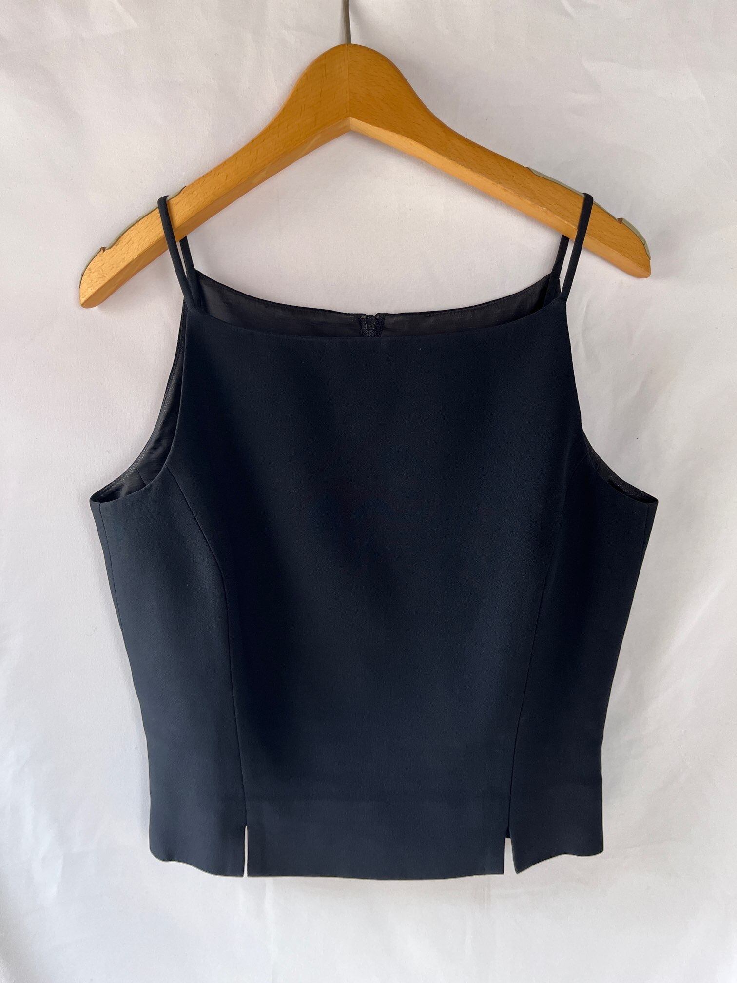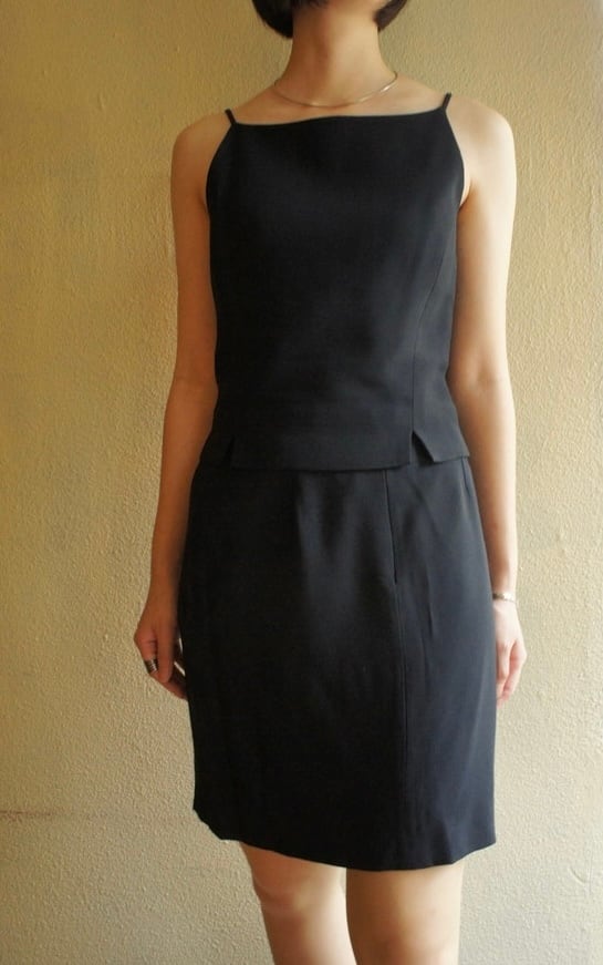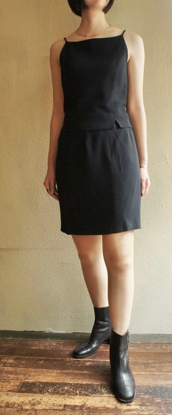 さらりとしたマットな質感が高級感のある生地。クロップド丈のキャミトップスにミニスカート、ロングJKTのバランス感が絶妙◎