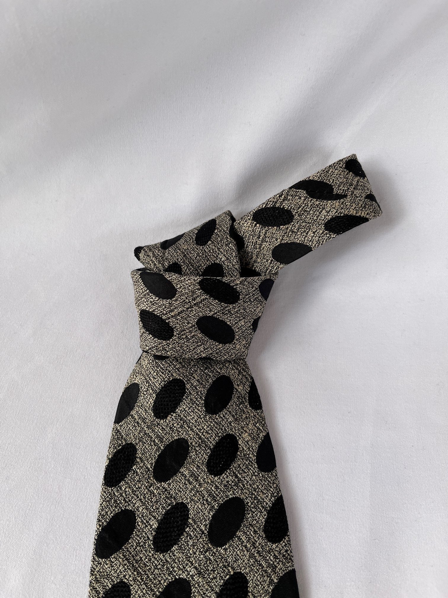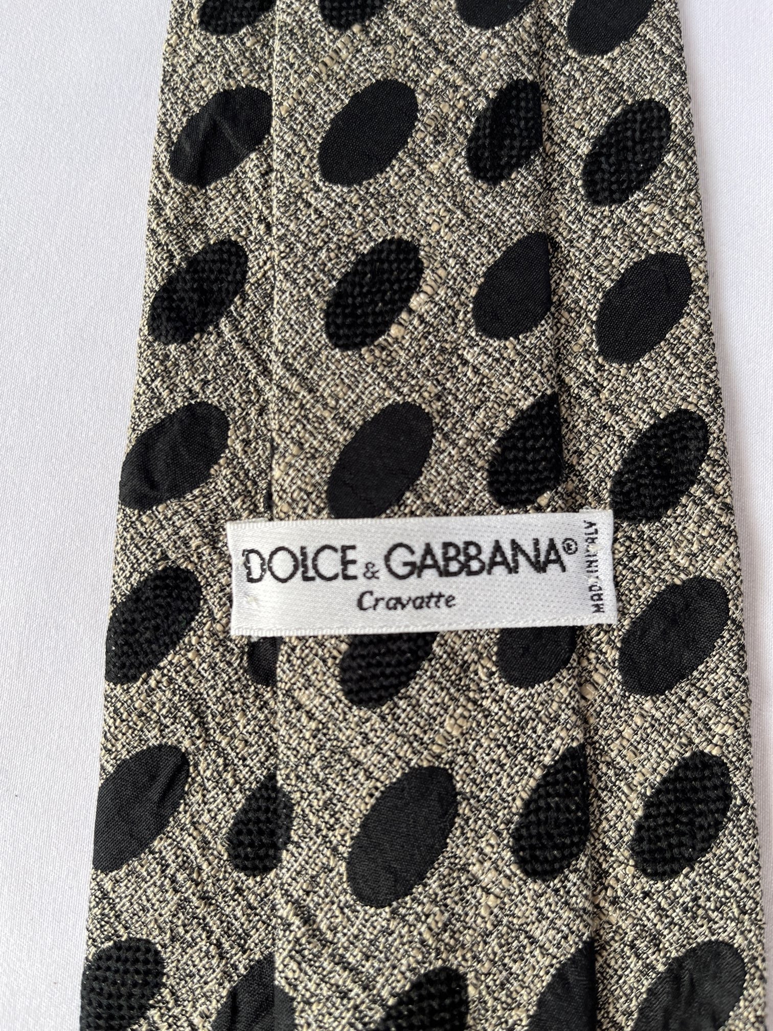 杢グレー地にBlackの楕円のドットがシックなD&G Vintage ネクタイ。織りデザインで凹凸のある生地感があたたかい印象☆裏にはcuteな女の子がプリントされています!