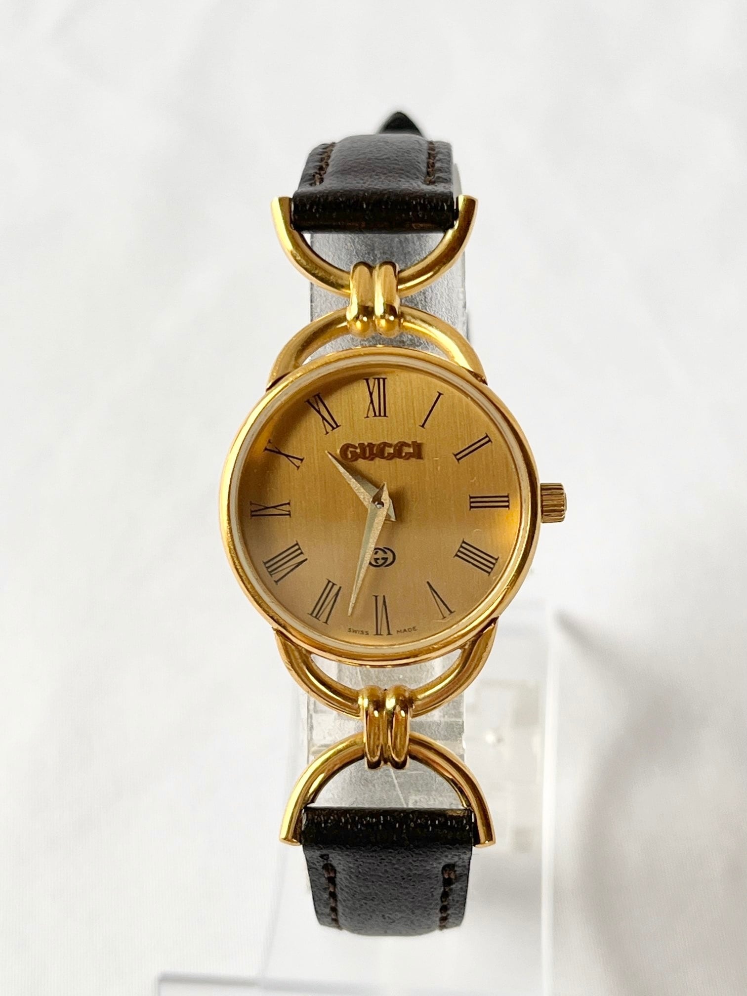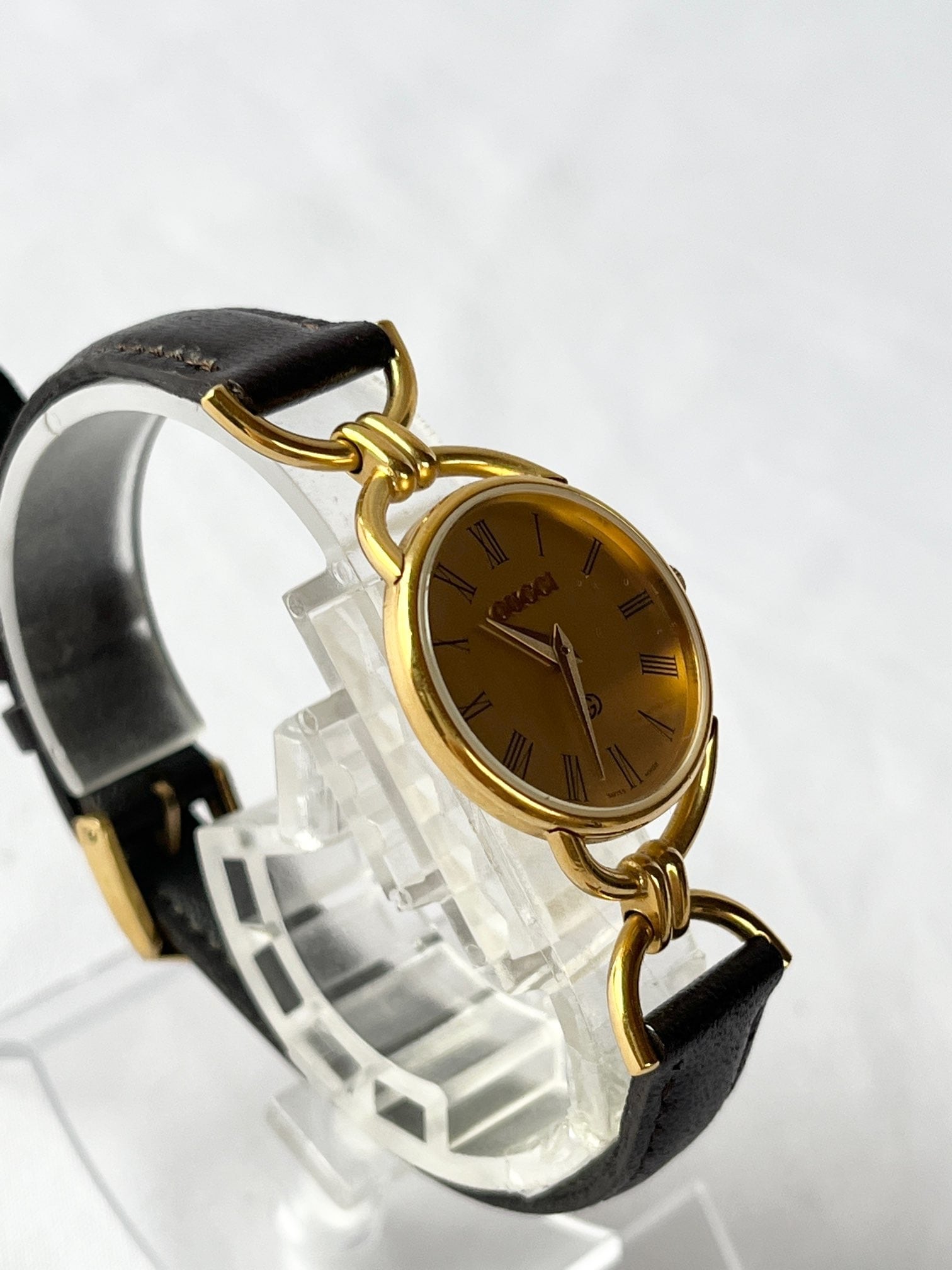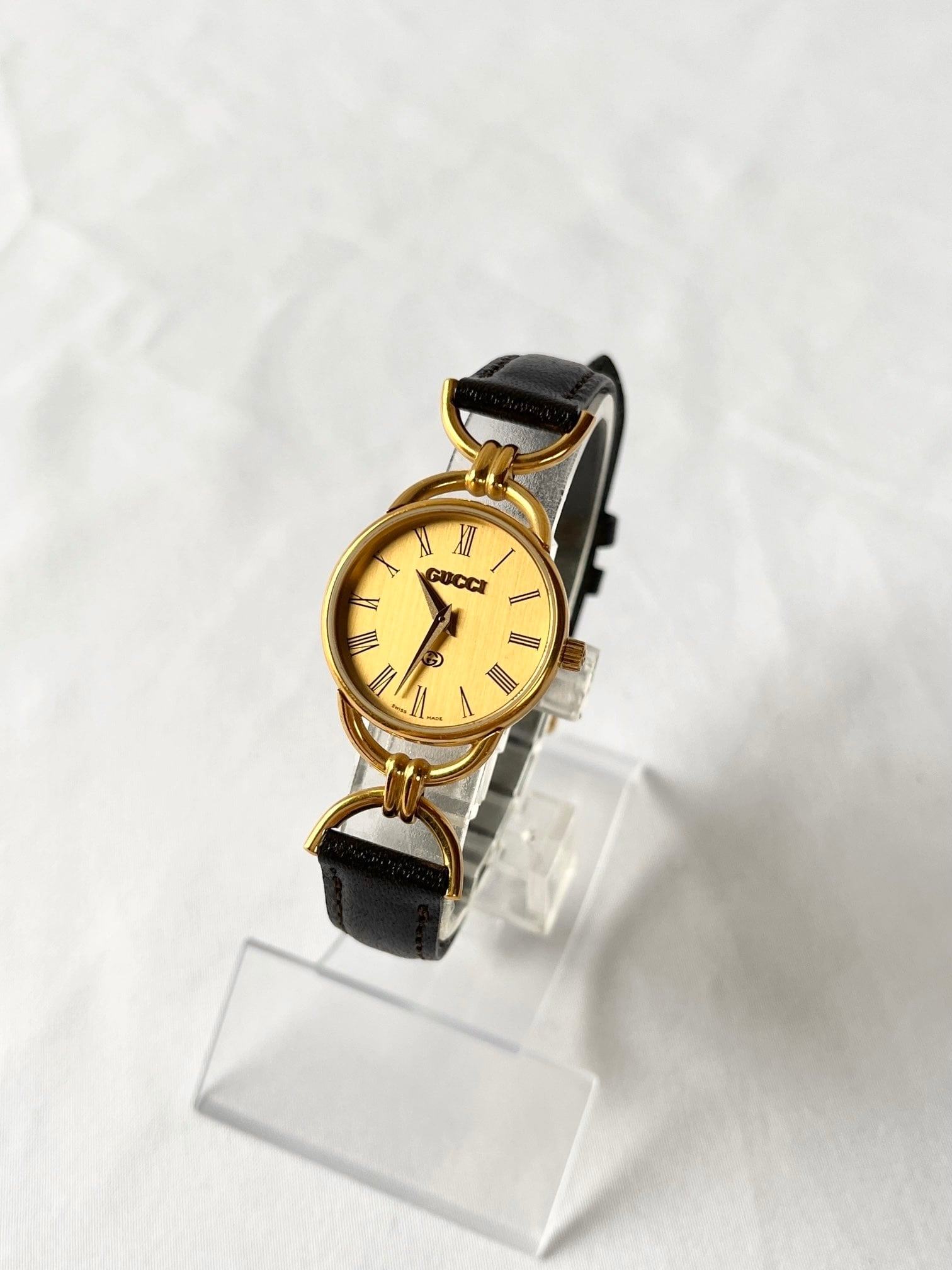 マットゴールドの色味が上品なGUCCI Vintageウォッチ。ベルト接続部のゴールドパーツも動きのあるデザイン☆DK Brownのレザーベルトとのコンビがクラシカルな一品です。