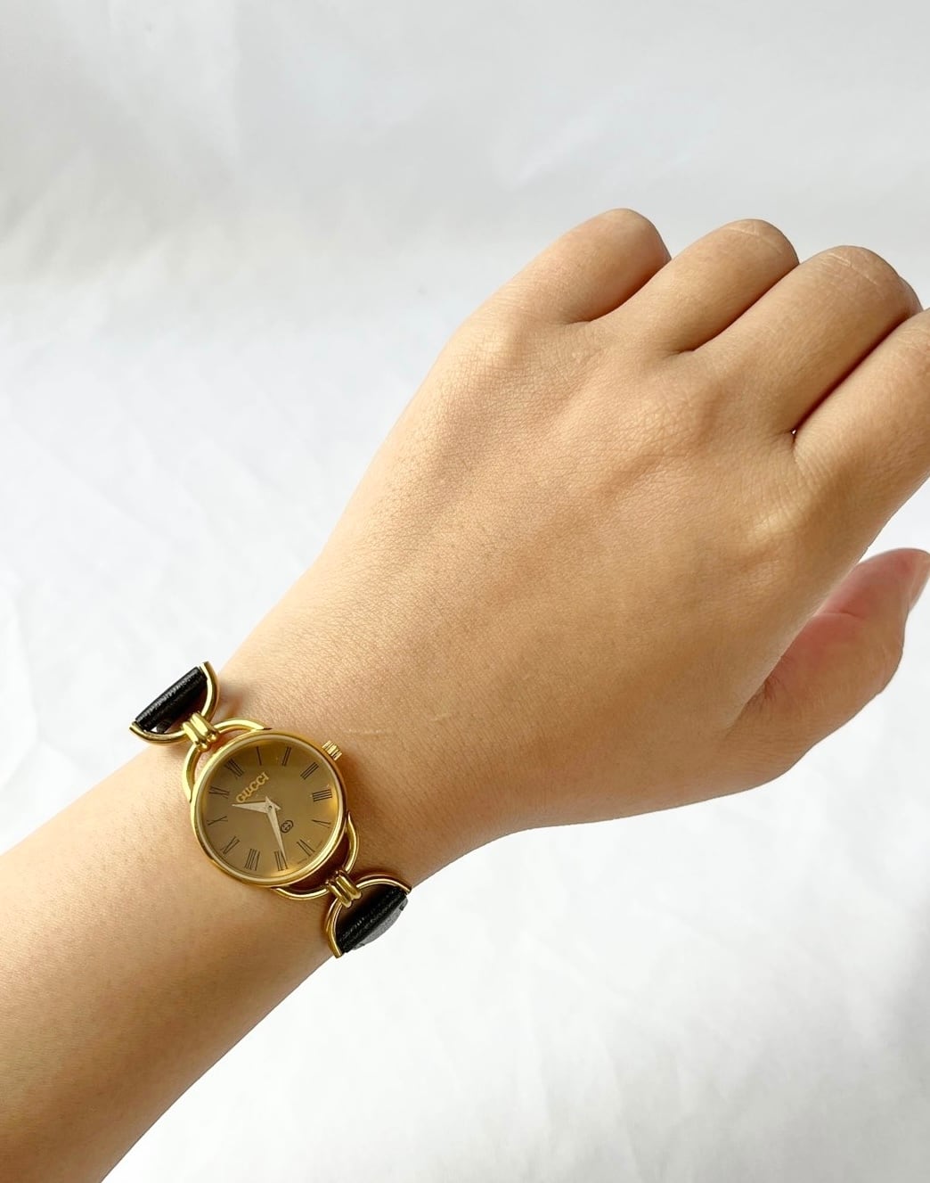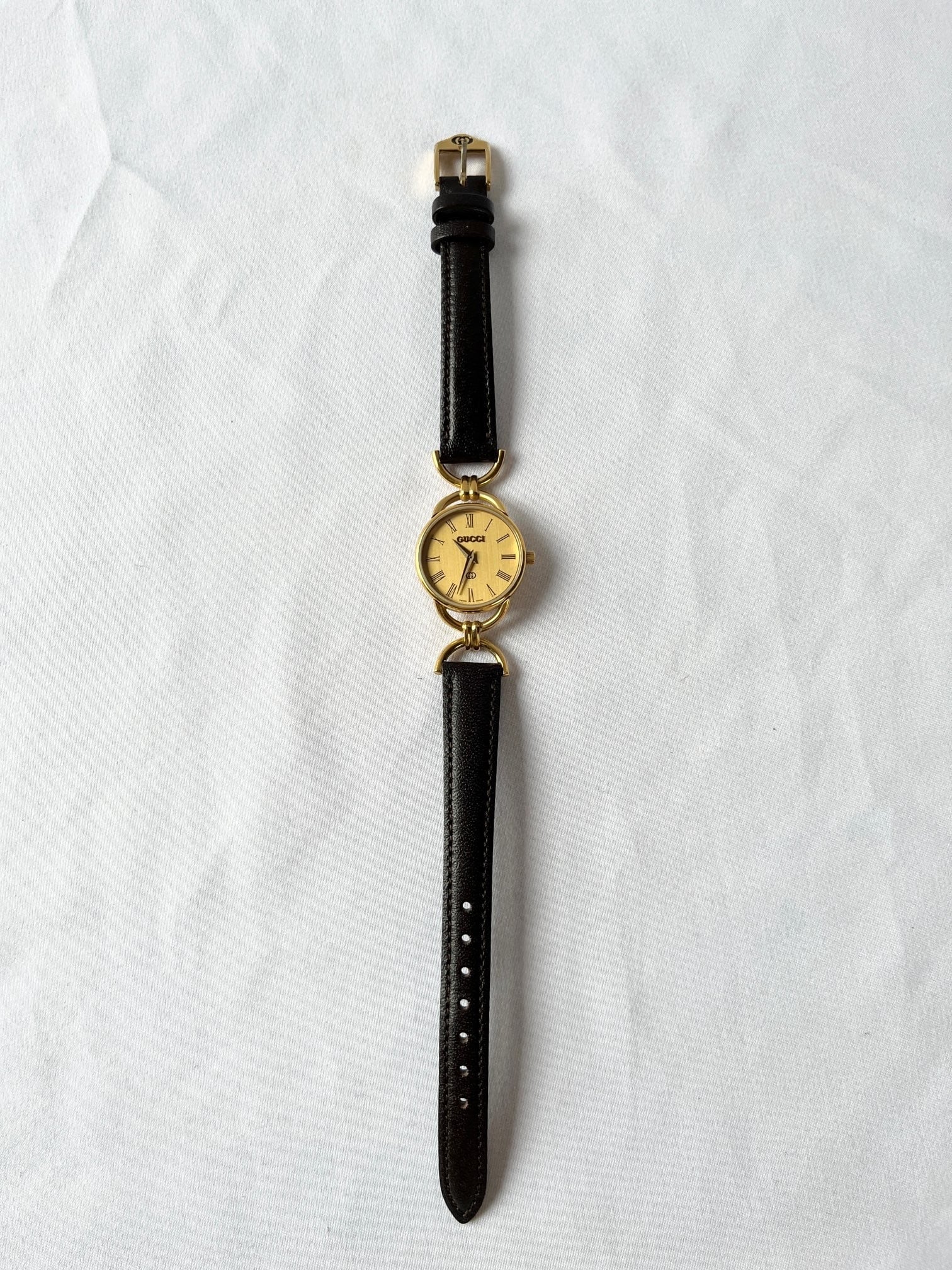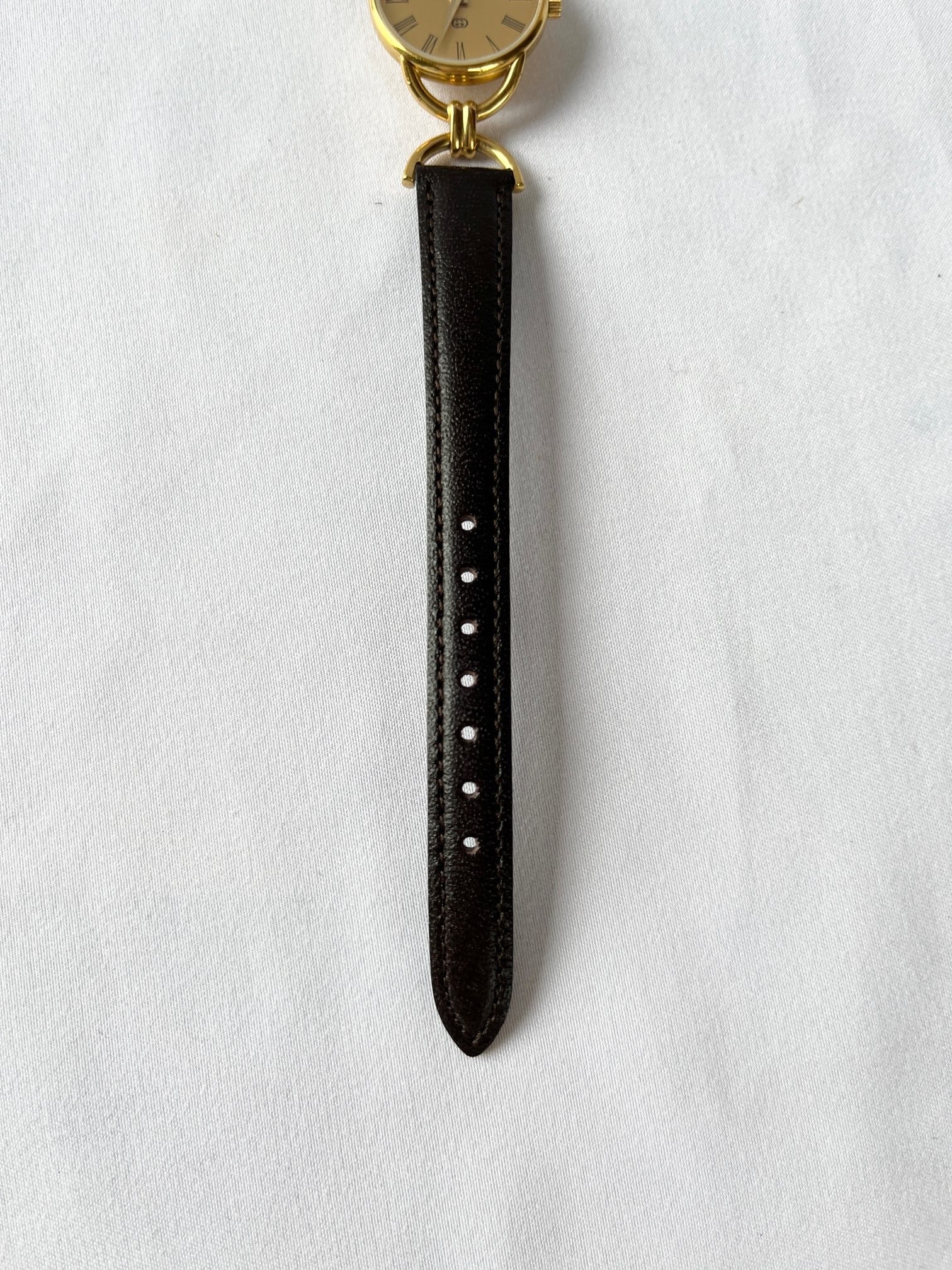 マットゴールドの色味が上品なGUCCI Vintageウォッチ。ベルト接続部のゴールドパーツも動きのあるデザイン☆DK Brownのレザーベルトとのコンビがクラシカルな一品です。