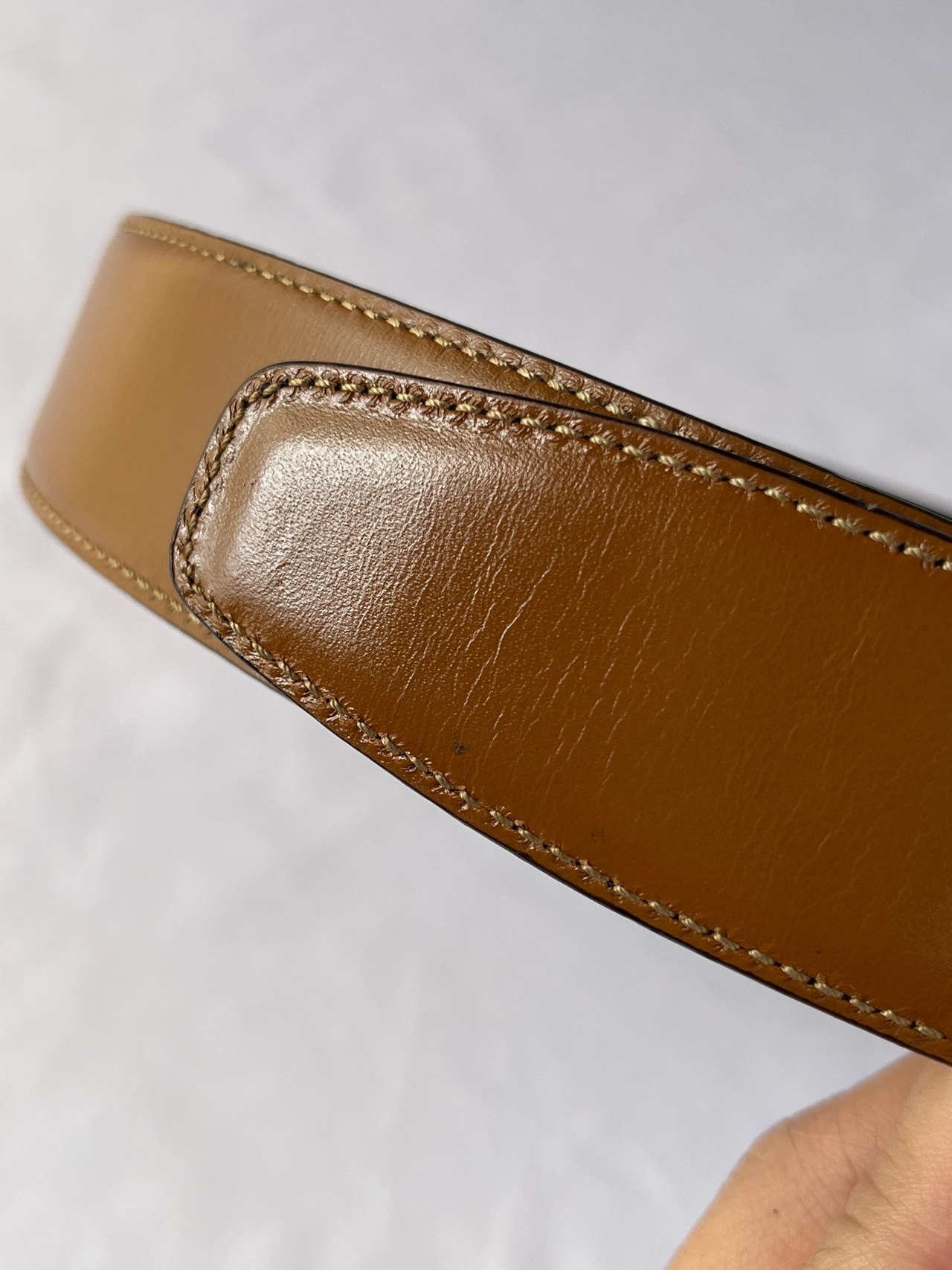 ゴールドのGロゴバックルがエレガントなGUCCI 80's vintageベルト。Lt.Brown とBlackのリバーシブルになっていて、機能性も高いデザイン。しっかりとした厚みのあるレザーで高級感のある一品です。