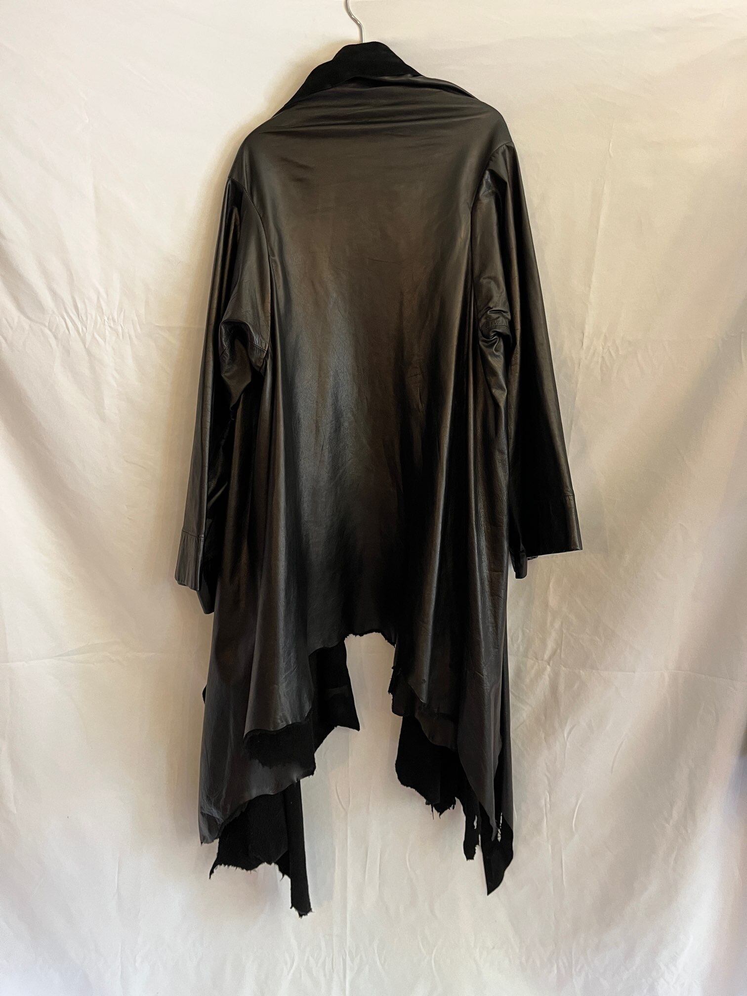 ベルギーのブランドJEANPAUL KNOTTのレザーコート。切りっぱなしデザインがモードな一枚!ワイドなアームがゴシックな雰囲気...ボタンで止められた裾やダメージをぬったようなデザインが遊び心もあります。