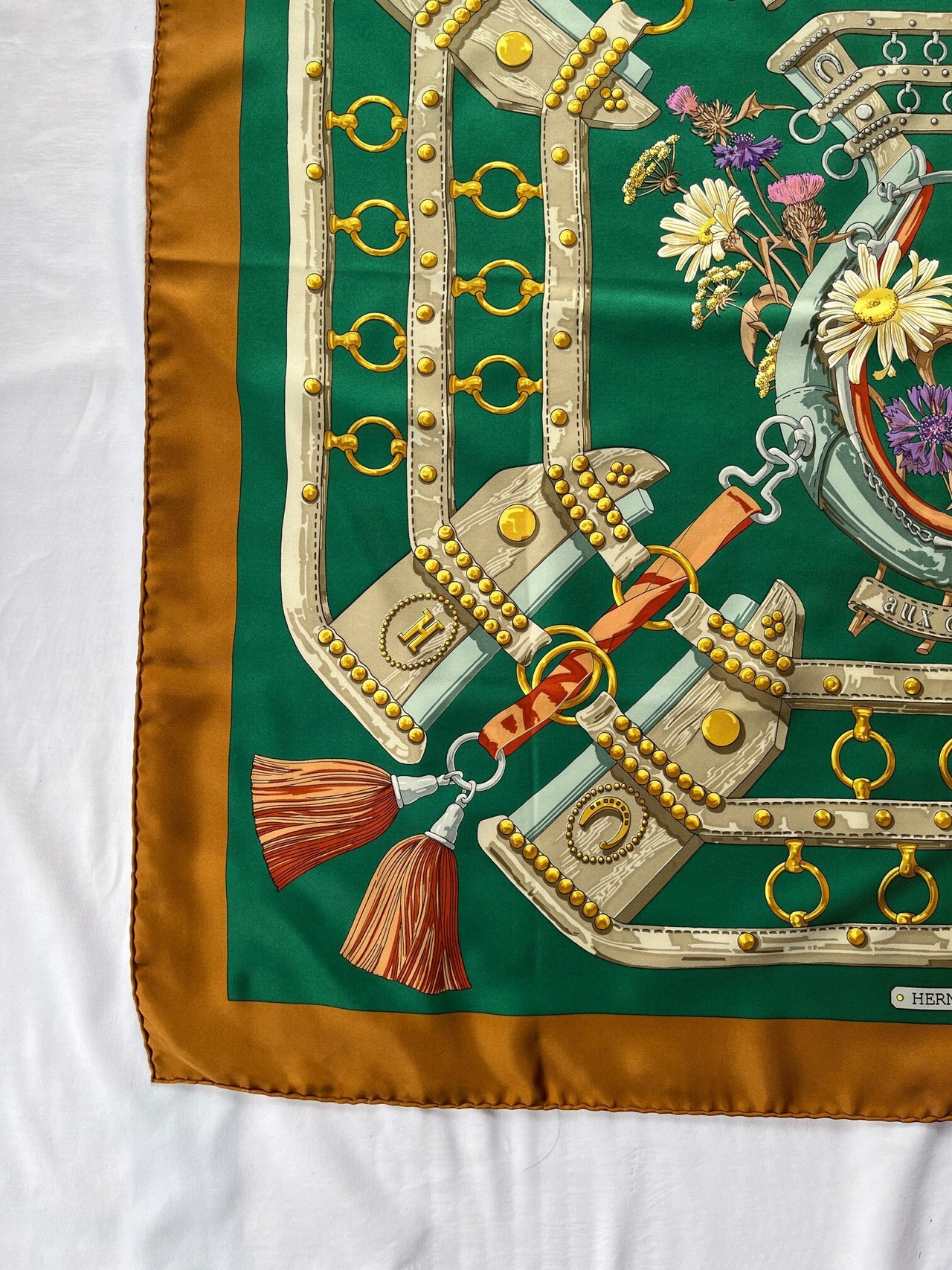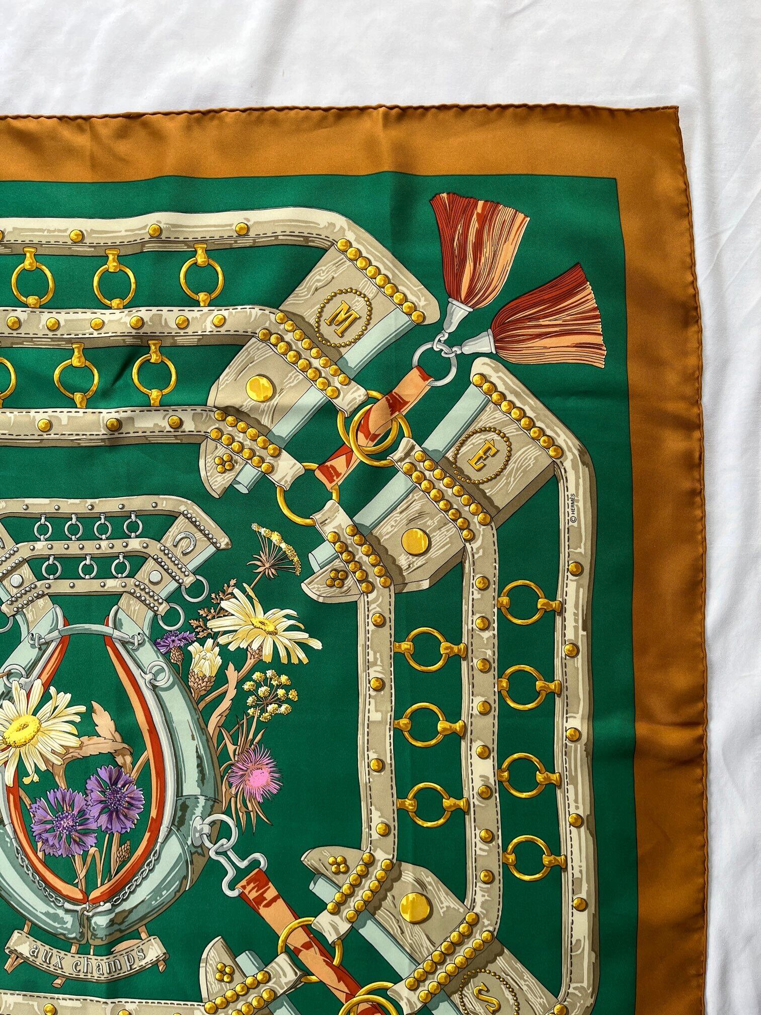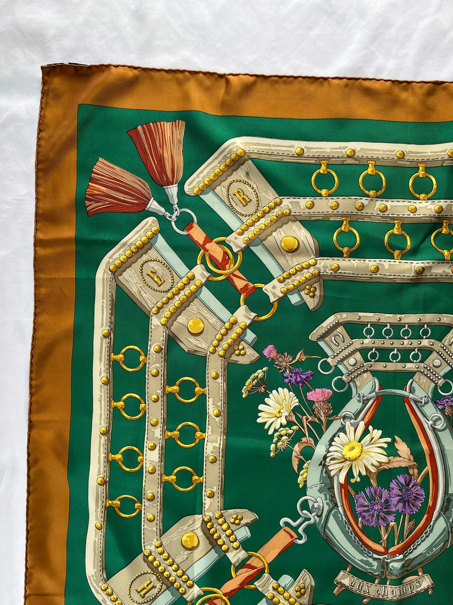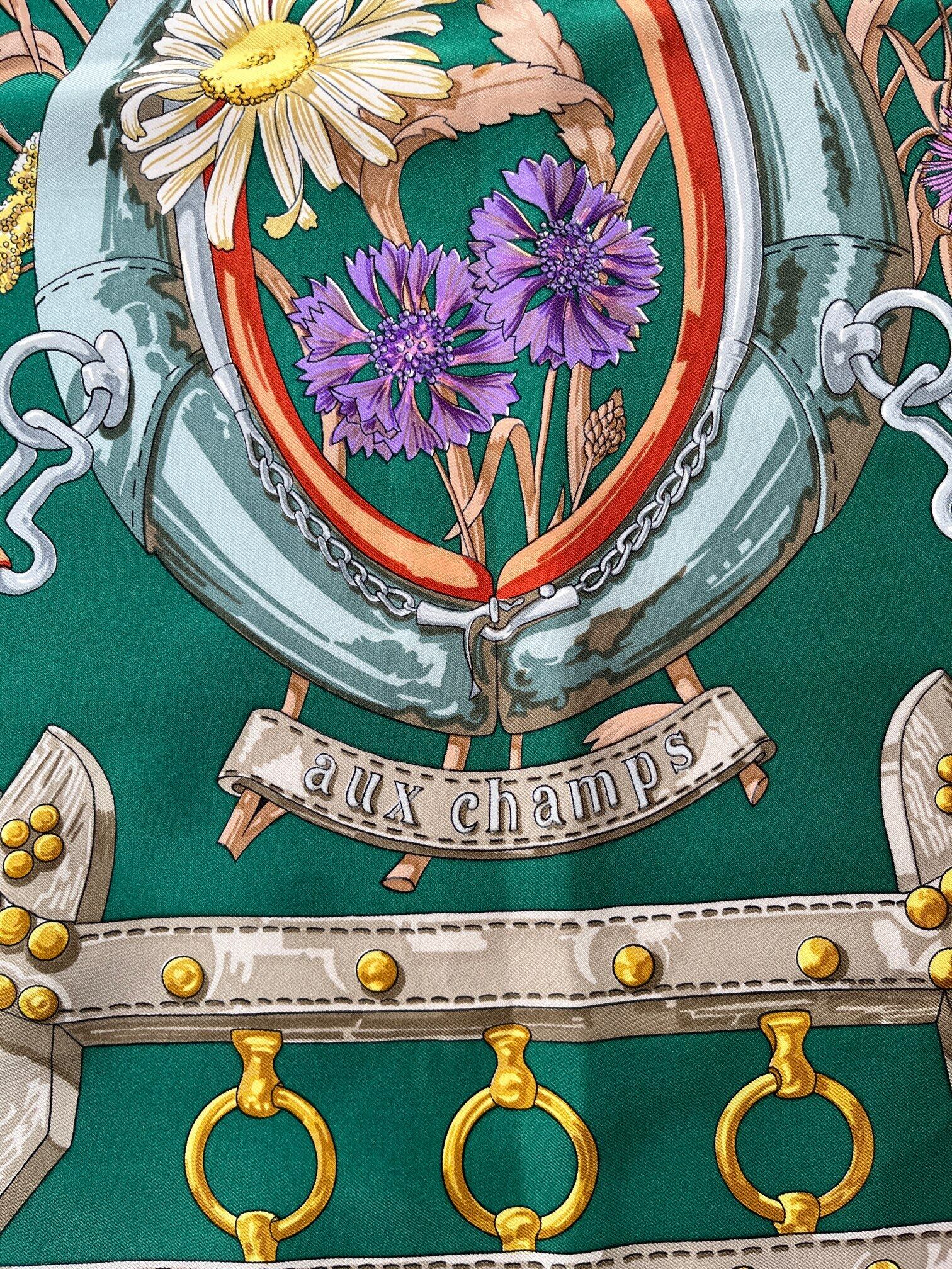 HERMES “Aux Champs”スカーフ。〈馬場で〉というテーマで作られたHERMESスカーフの名作。センターの馬蹄や全体に施された馬具がHERMESらしいエッセンス。グリーンとブラウンのコンビにパステルカラーの花々が美しく映える一枚です。