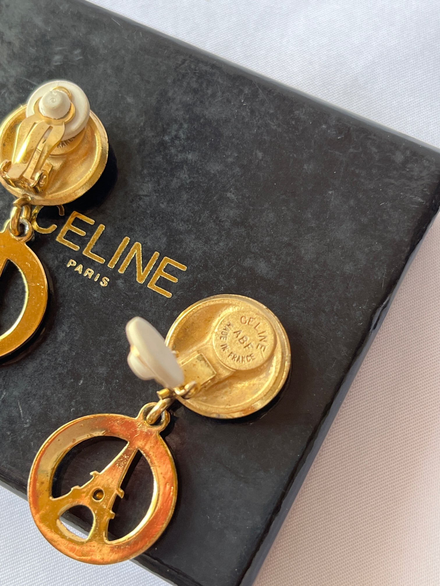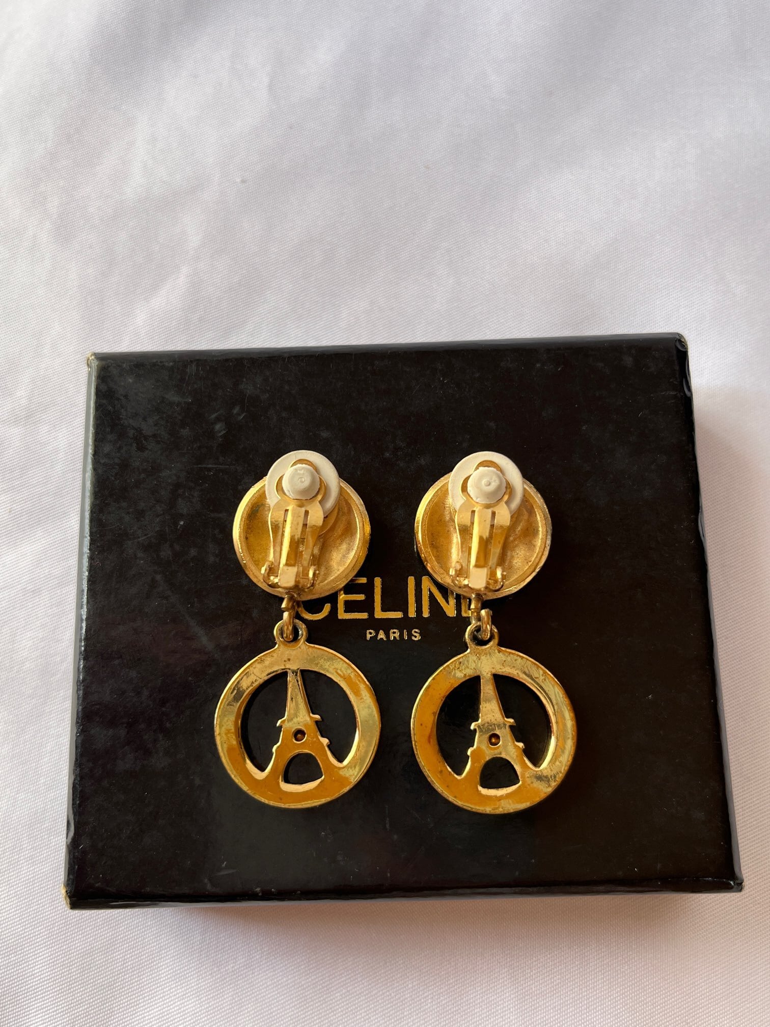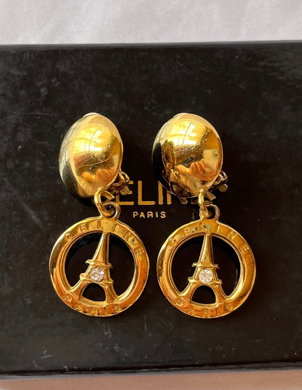 ラウンドのゴールドメタルにぶら下がるエッフェル塔がfranchブランドらしいCeline vintage イヤリング。きらめく一粒のラインストーンが光に当たるたび美しく輝きます。顔周りが一気に華やぐ一品です!