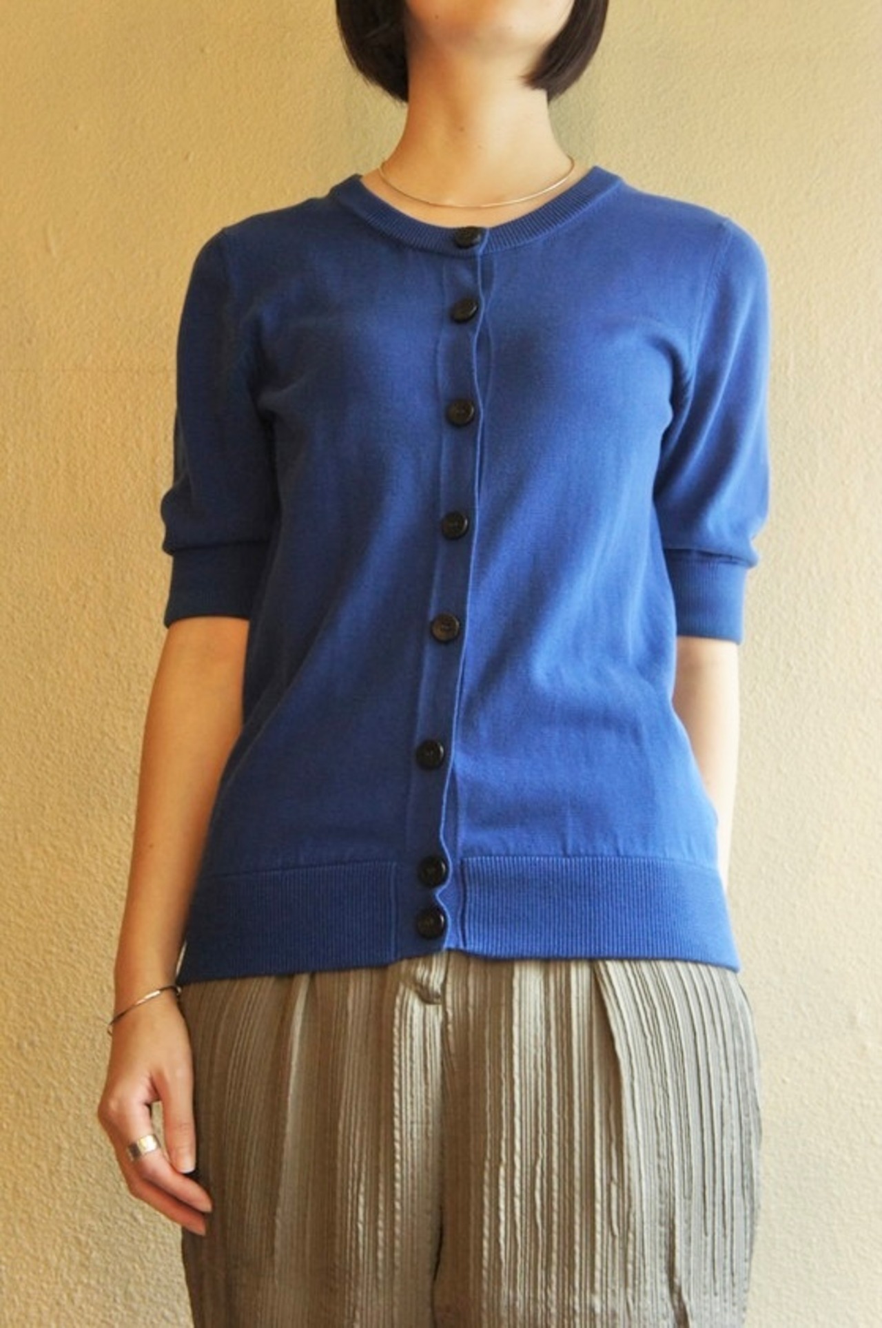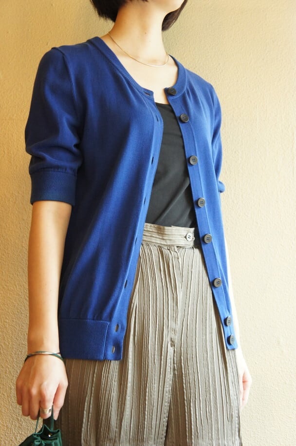 サックスブルーの色味が美しいHermesの半袖ニットカーディガン。