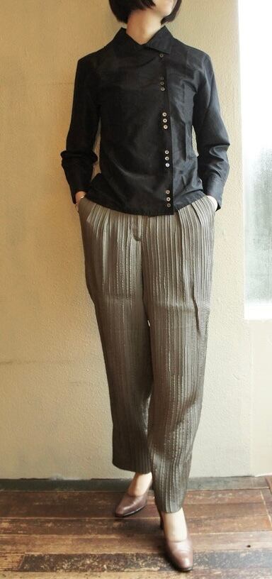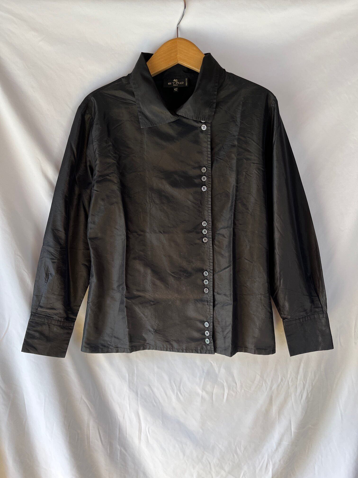 ボタンの配置がユニークなVintage ETROシャツ。艶のあるシルク素材で、シャカシャカとした生地感で着心地も◎