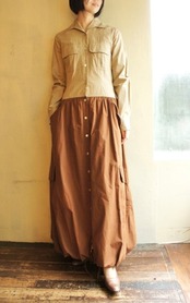 ベージュとブラウンのバイカラーが柔らかい印象のマキシ丈ワンピは、裾が絞れるタイプで、バルーンシルエットが可愛らしい一枚