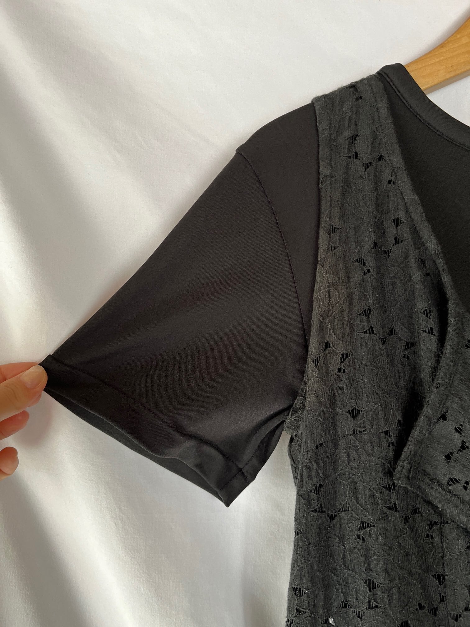 光沢のあるスポーティーな生地感の Tシャツに、繊細な花柄レースのコンビが映えるデザイン