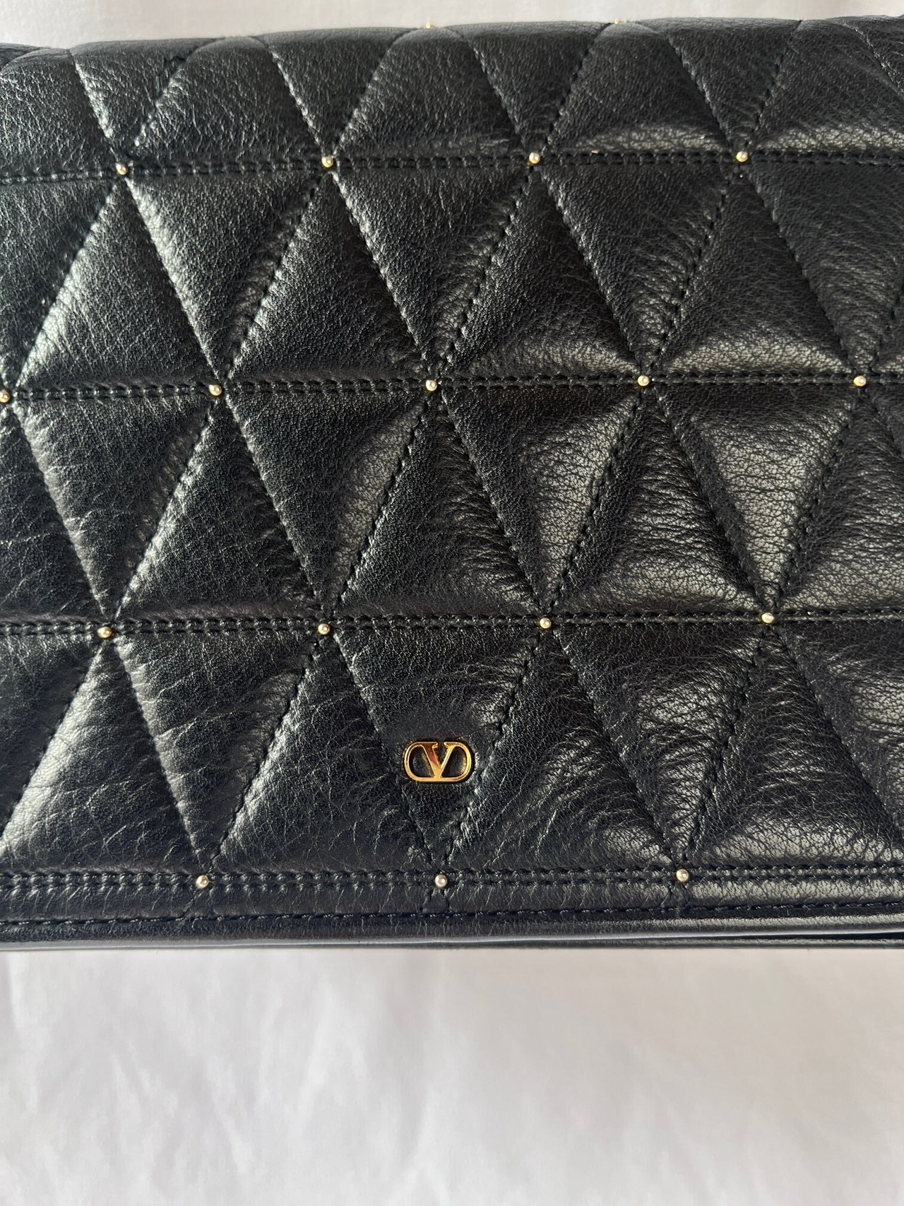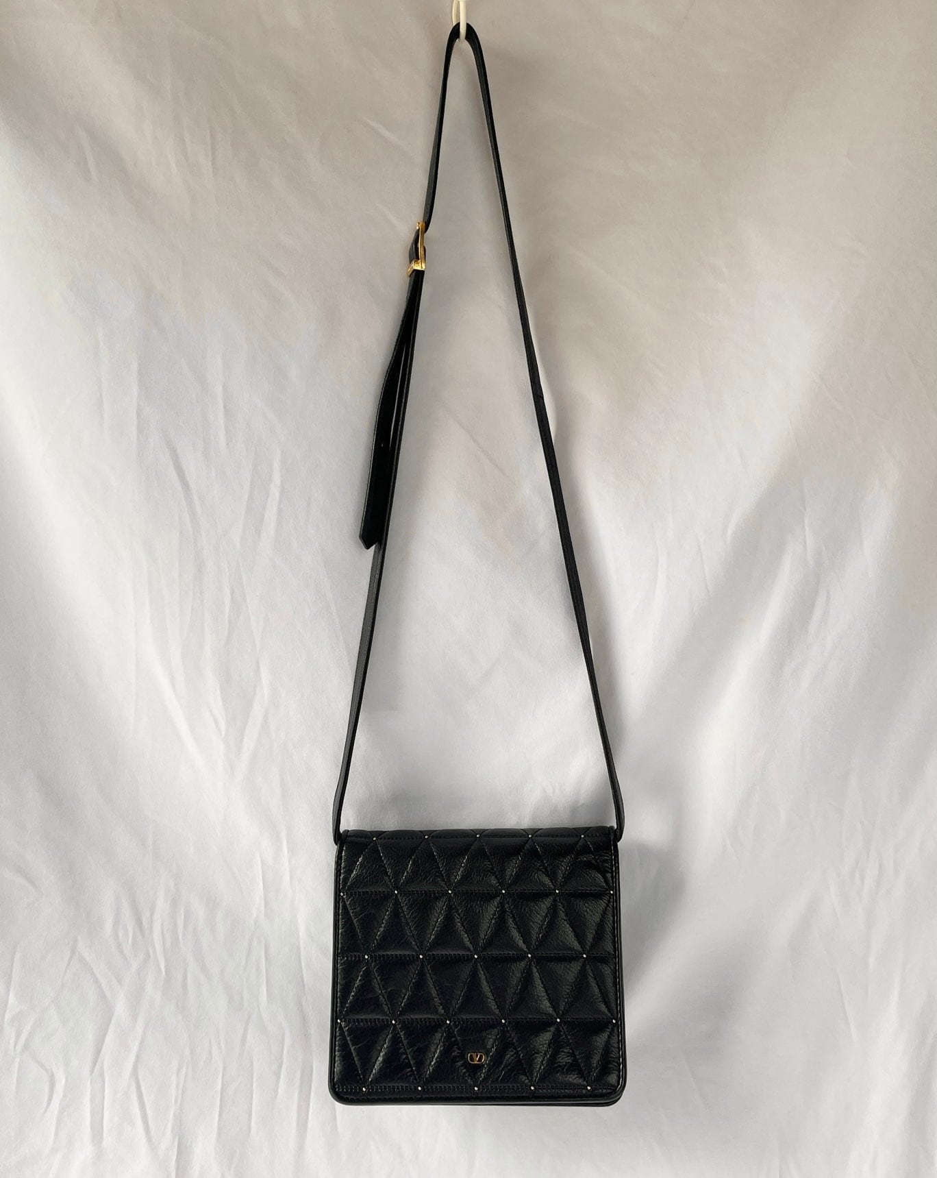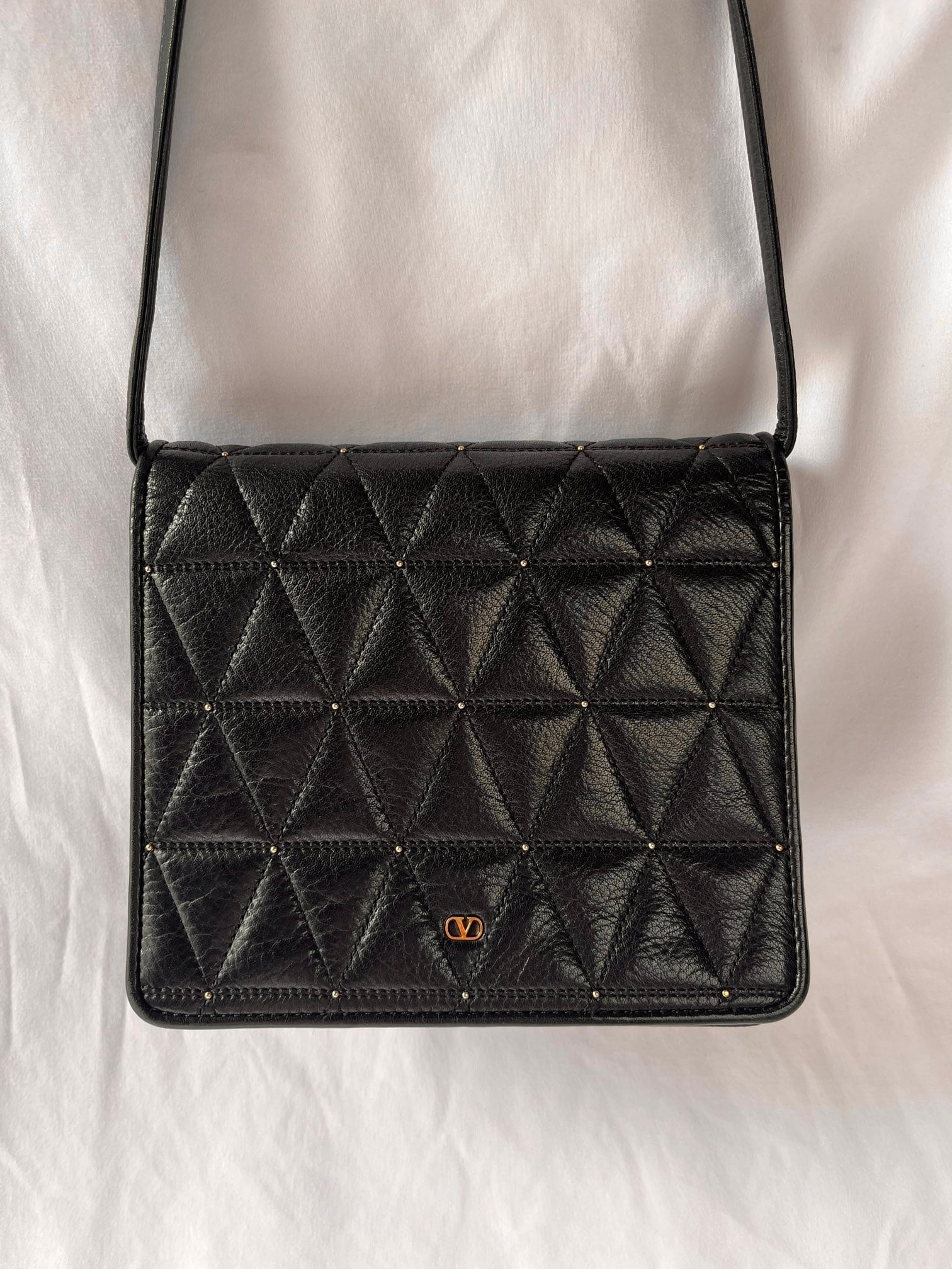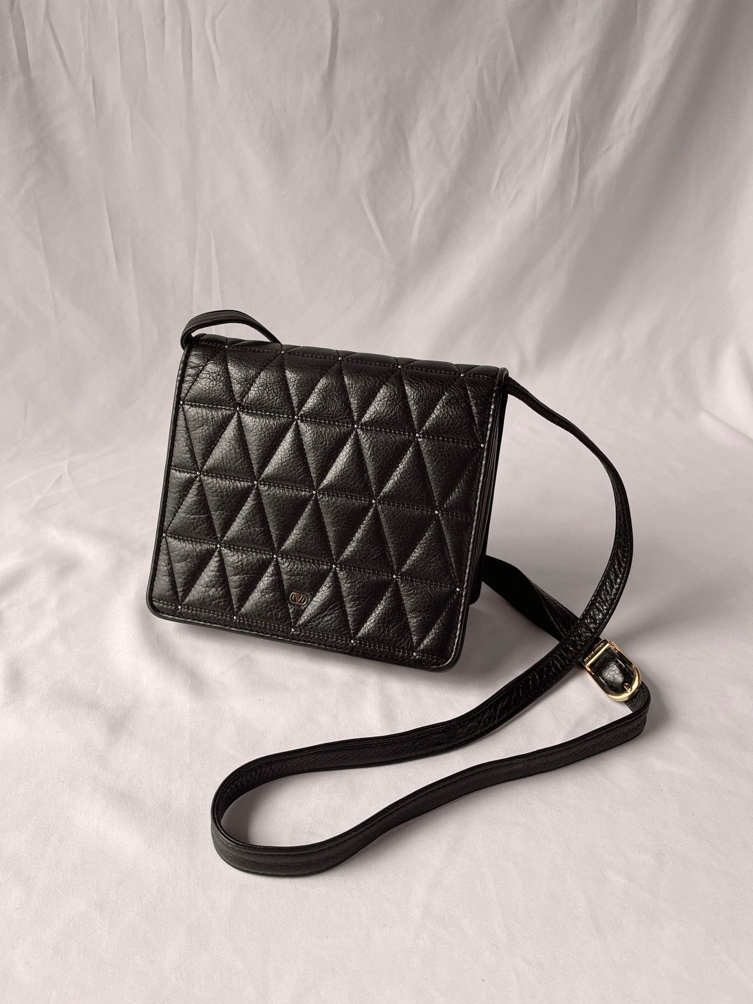 ブラックレザーの三角キルトに小さなスタッズデザインがアクセントに効いたvalentinoの vintageショルダーバッグ。