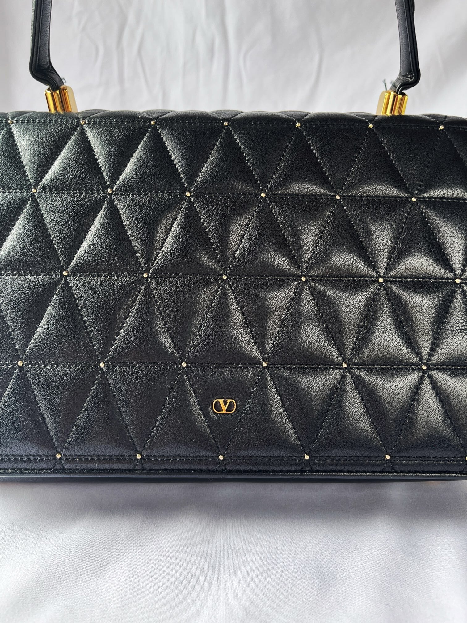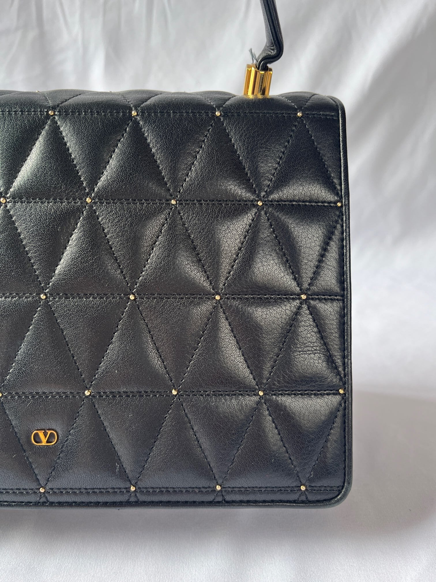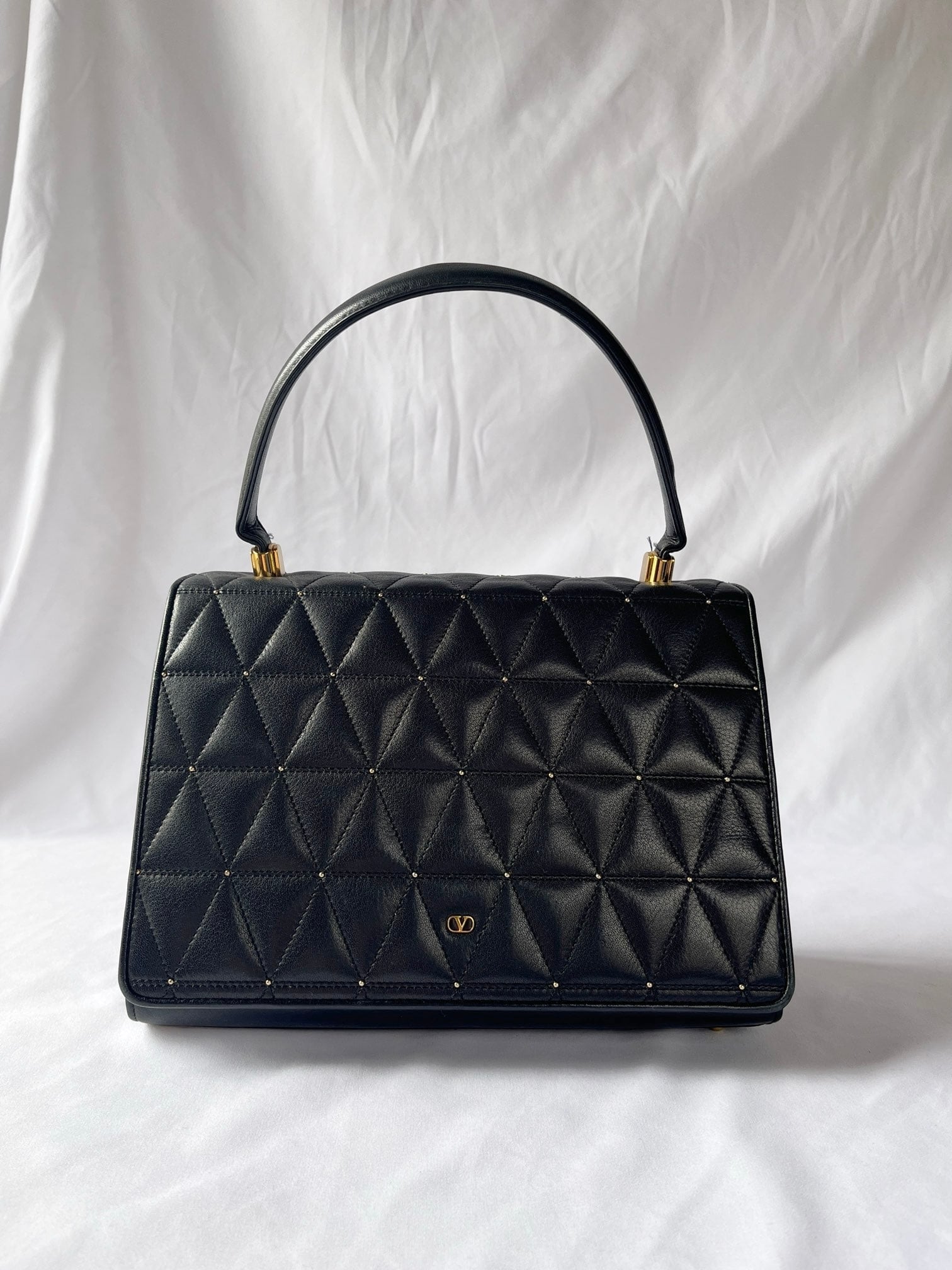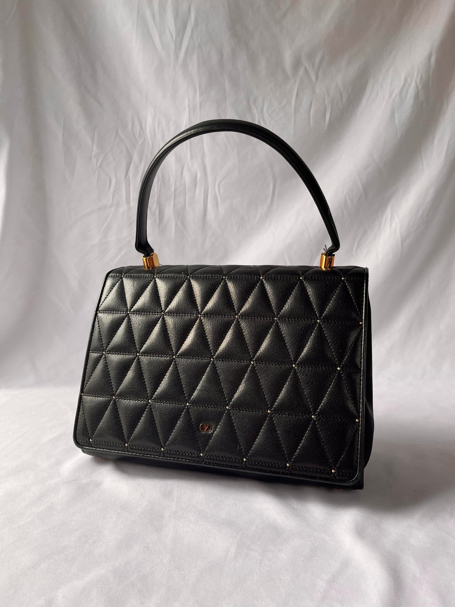 ブラックレザーの三角キルトに小さなスタッズデザインがアクセントに効いたvalentinoの vintageショルダーバッグ。