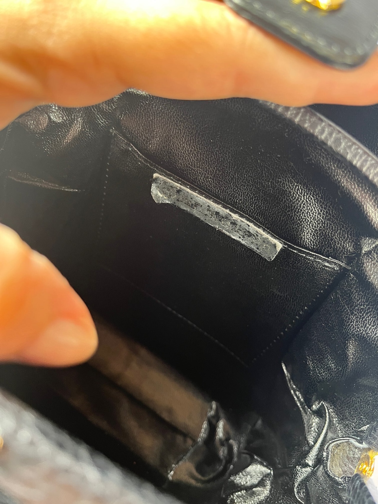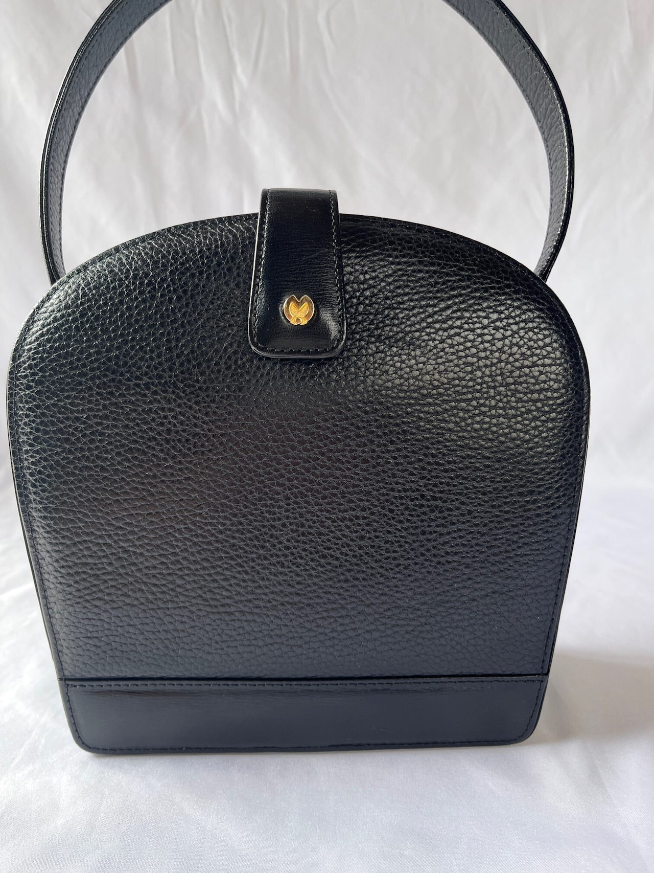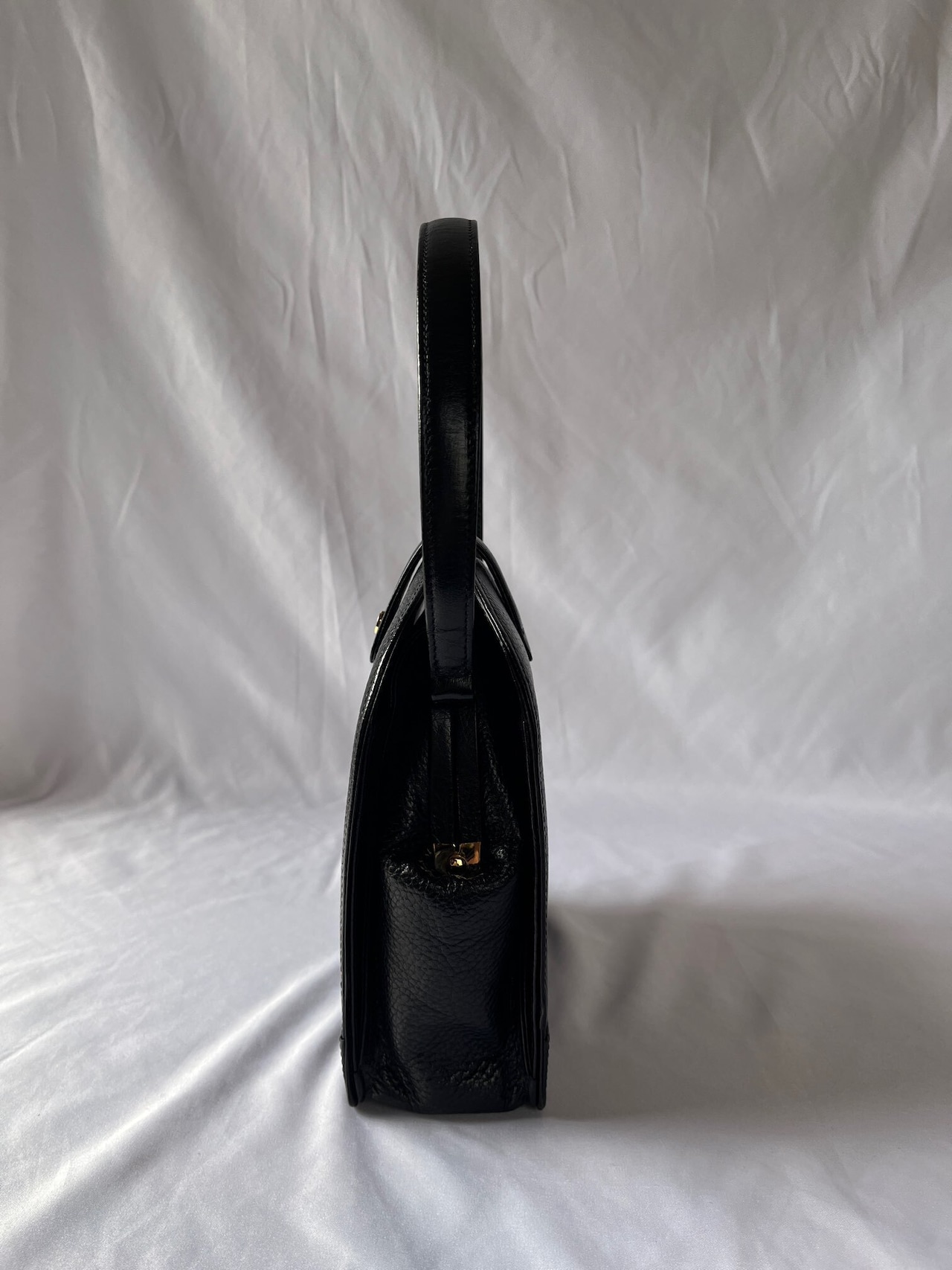 ブラックレザー地に小さなゴールドのメタルロゴが映えるデザイン。