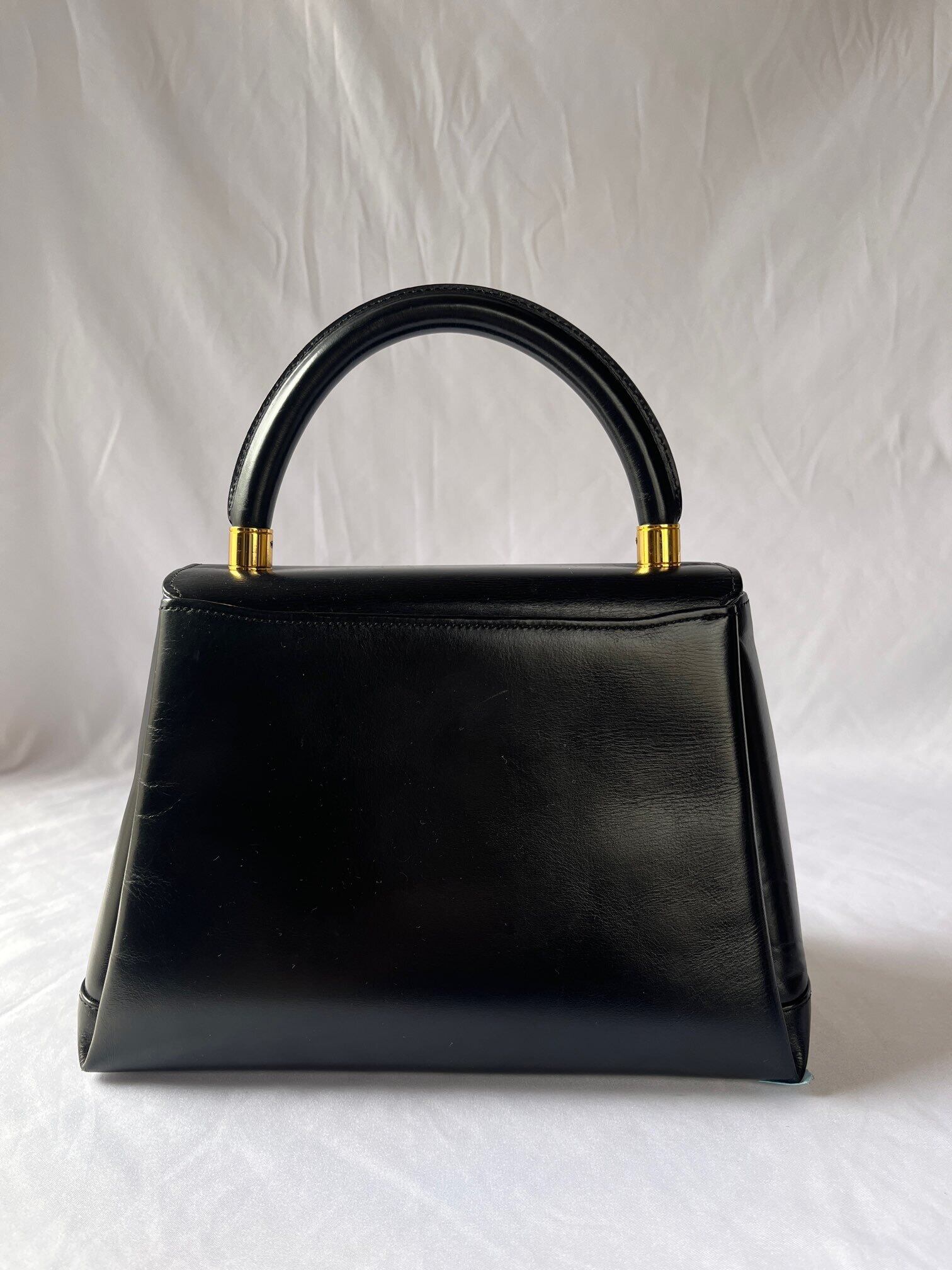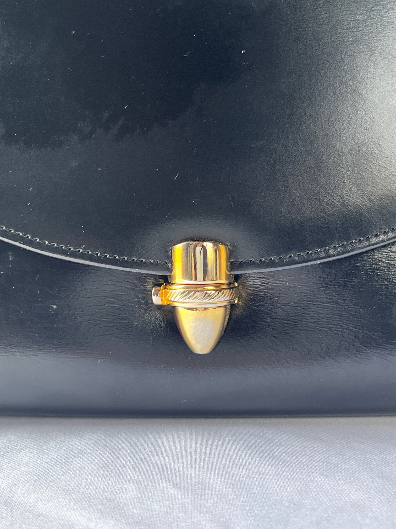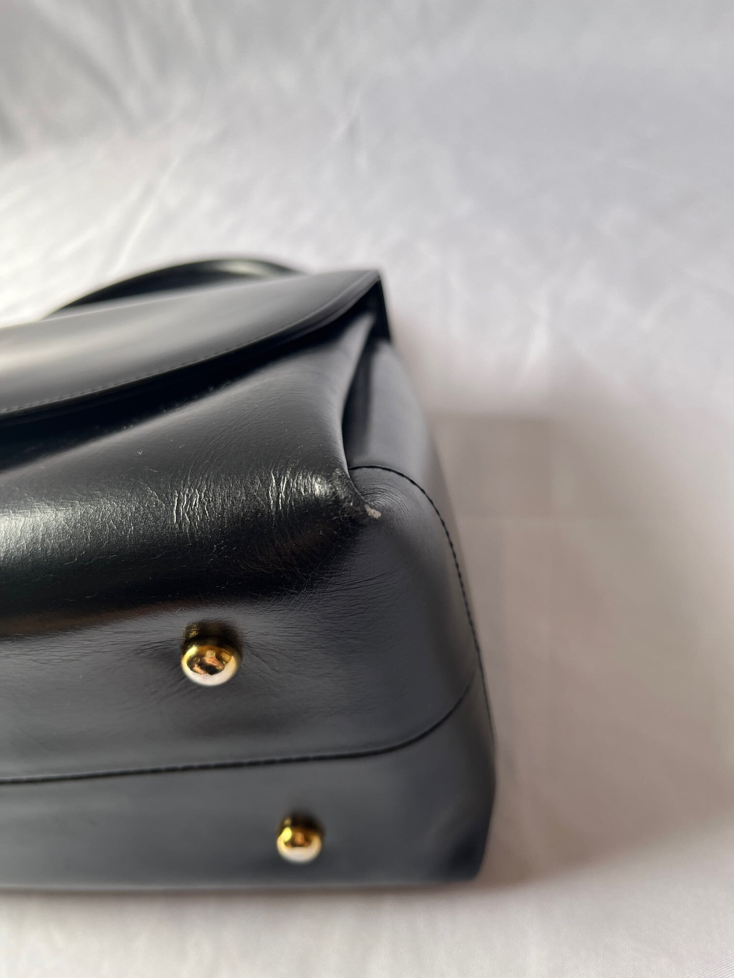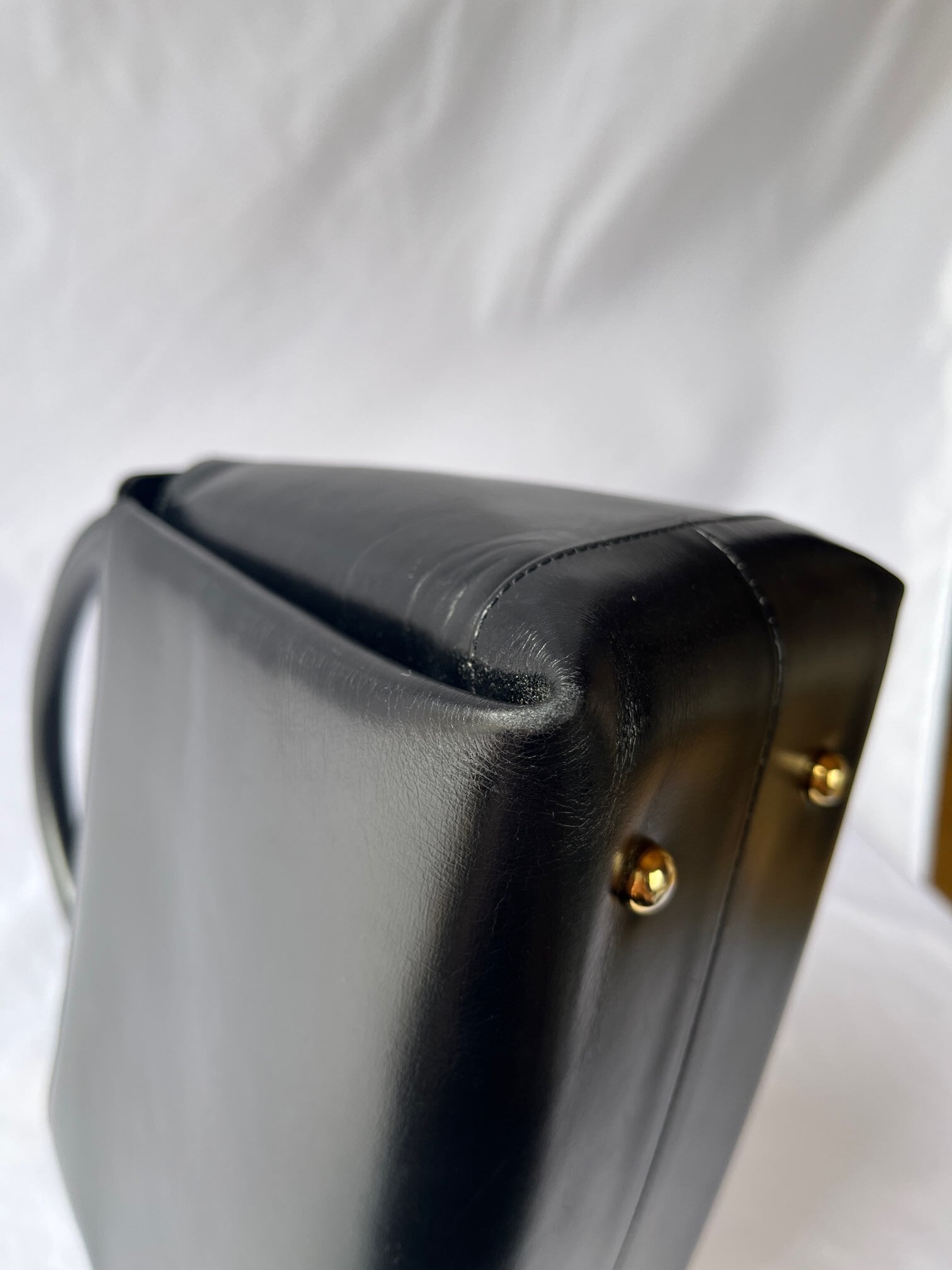 Box型のシルエットが上品なEleganceのハンドBag。つやのあるブラックレザーにゴールドのメタルパーツが目を惹くデザイン。たっぷりとしたマチで小ぶりながらも容量の入る仕様になっています。オケージョンシーンにもオススメな一品です。