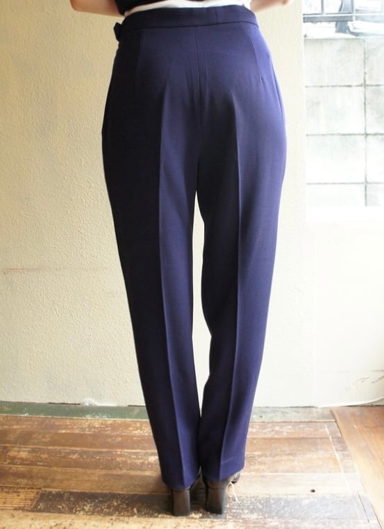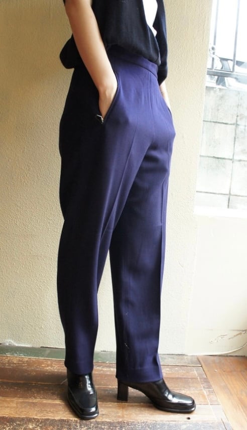 深いネイビーの色味が上品なHERMESウールパンツ。ハイウエストにテーパードの効いたシルエットがスタイリッシュな一品。