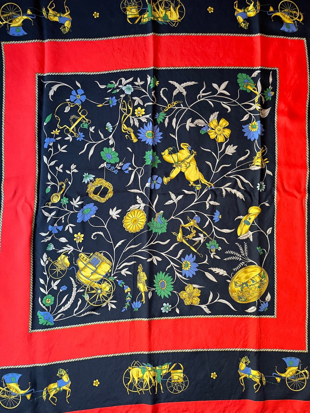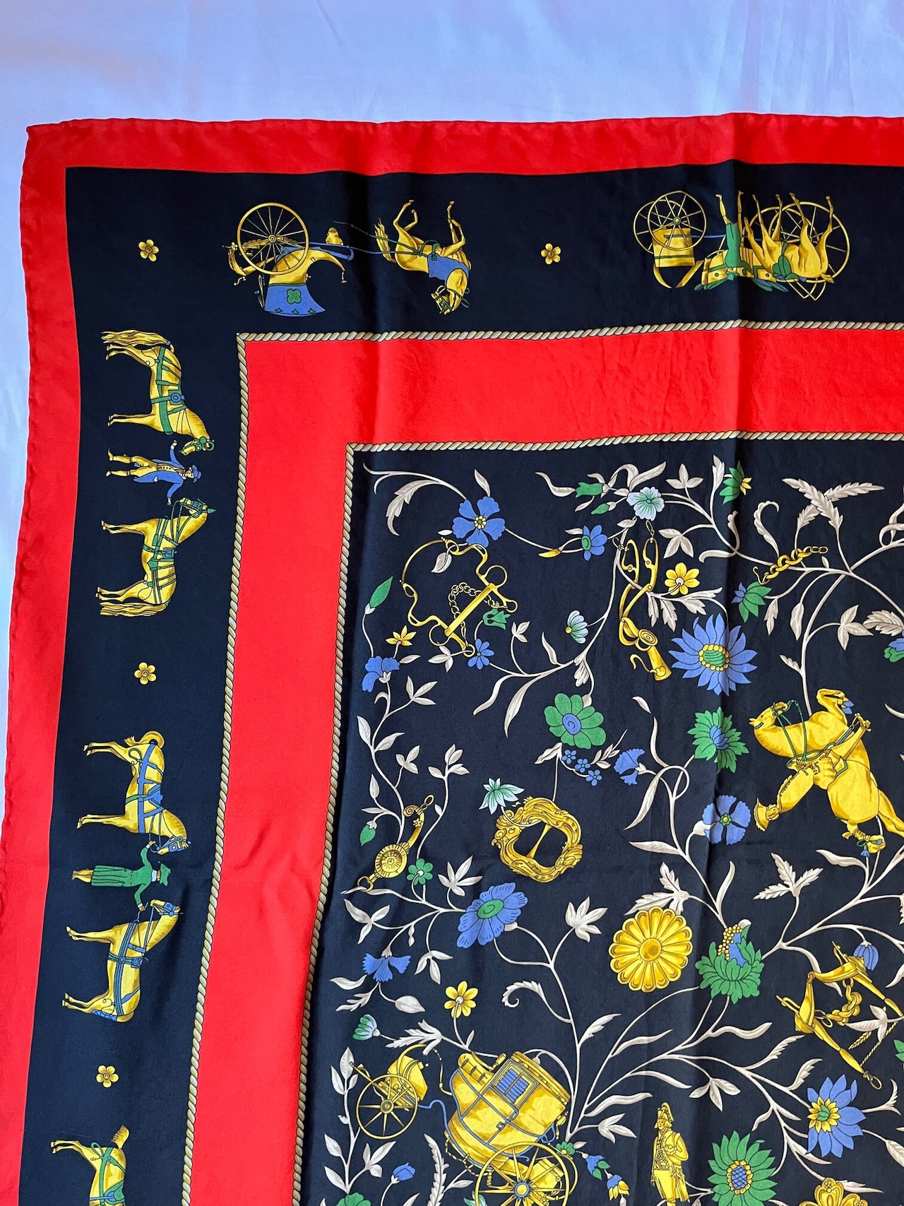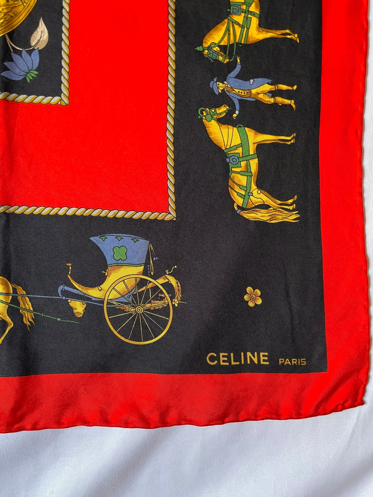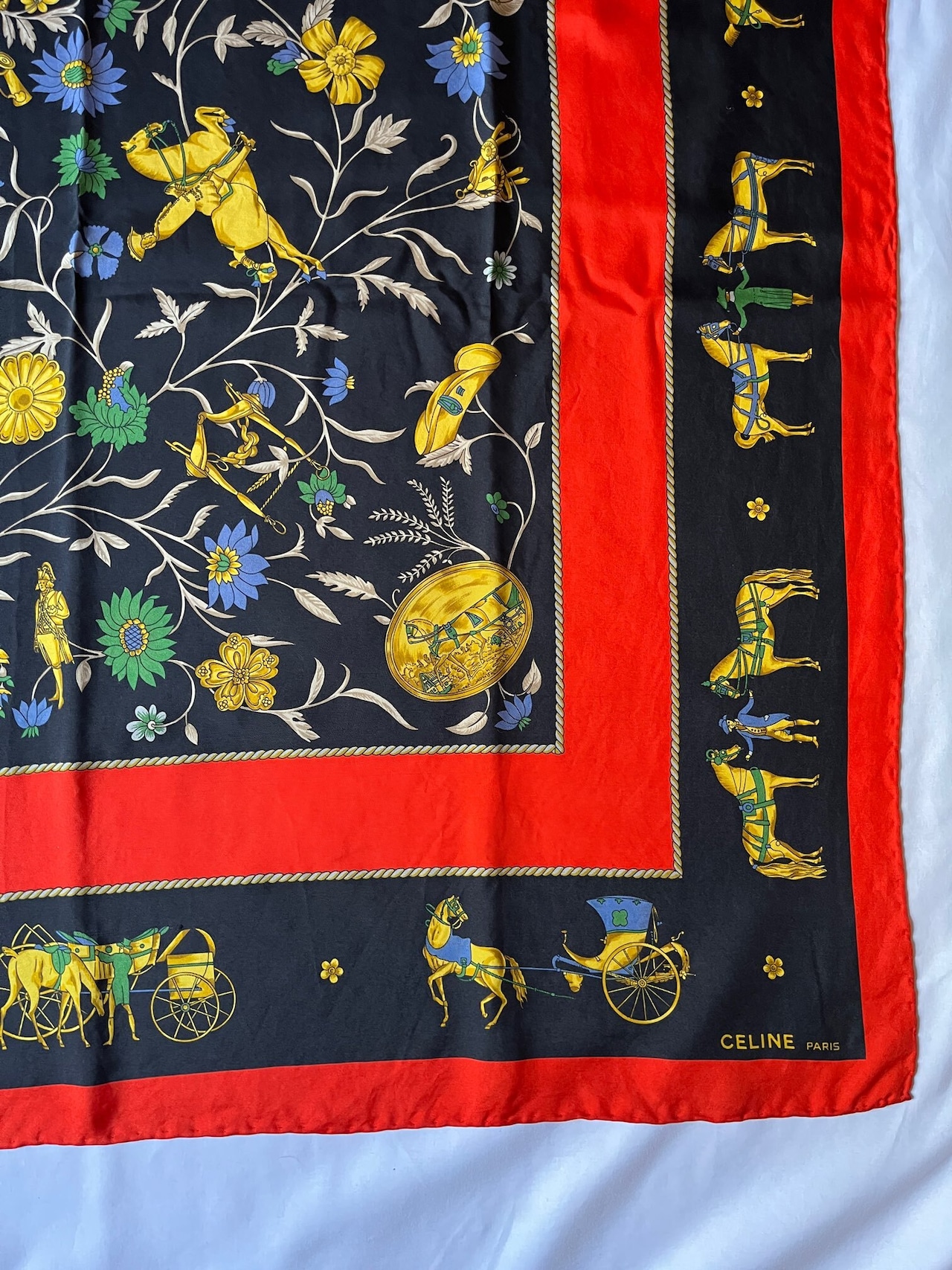 ブラックベースにブルーやグリーンの花の絵が可憐なCeline 80's Vintage スカーフ。レッドのフレームが締まりとなり、メリハリの効いたデザイン。馬車モチーフなどCELINEらしいエッセンスも光る一枚です。