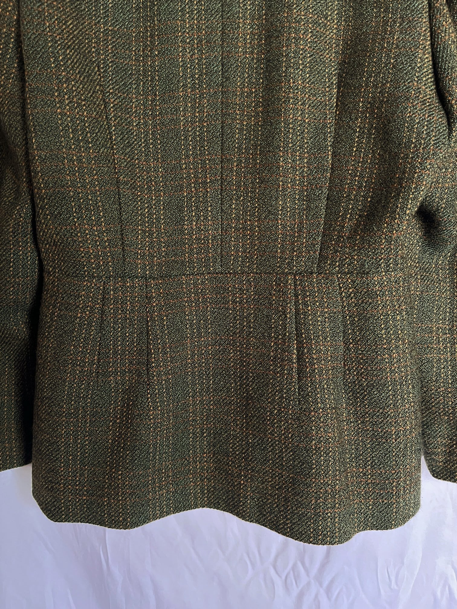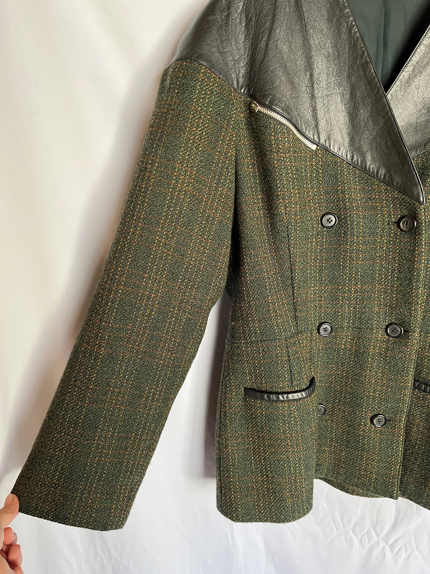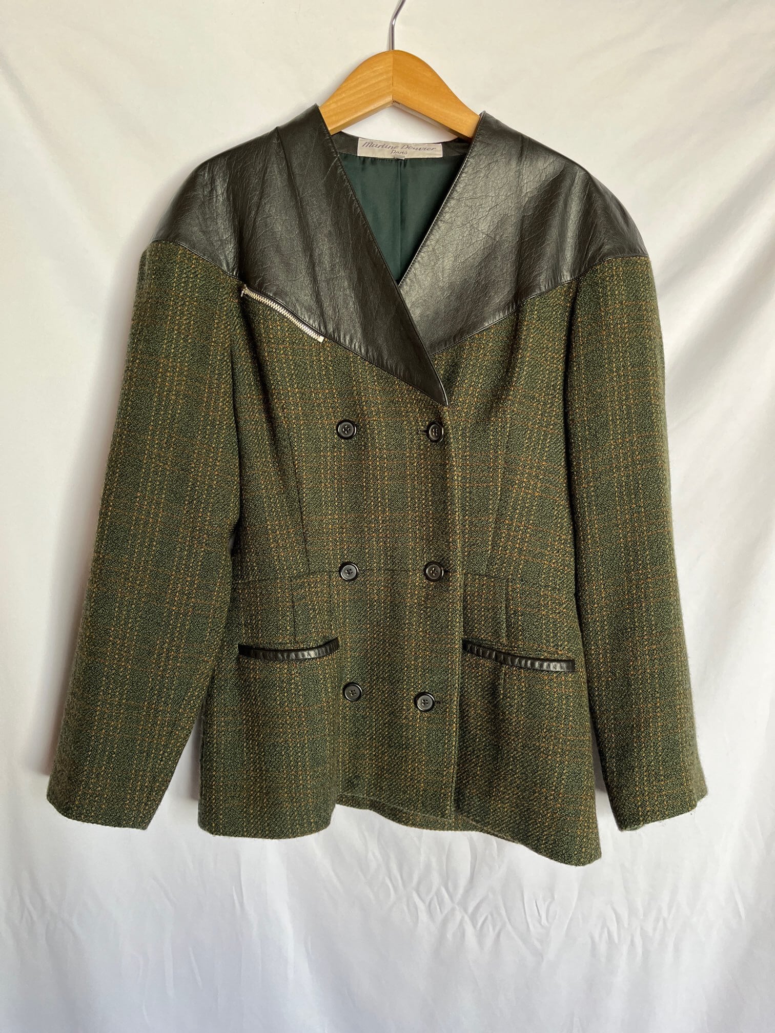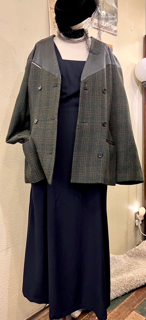 グリーンのツイード地にブラックレザーの切り替えがユニークなFrance Vintage ジャケット。