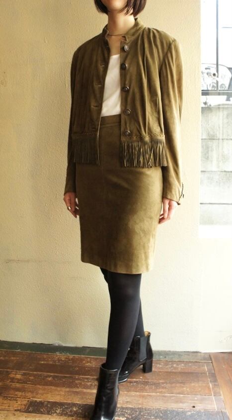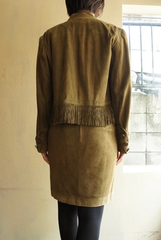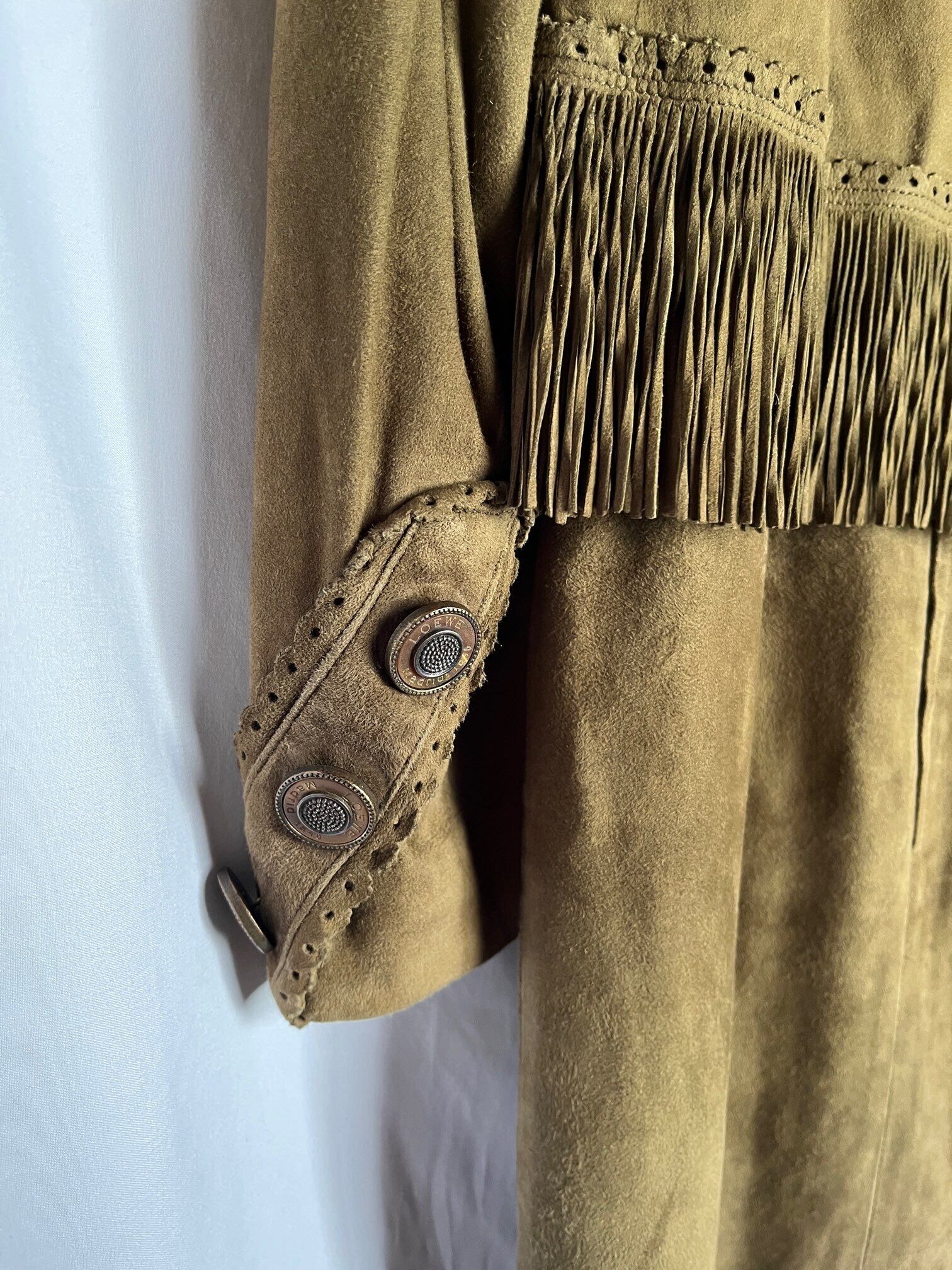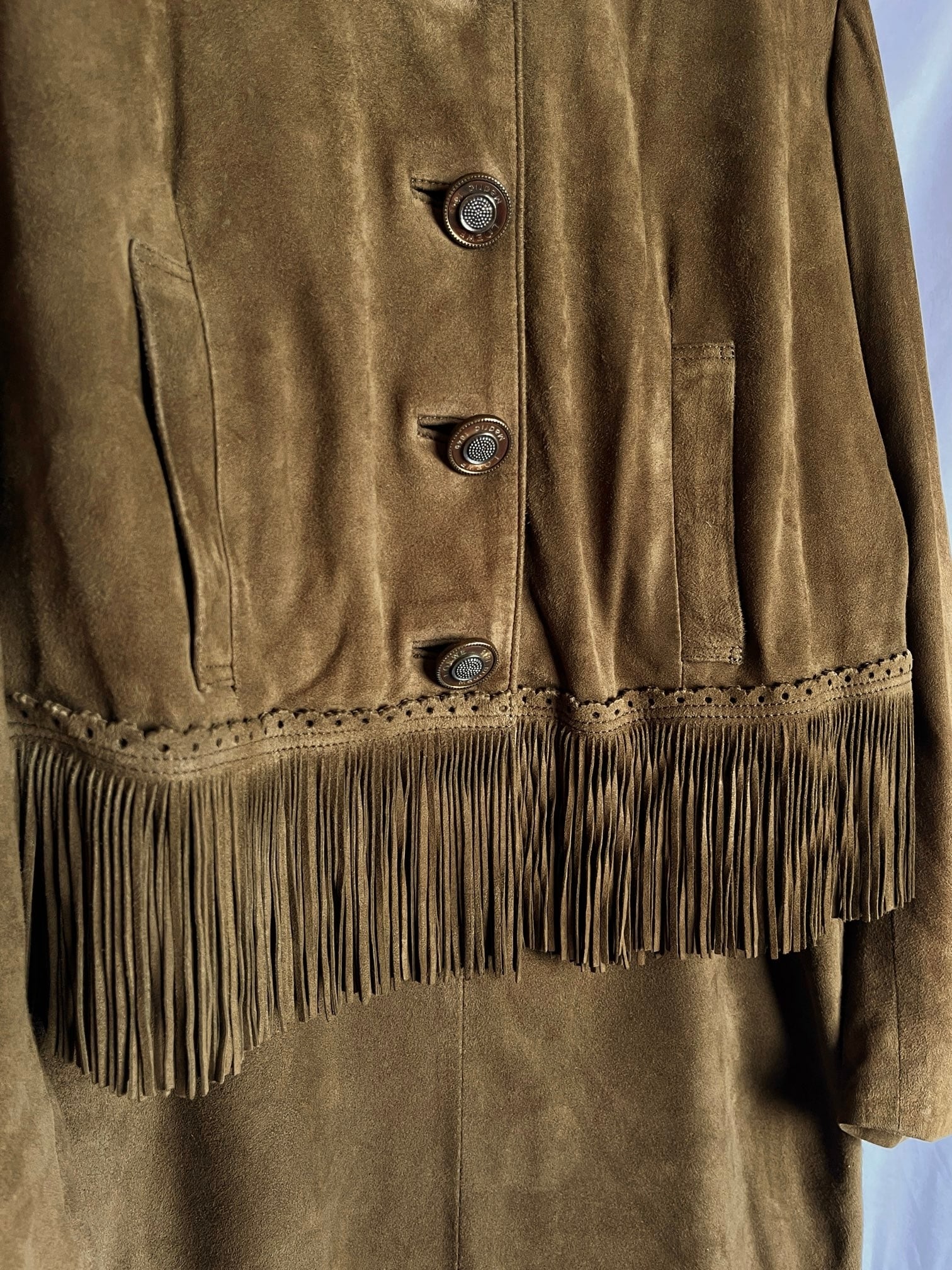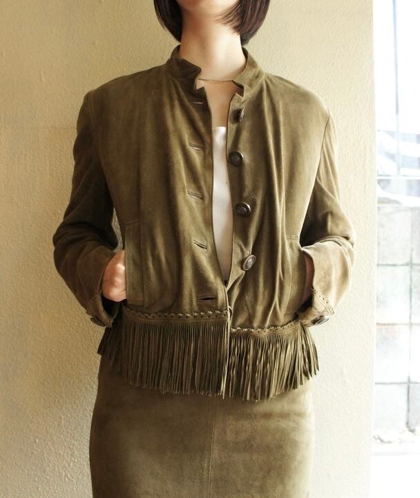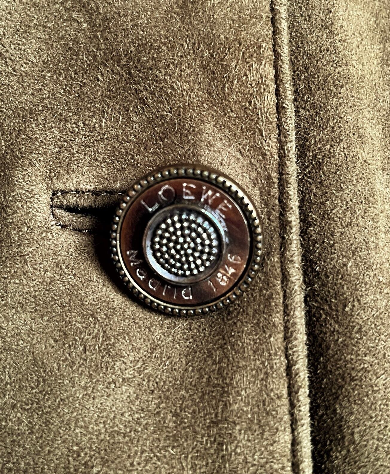 とても柔らかい極上のスエード地はハイクオリティでさすがLOEWE。大きなメタルボタンやフリンジなど、ウエスタン風のエッセンスがユニークなジャケット。