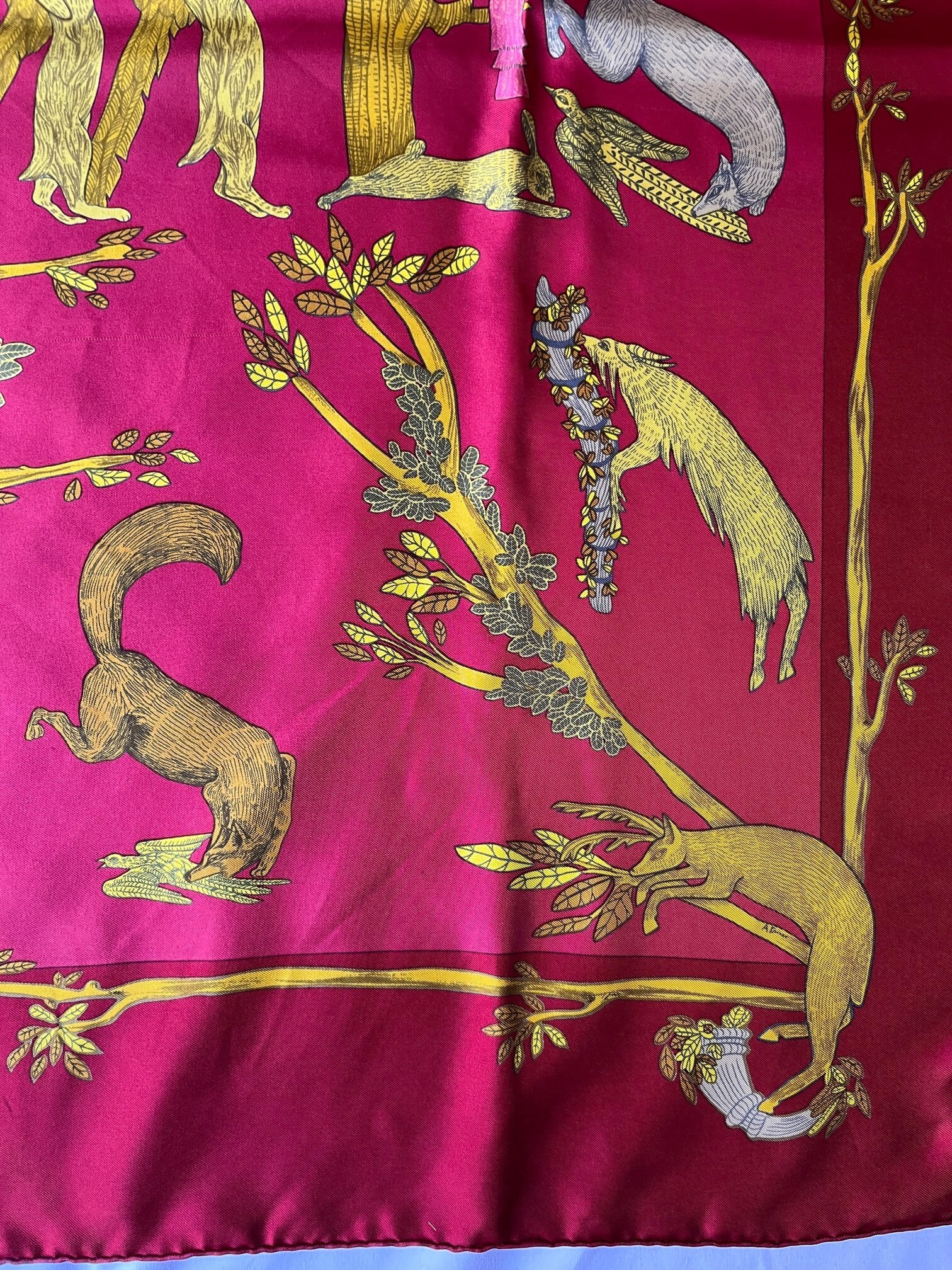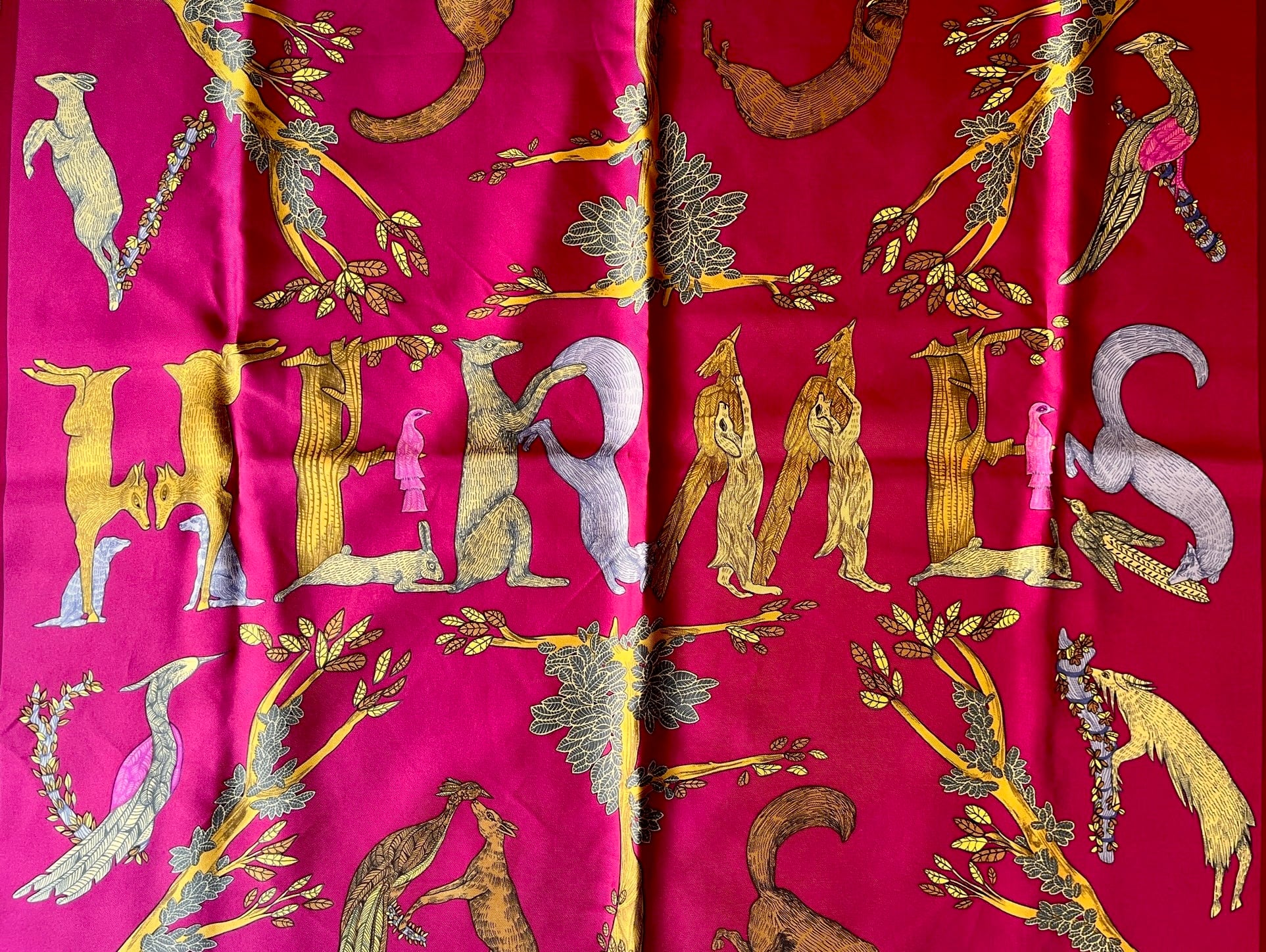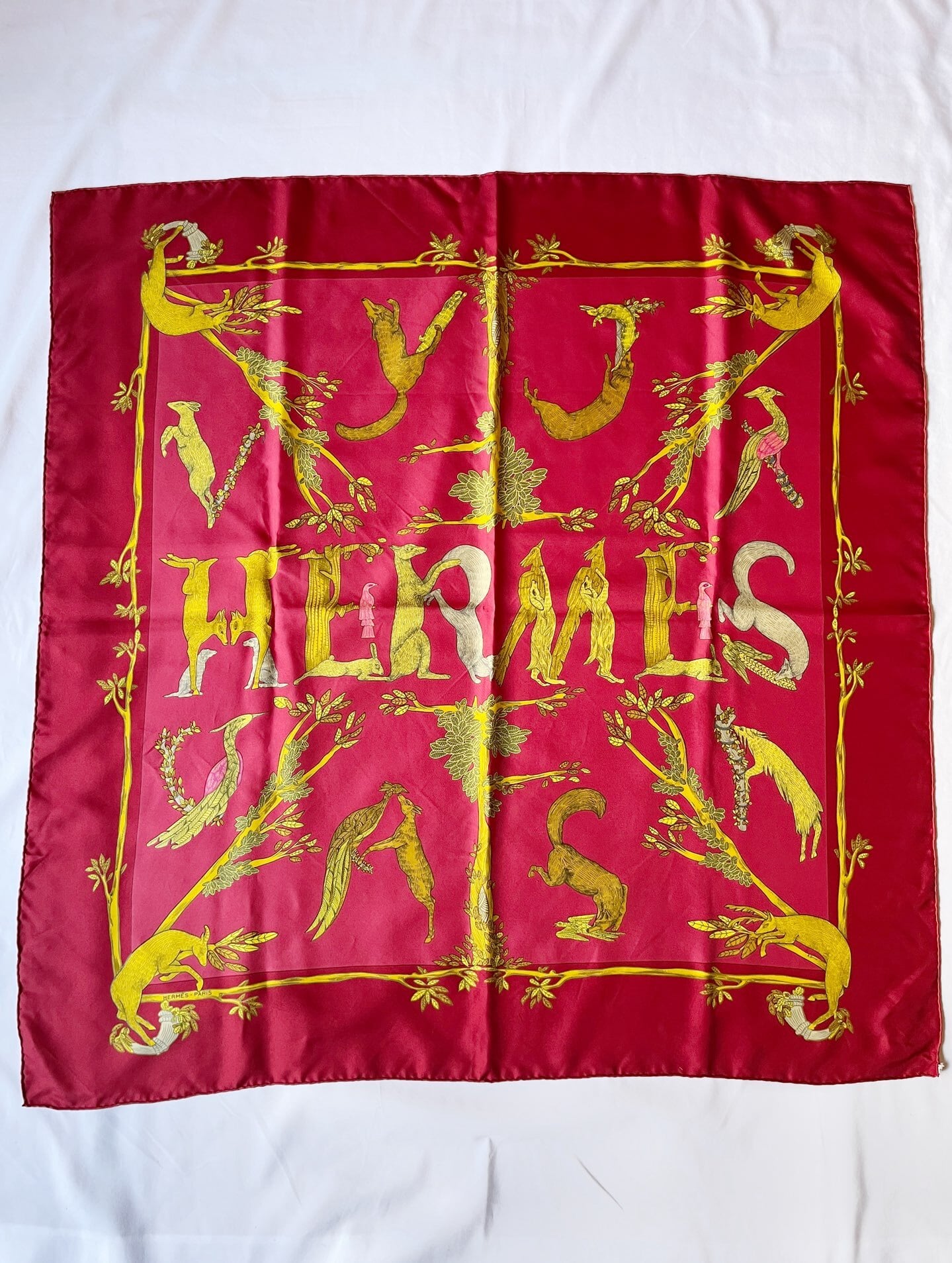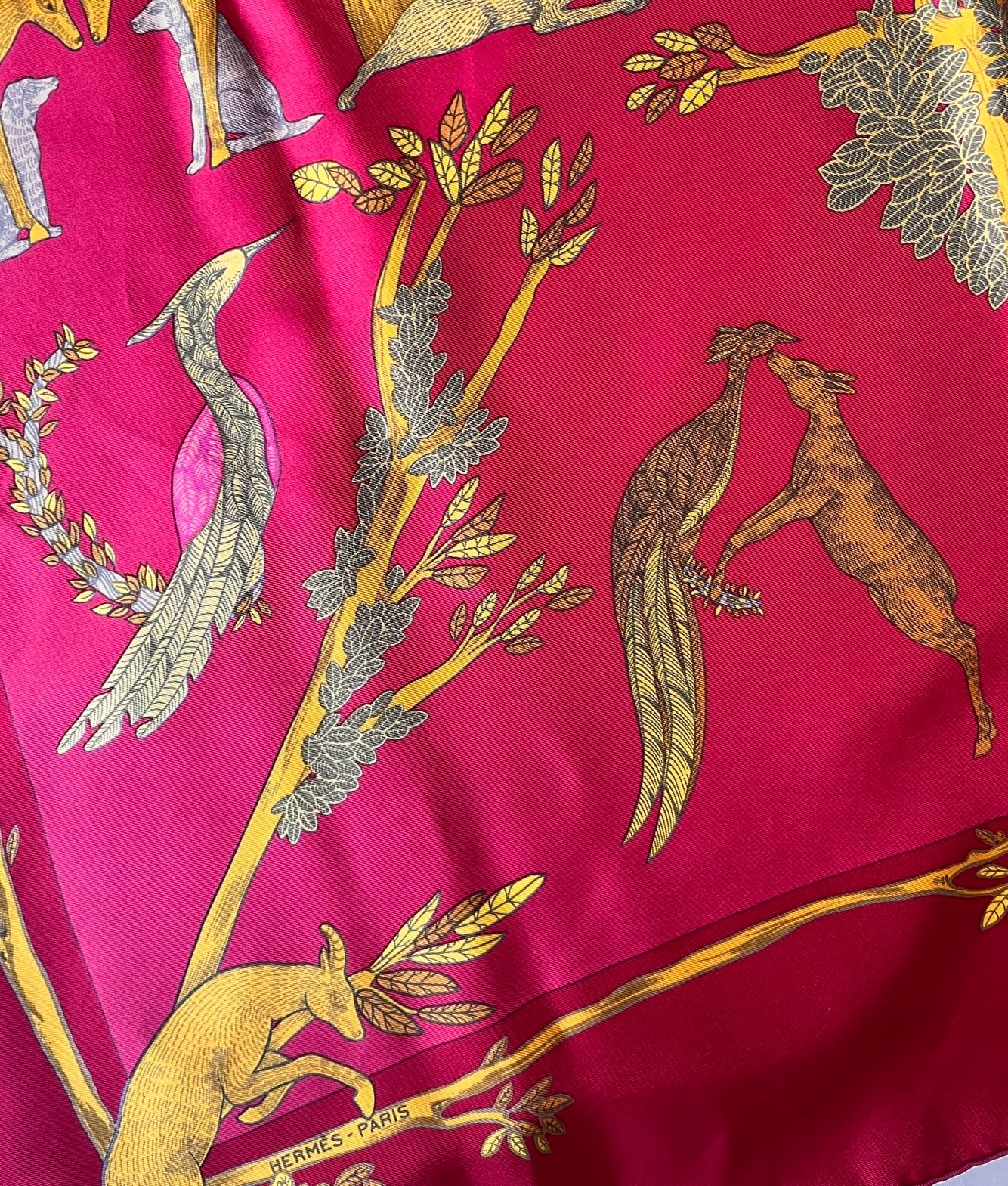 アニマルモチーフの“HERMES”ロゴがユニークなHermes Vintageスカーフ。鳥やウサギなどの動物たちが神秘的なタッチで描かれている芸術的な一枚。深い赤の色味が存在感もあります。