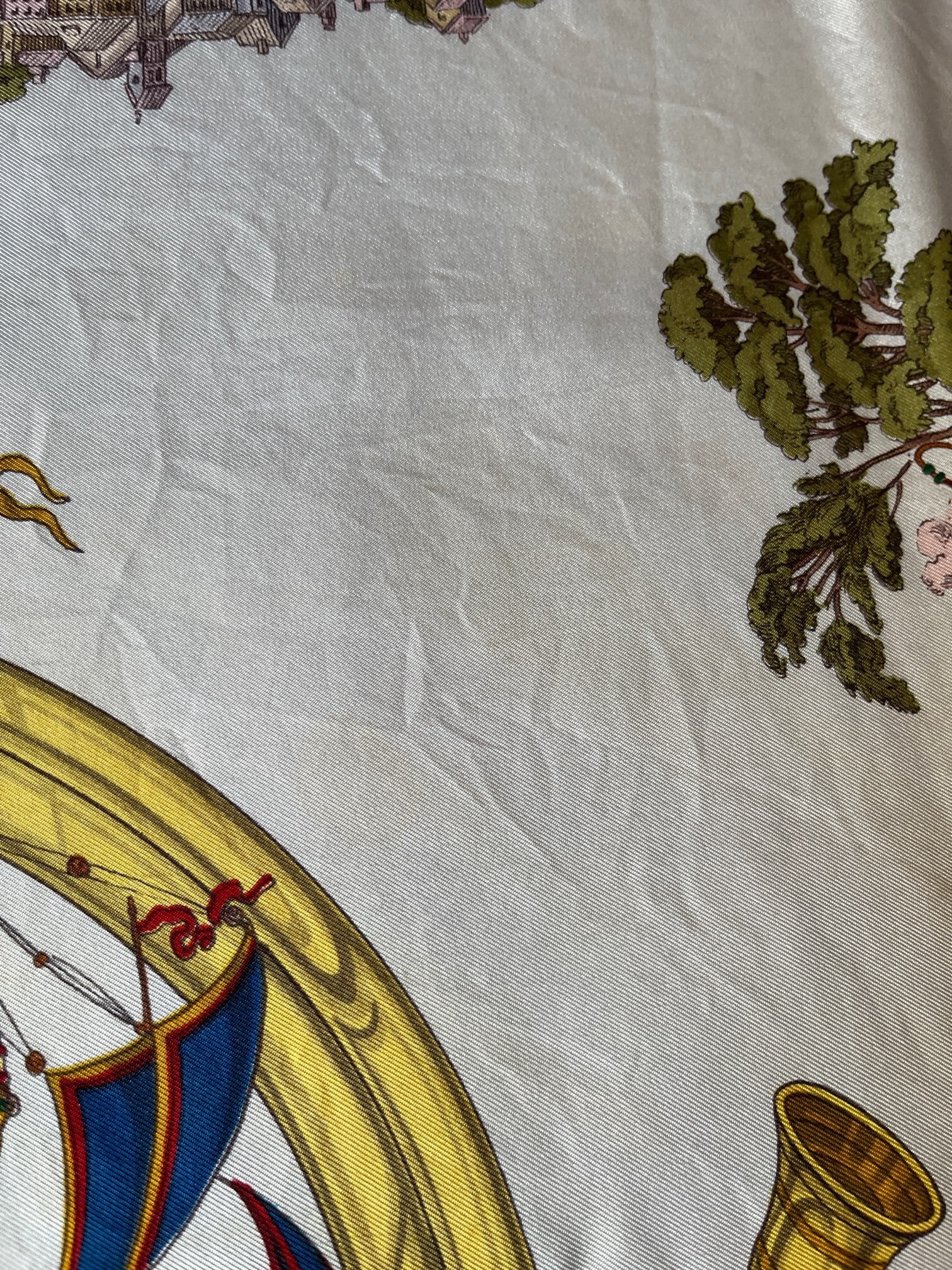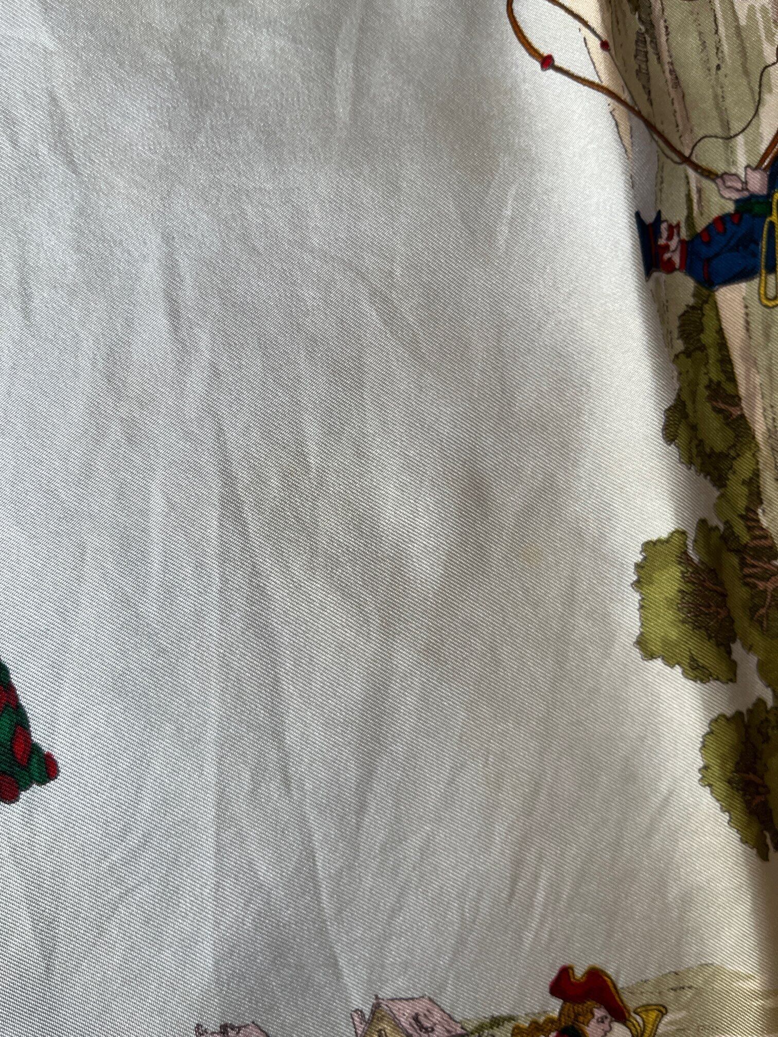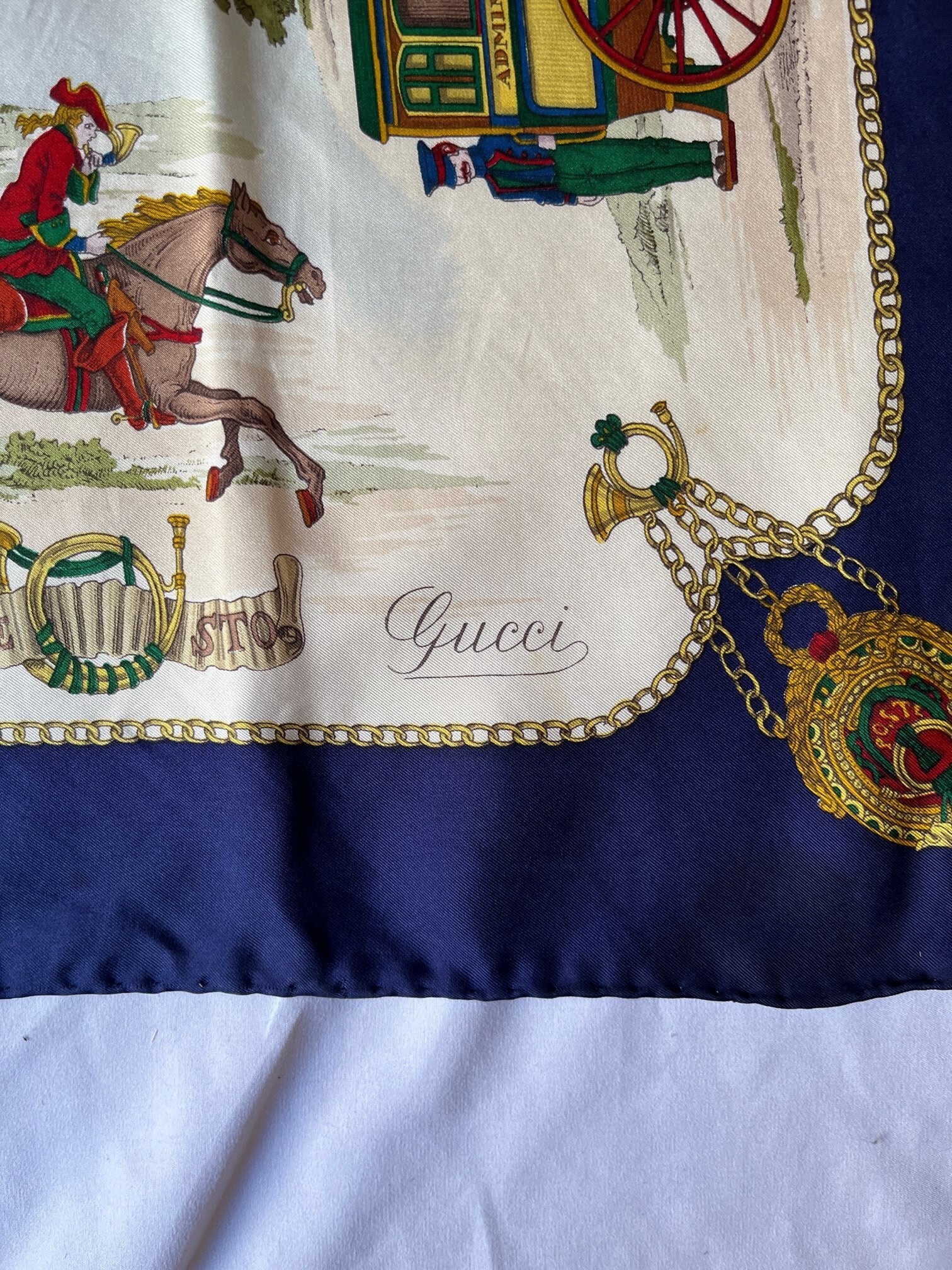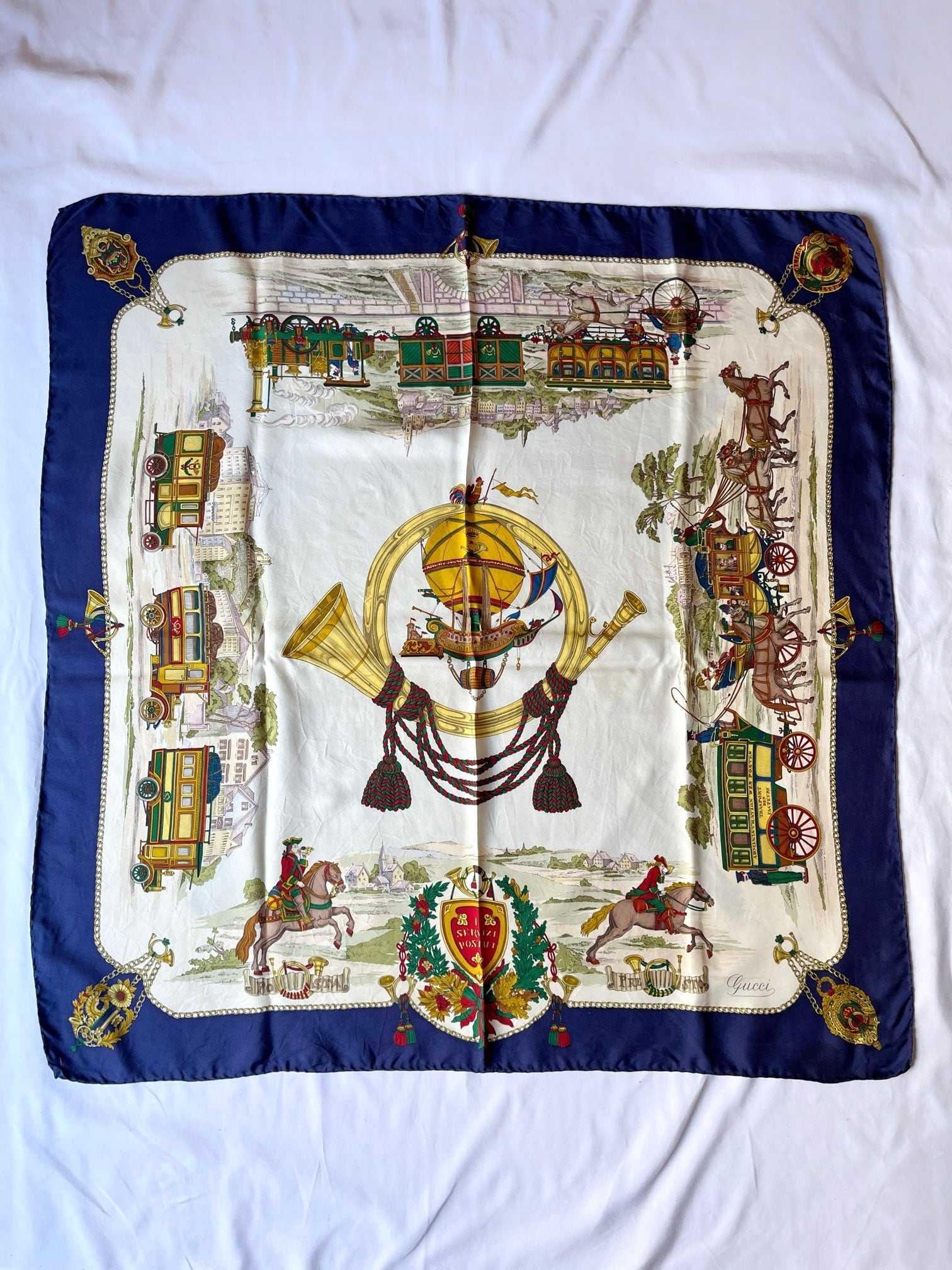 郵便や貨物輸送をテーマとしたGUCCI Vintageスカーフ。町中を駆け抜ける馬車や列車がX'mas前の輸送ラッシュを彷彿とさせる絵柄で思わずワクワクする一枚。セーターのホルンに囲われた気球がドリーミーです。