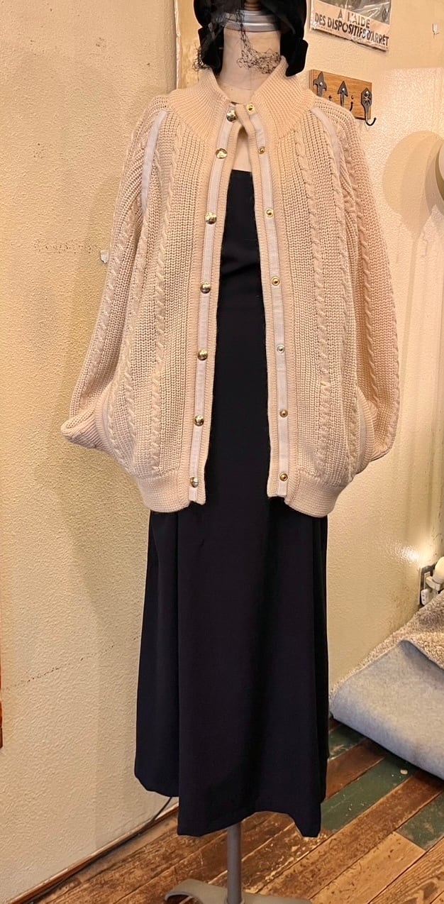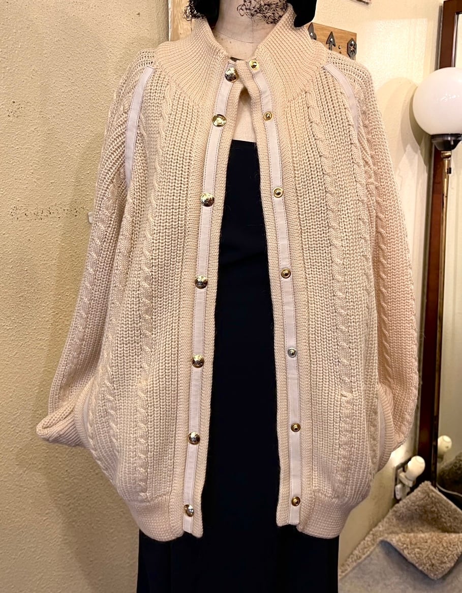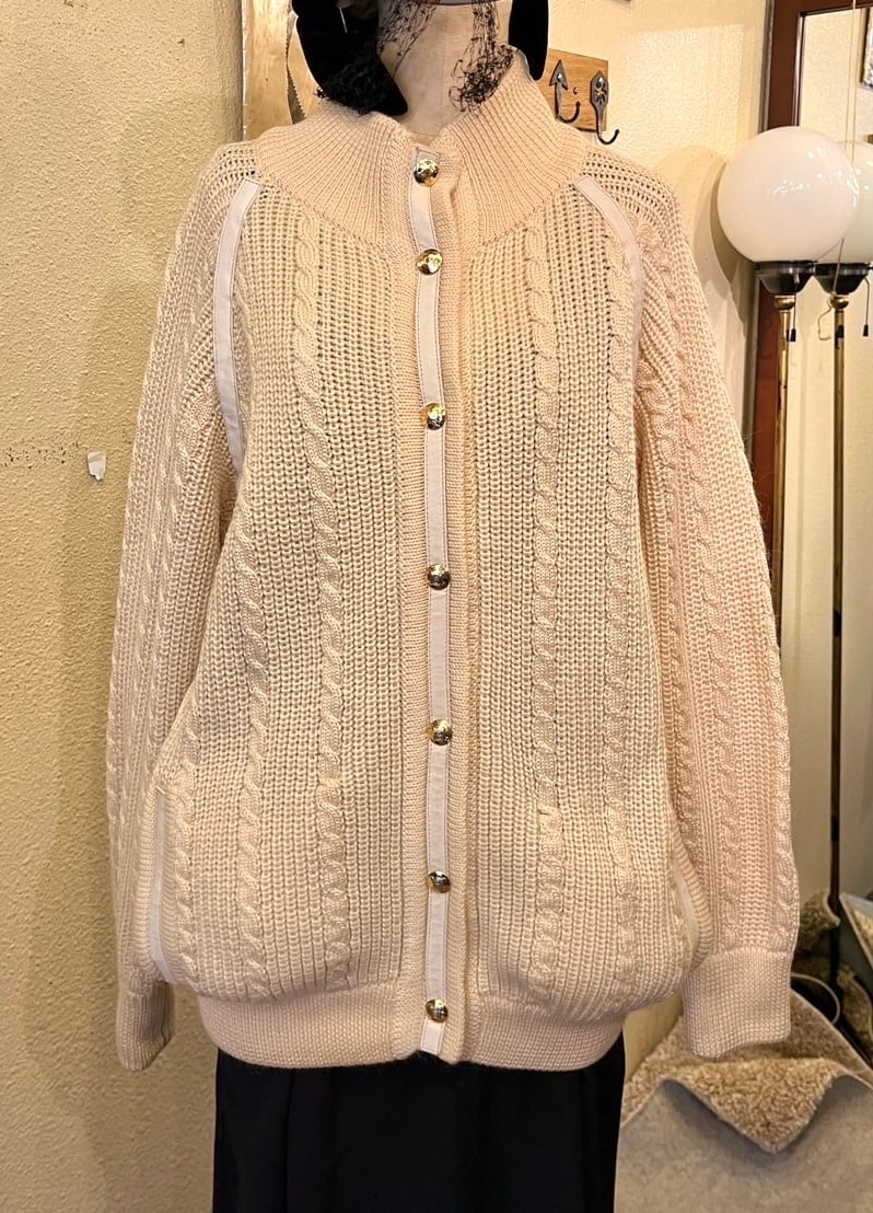 ホワイトレザーのパイピングがアクセントに効いてます。ゴールドのマカダムボタンが華やかながらも、ケーブル編みのデザインがあたたかい印象の一枚です。