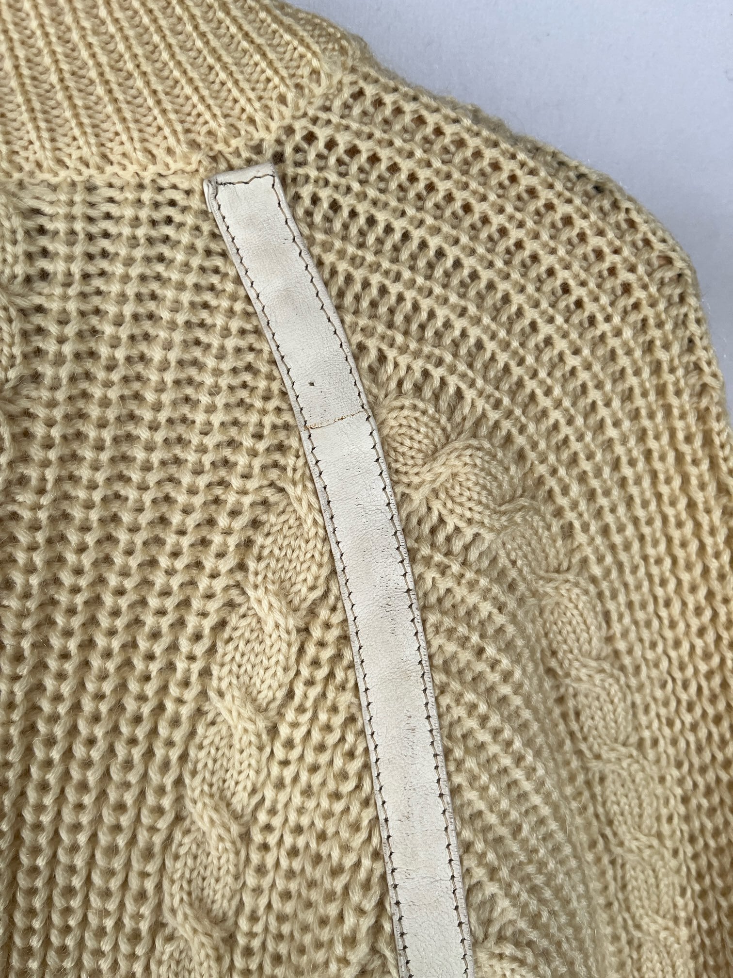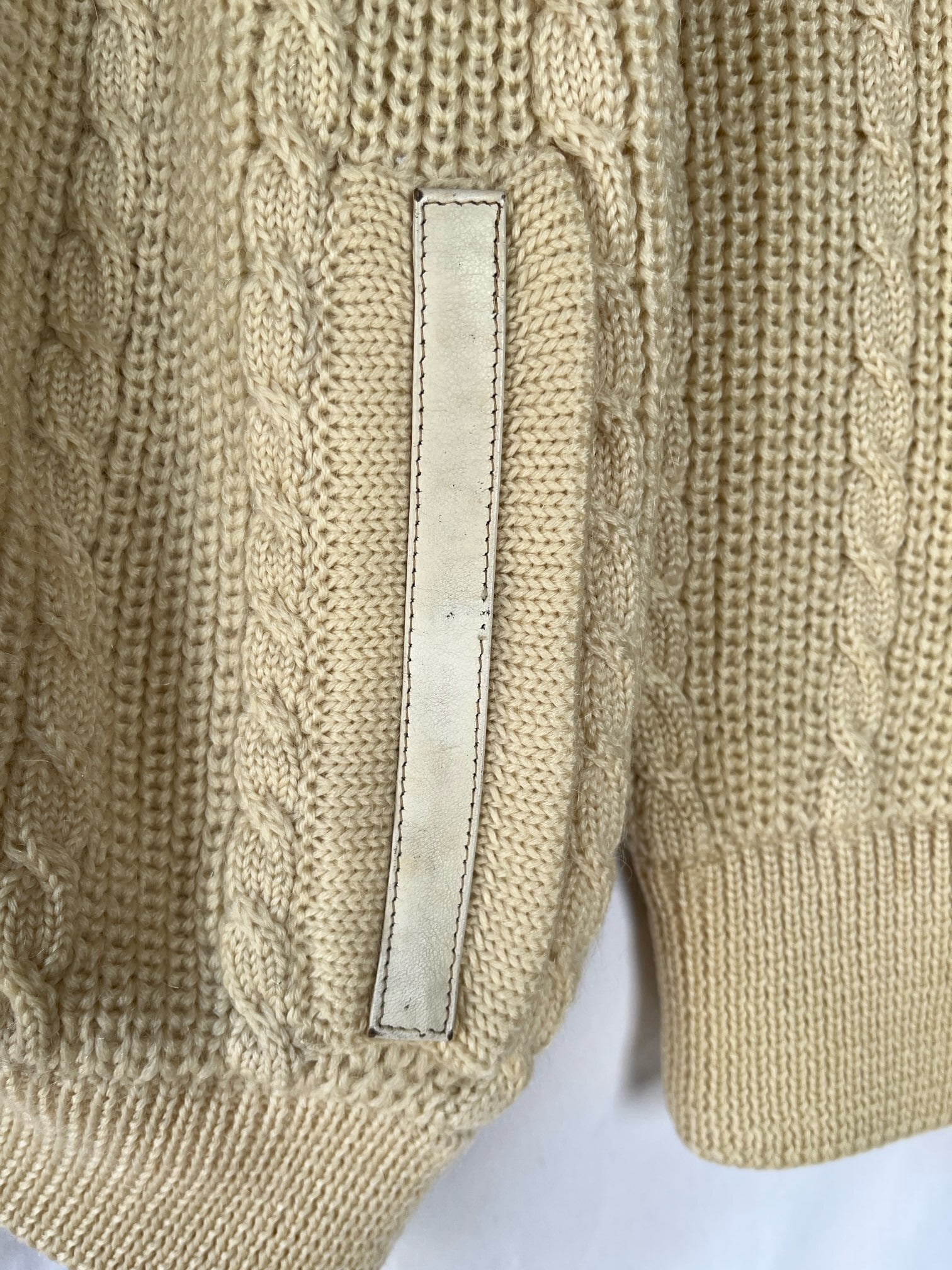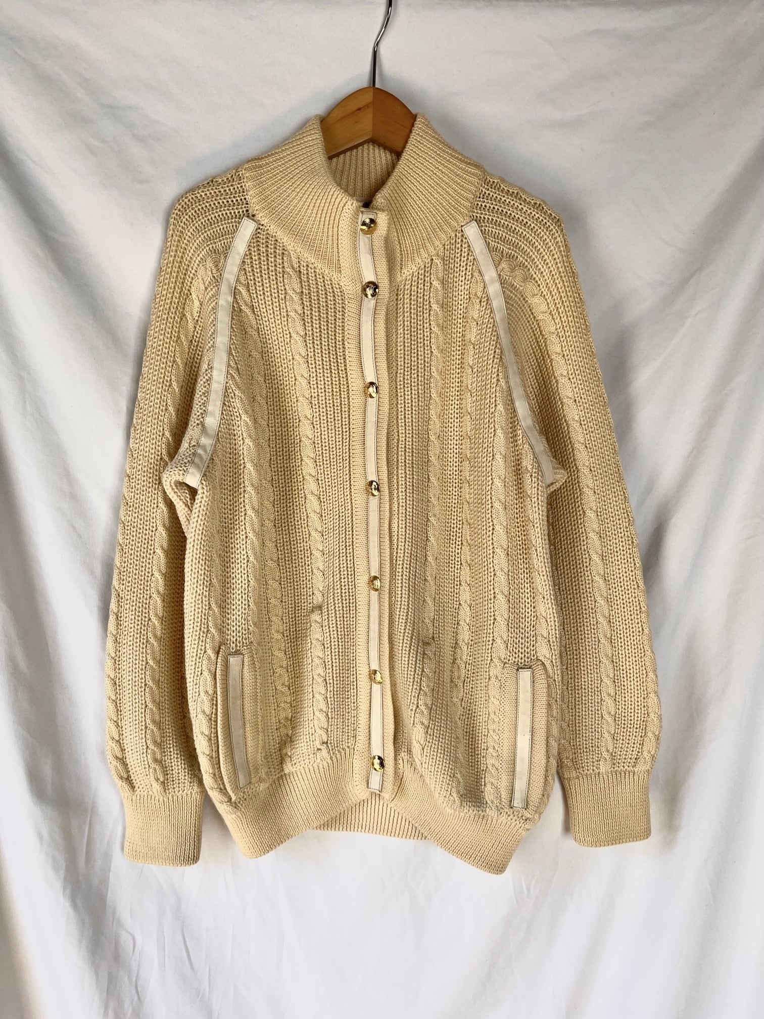 ホワイトレザーのパイピングがアクセントに効いてます。ゴールドのマカダムボタンが華やかながらも、ケーブル編みのデザインがあたたかい印象の一枚です。