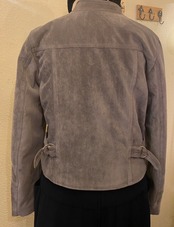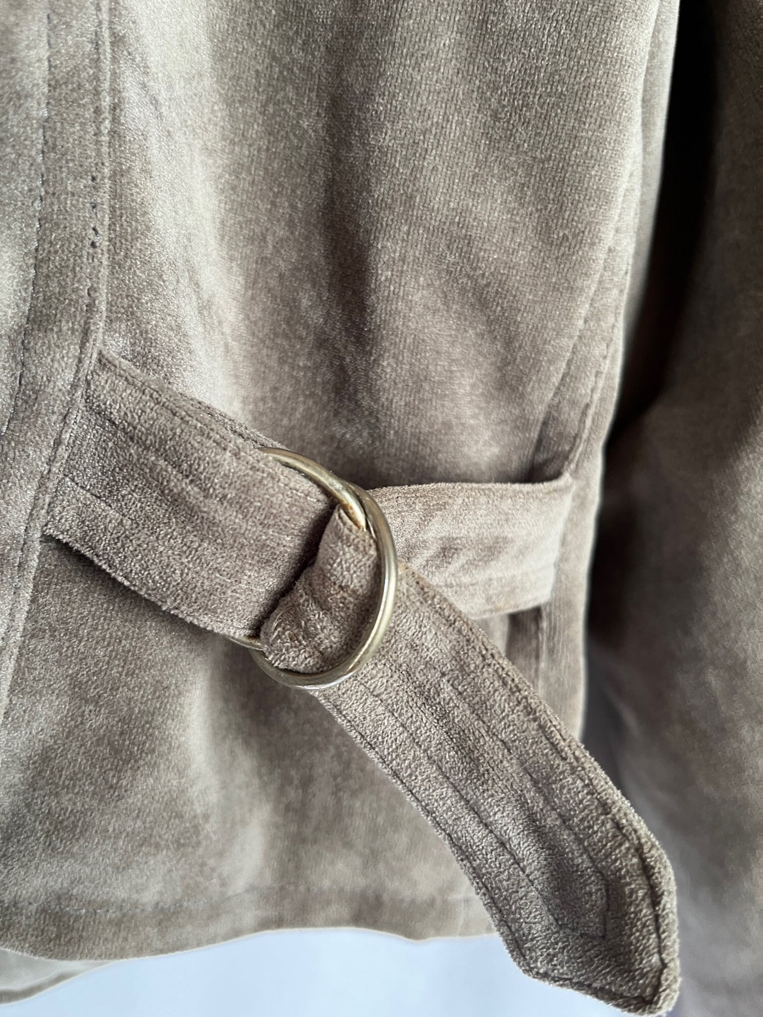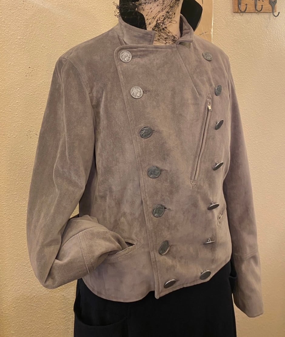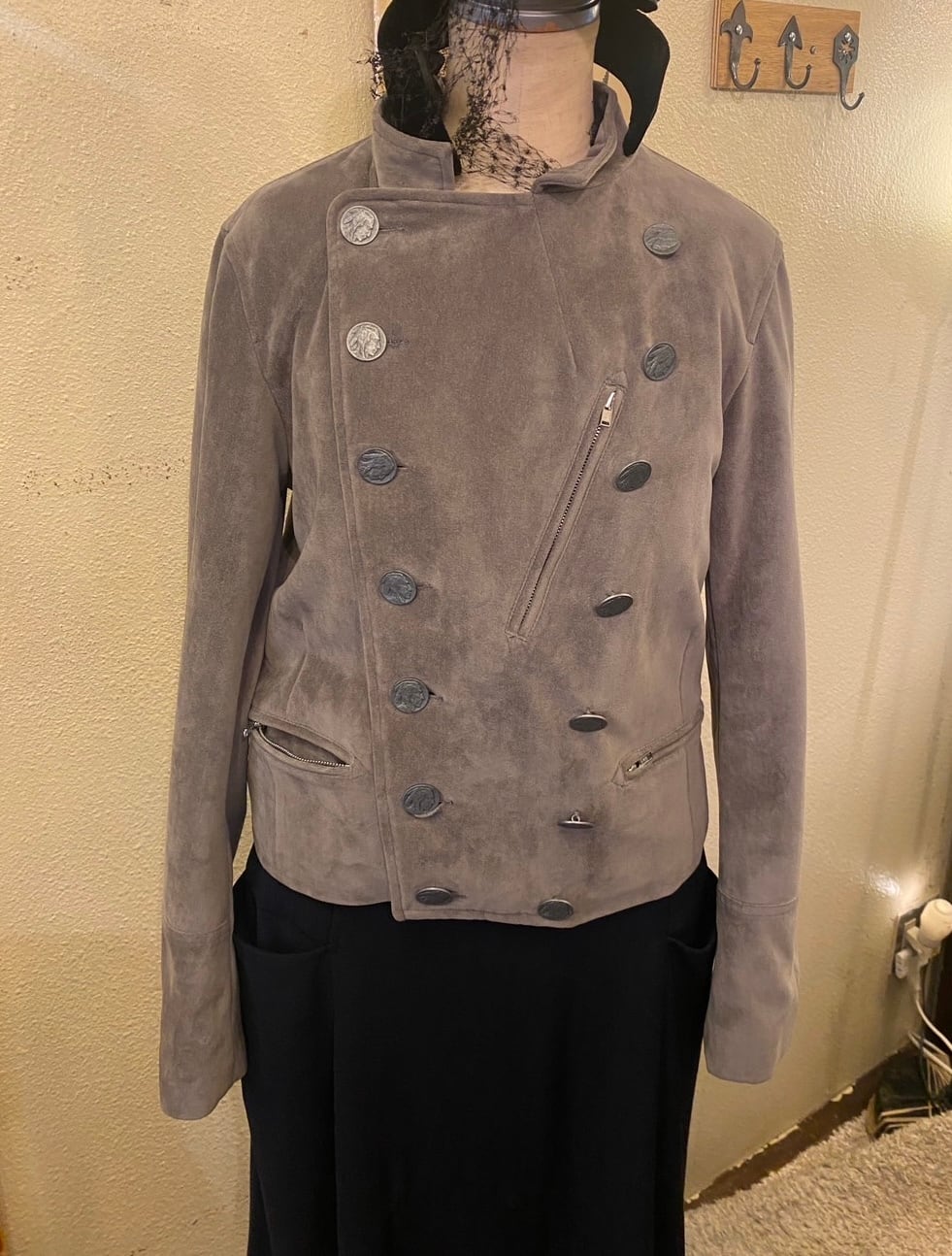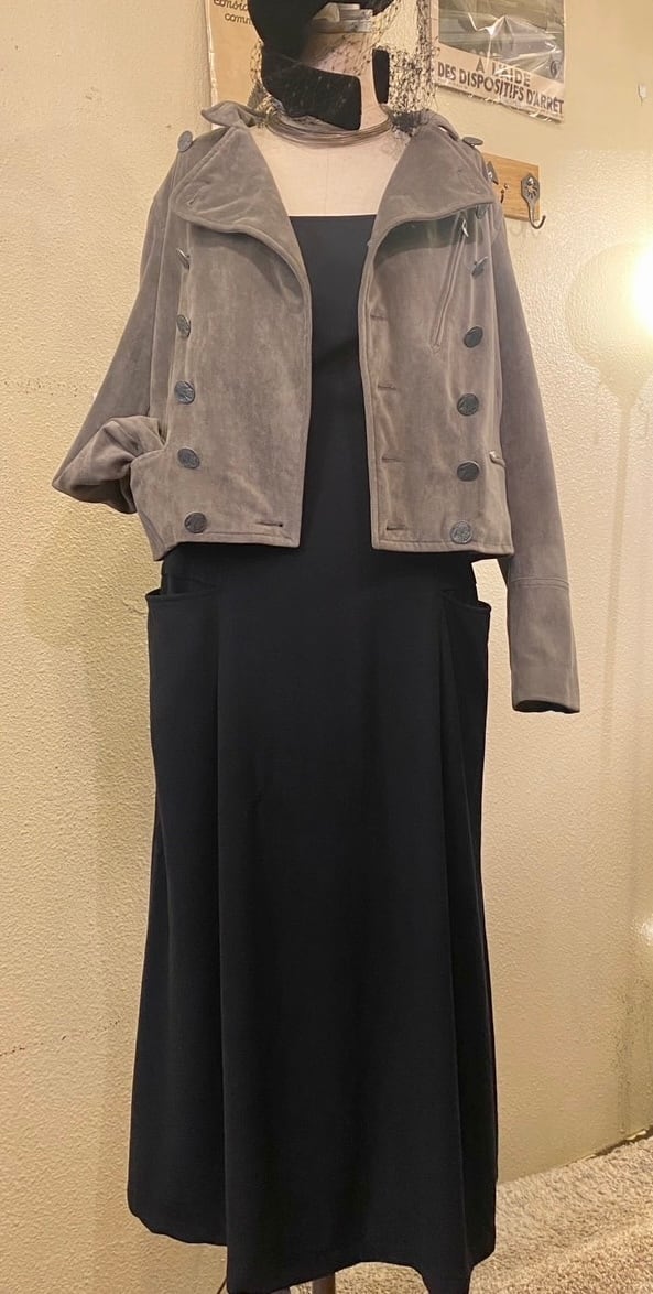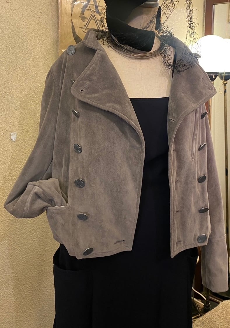 グレーのベロア地が手触りの良いアニエスのジャケット。ナポレオンジャケットのようなクラシカルなボタン配置が個性的な一枚。短丈でバランスをとりやすいのもポイント☆