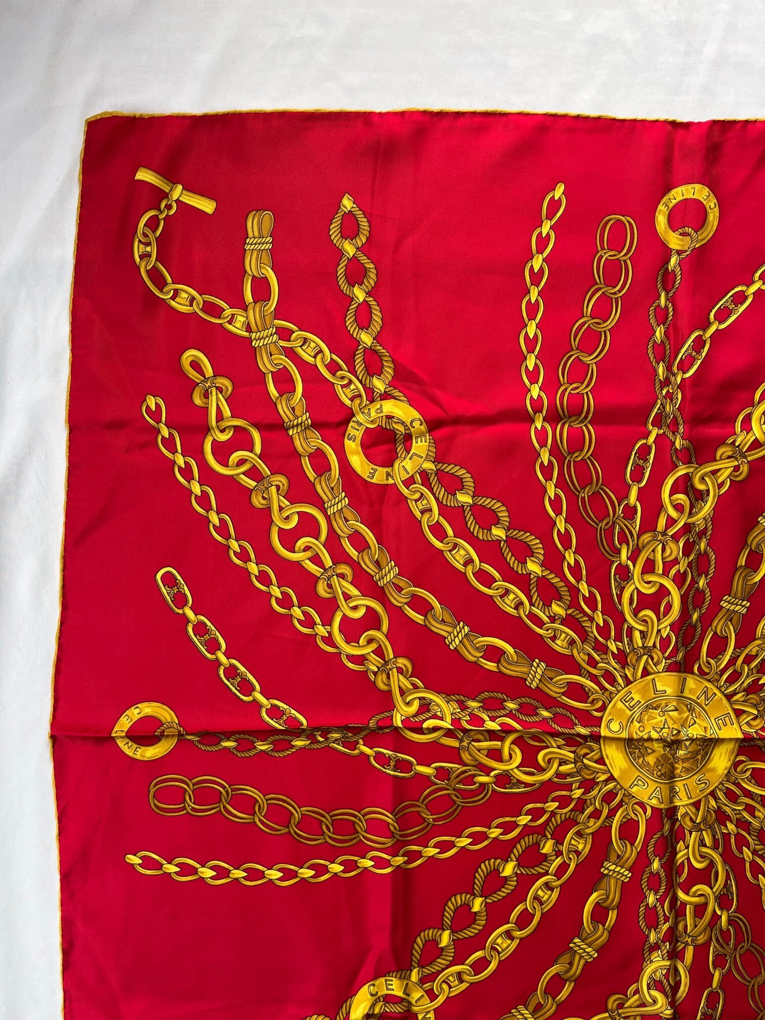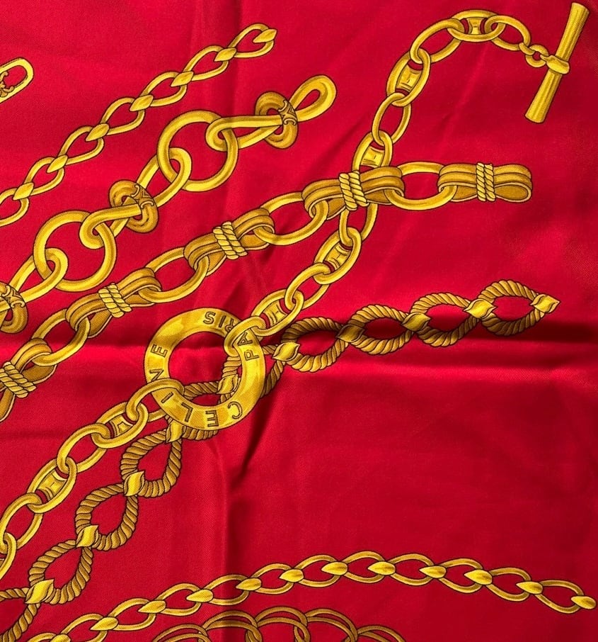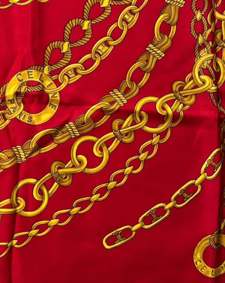 真っ赤なベースにゴールドのチェーンモチーフが華やかなCeline Vintage スカーフ。