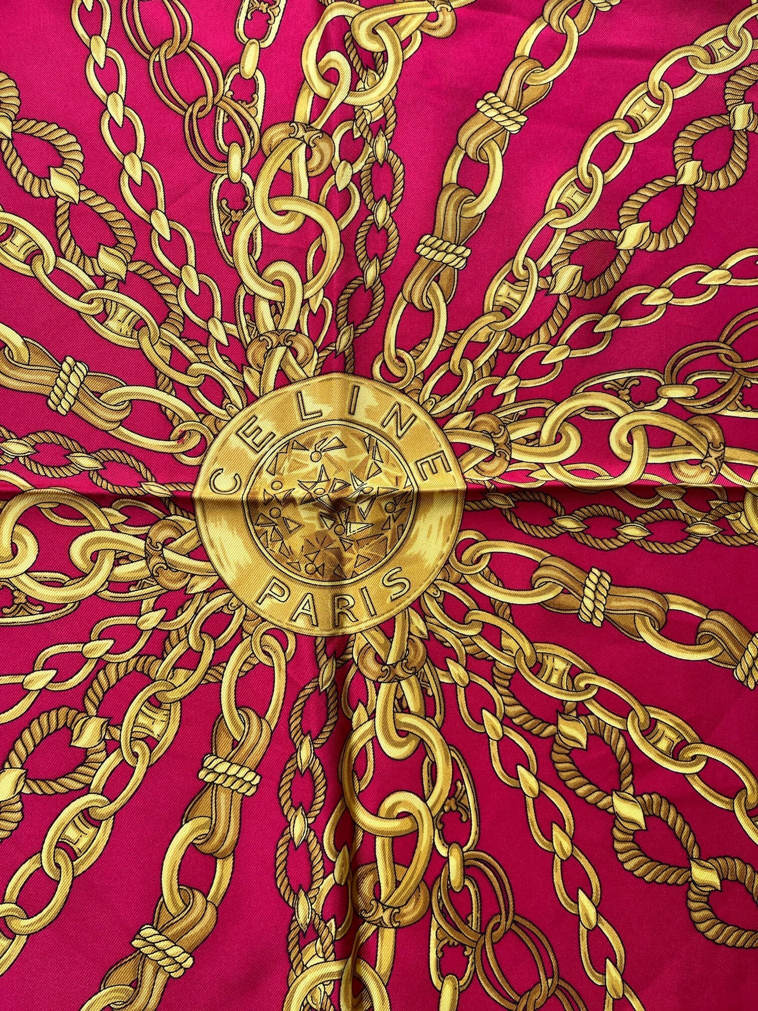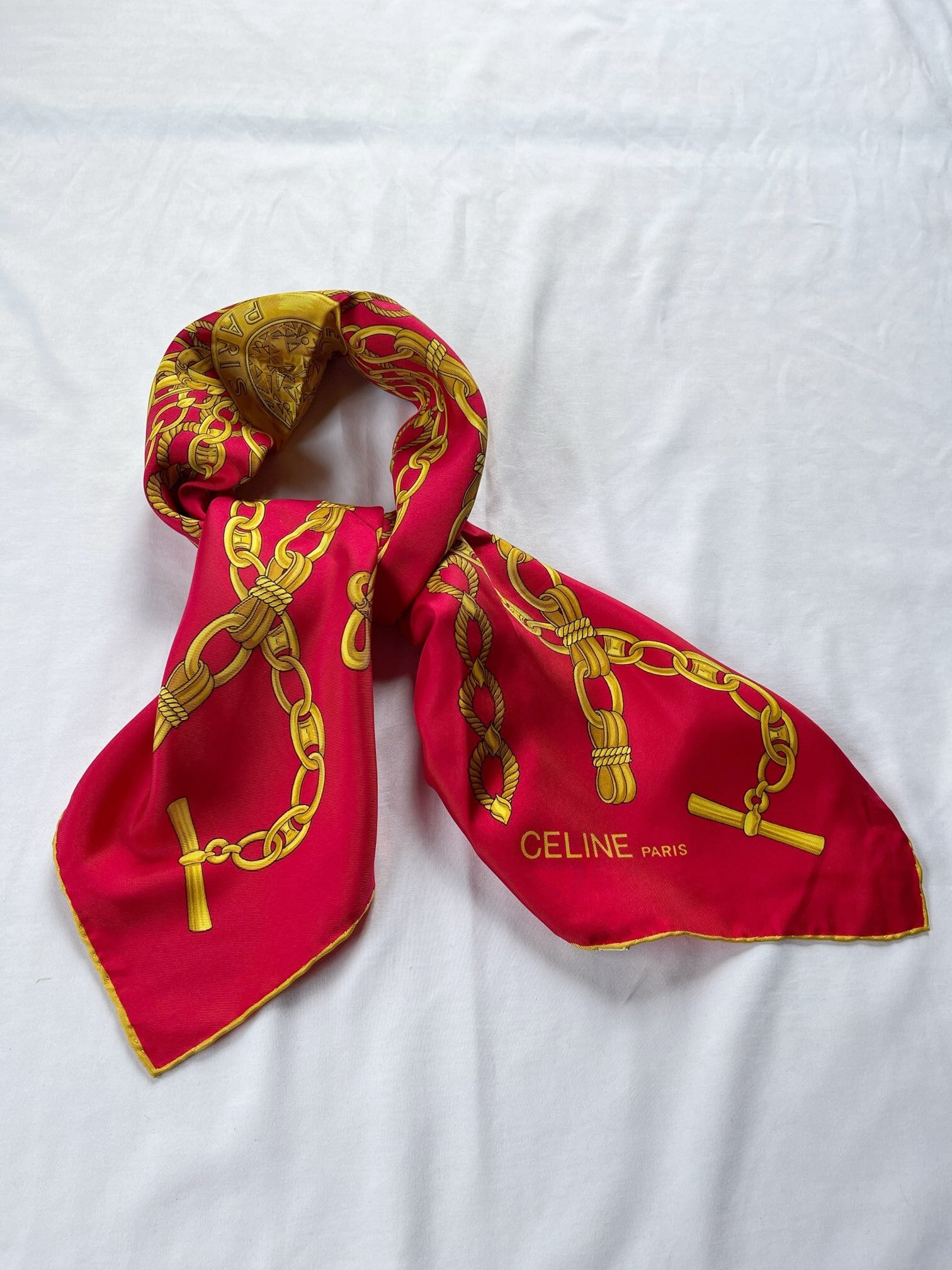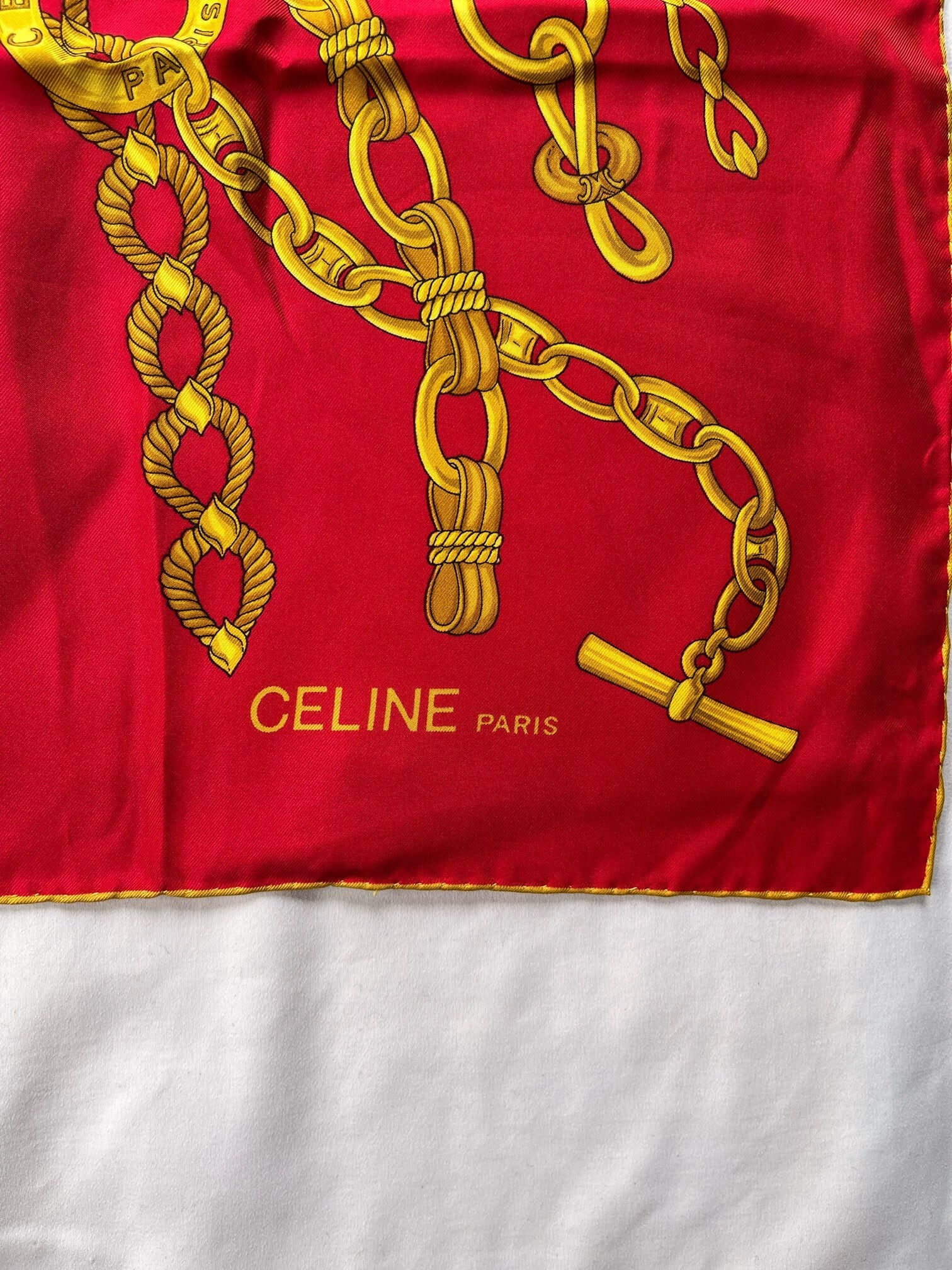 真っ赤なベースにゴールドのチェーンモチーフが華やかなCeline Vintage スカーフ。