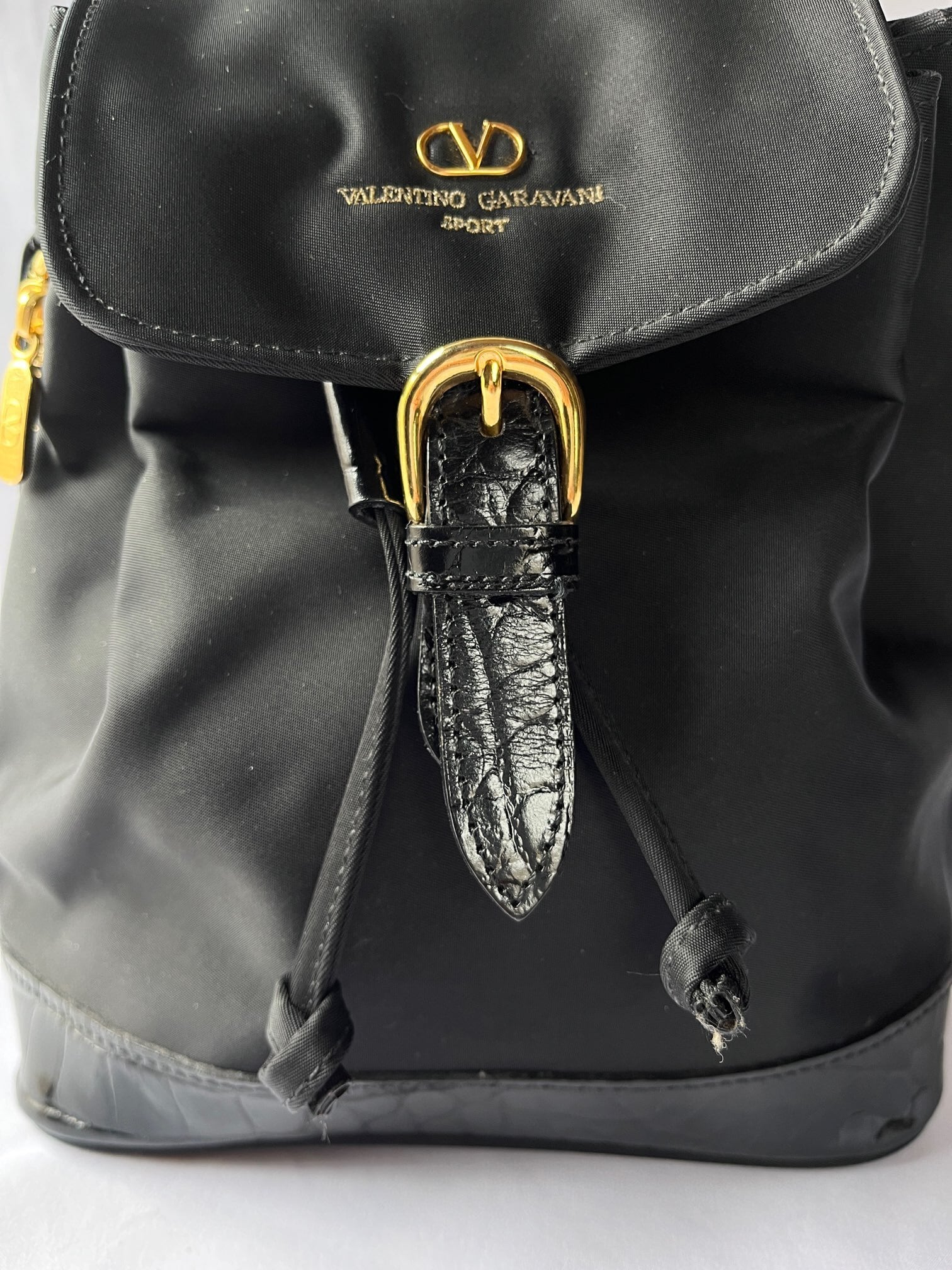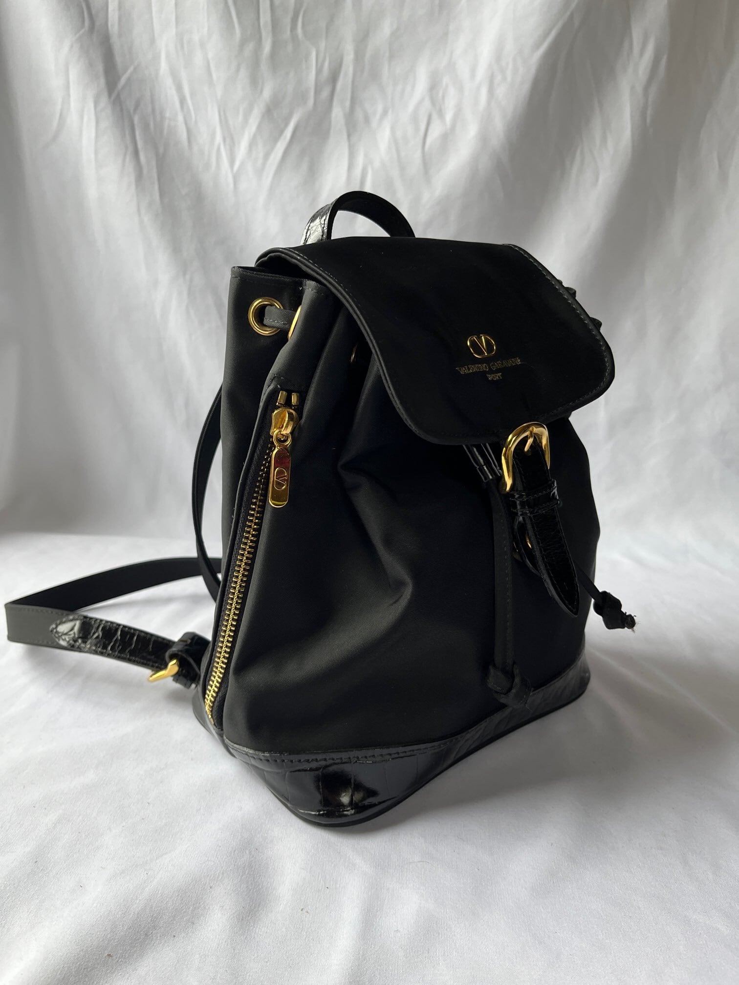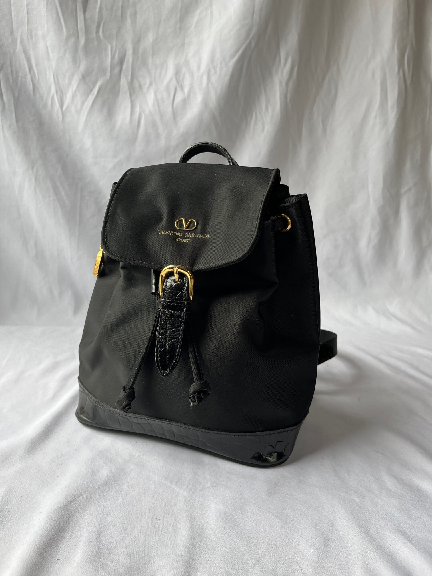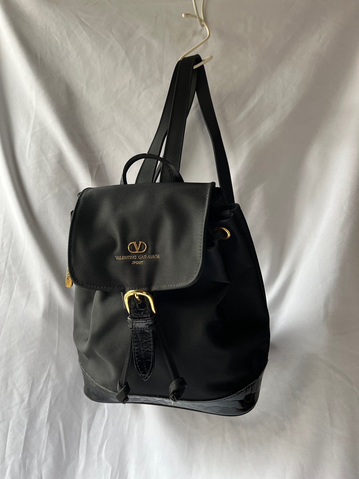 ナイロン素材がスポーティーなValentino のVintageリュック、つやのあるブラックエナメル地が アクセントに効いていて抑揚のあるデザイン☆サイドジップつきで機能性も高い一品です。