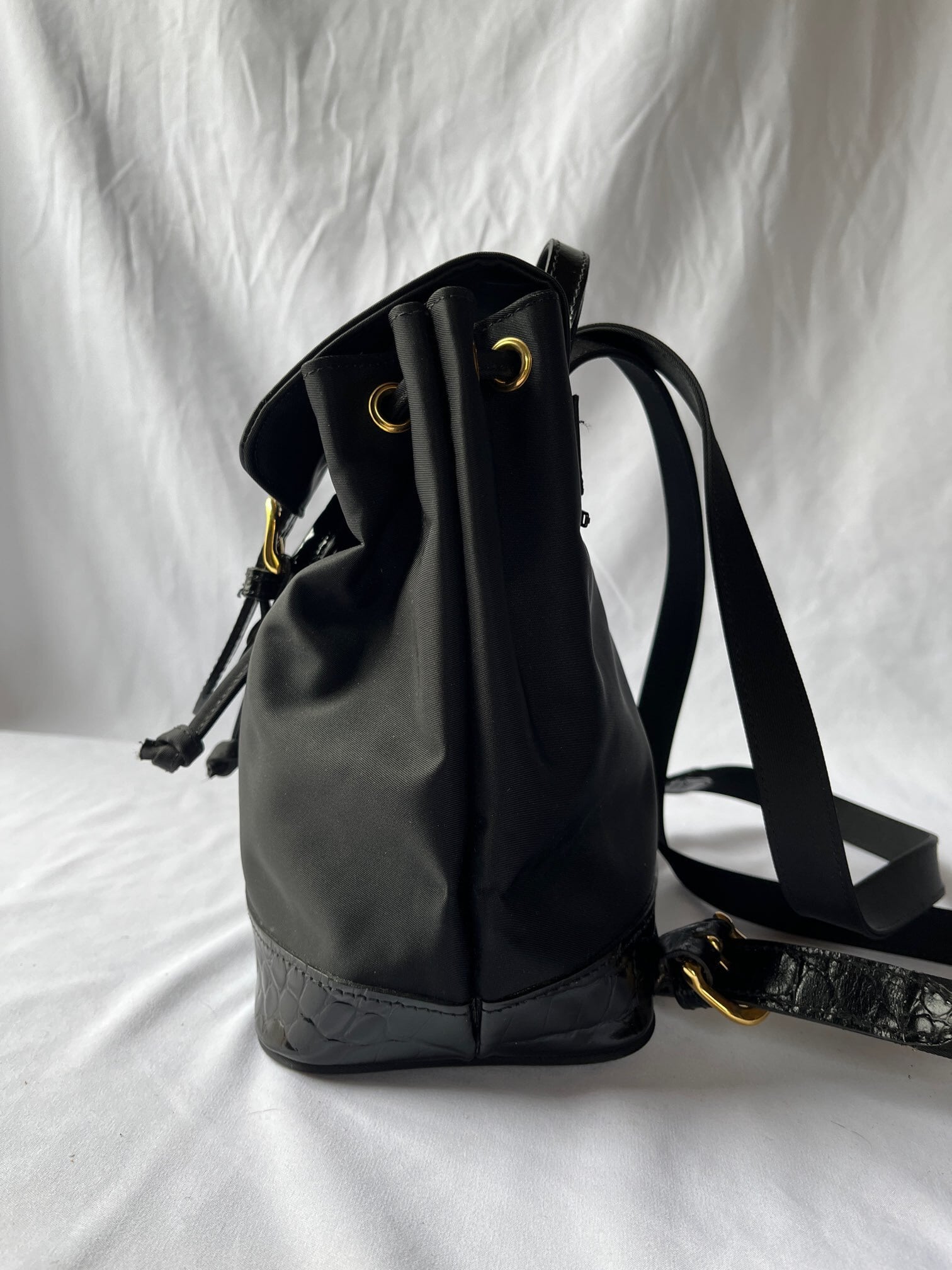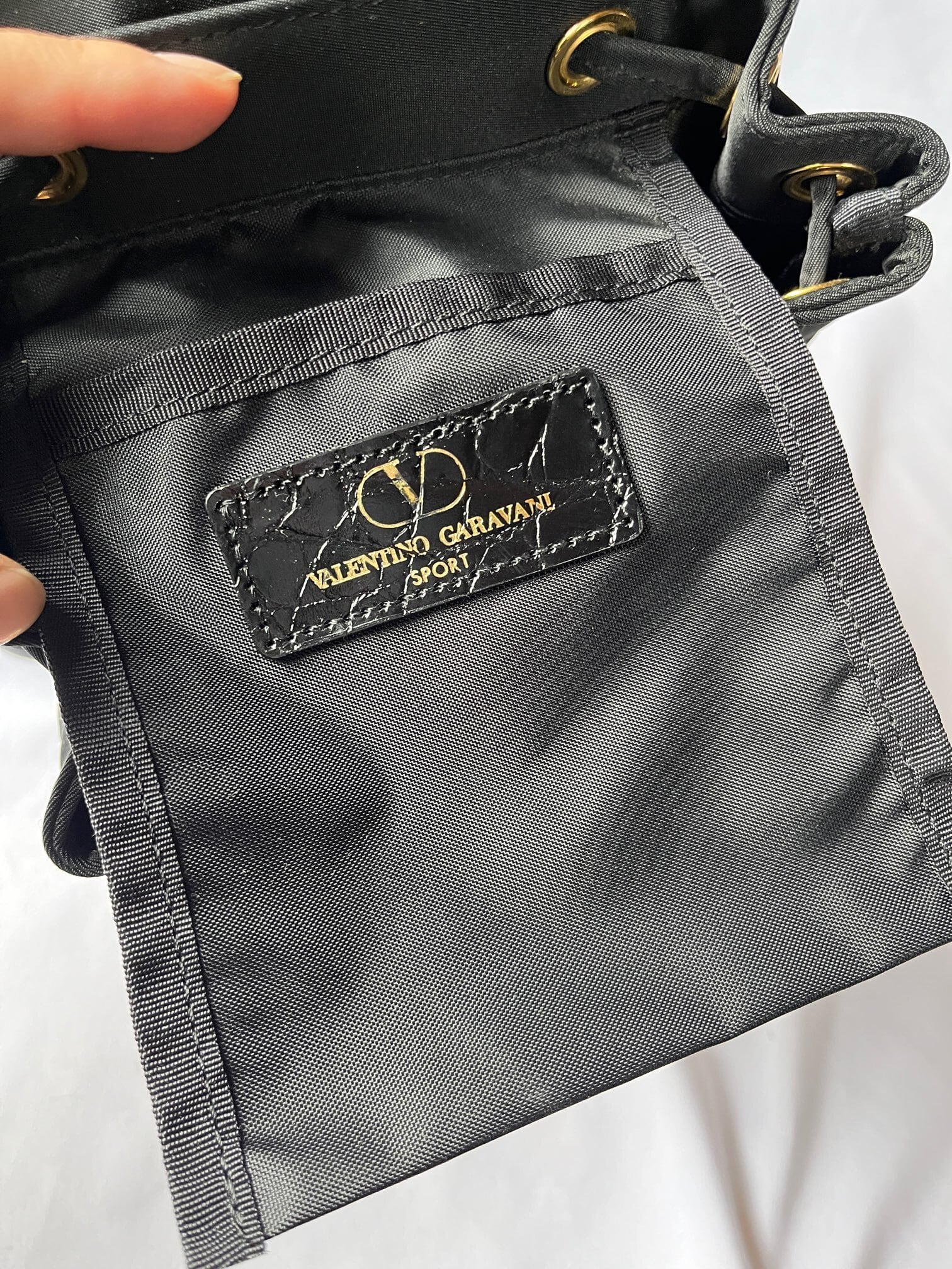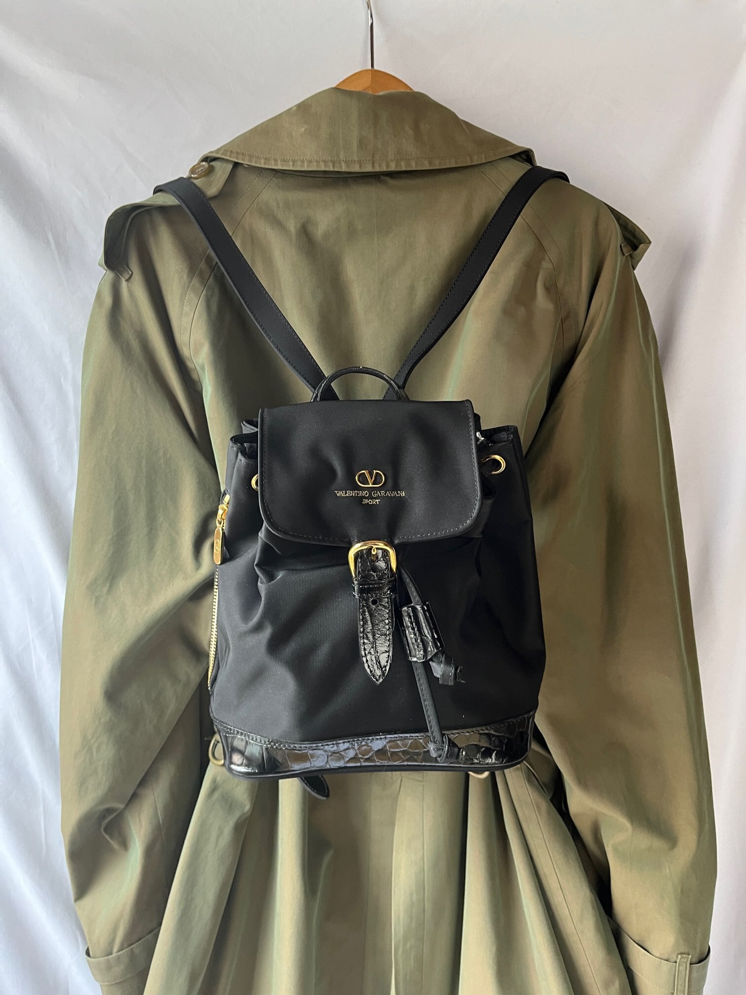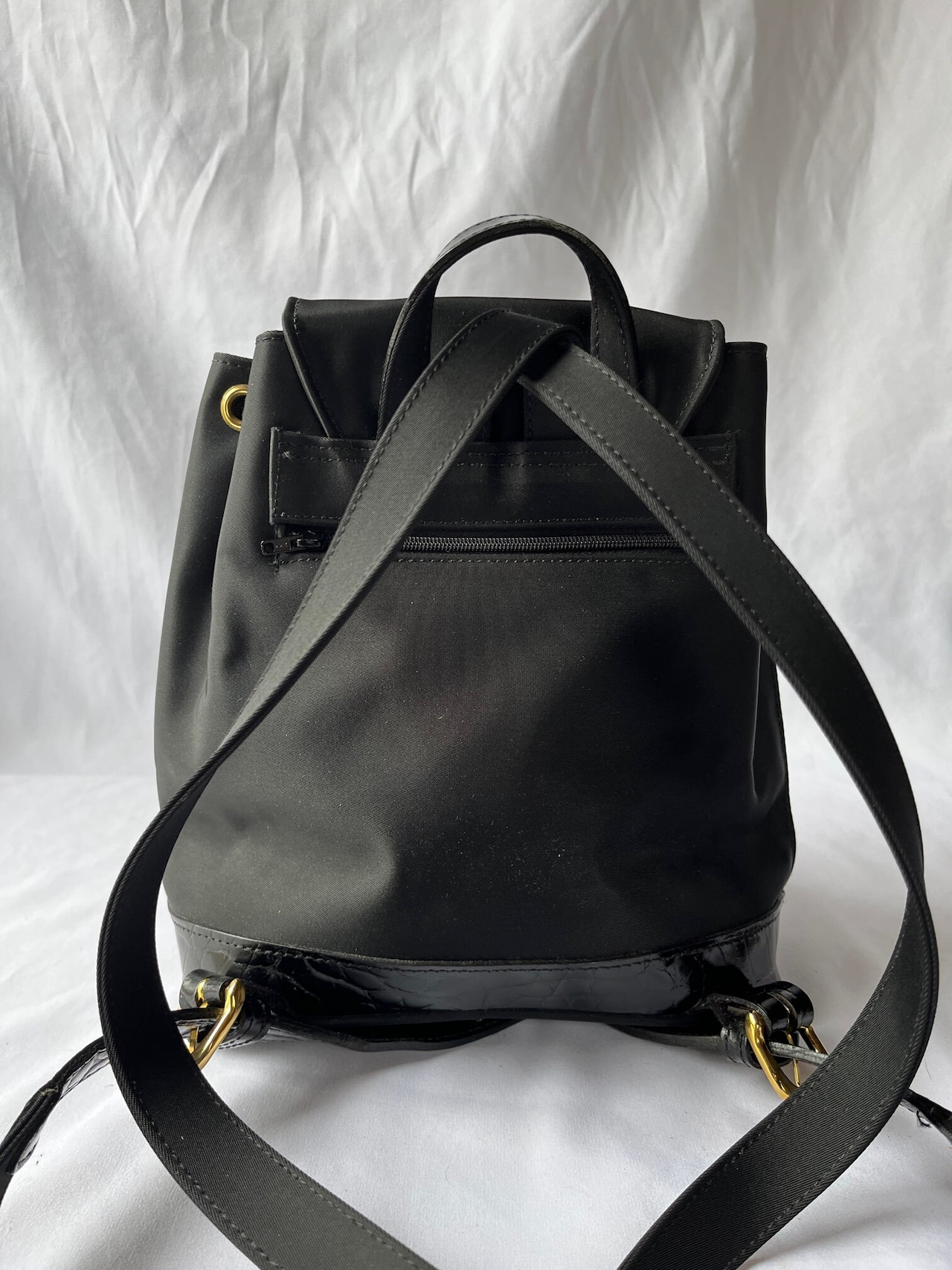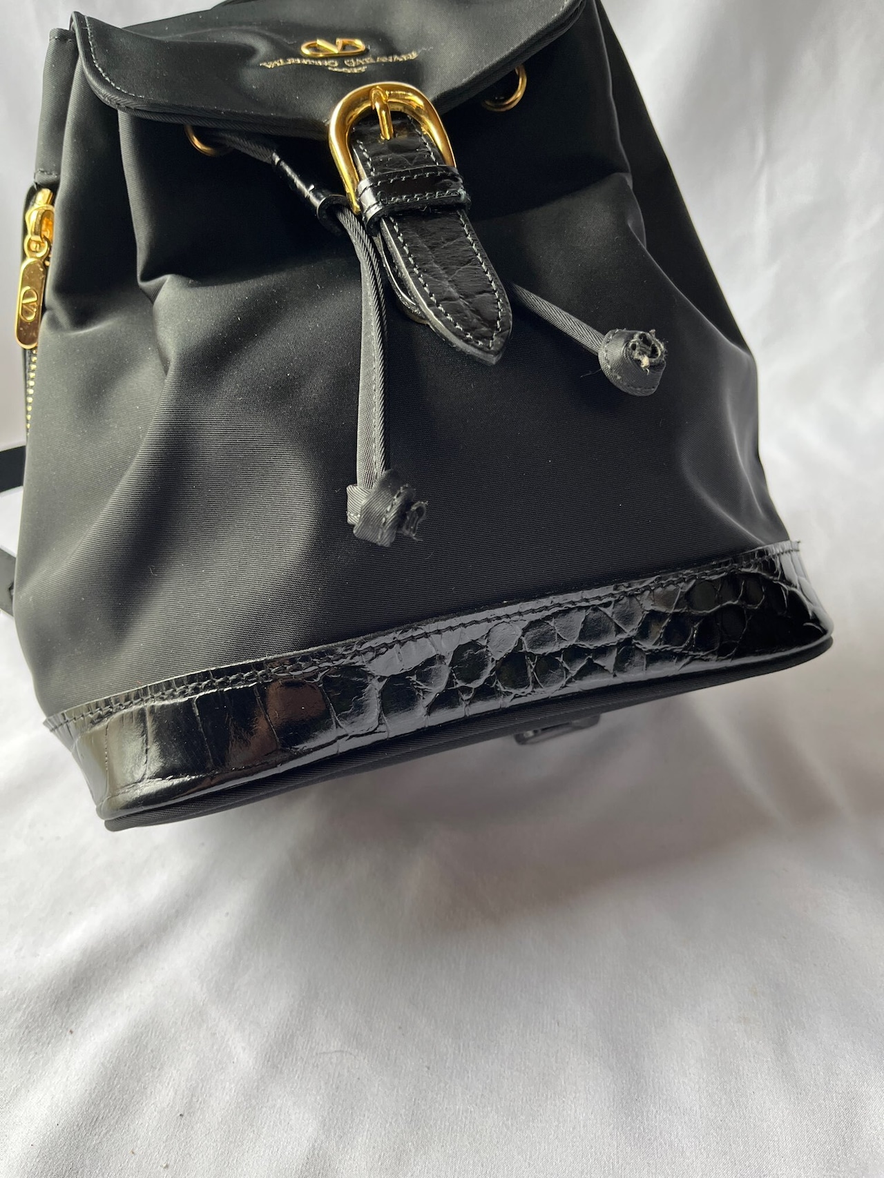 ナイロン素材がスポーティーなValentino のVintageリュック、つやのあるブラックエナメル地が アクセントに効いていて抑揚のあるデザイン☆サイドジップつきで機能性も高い一品です。