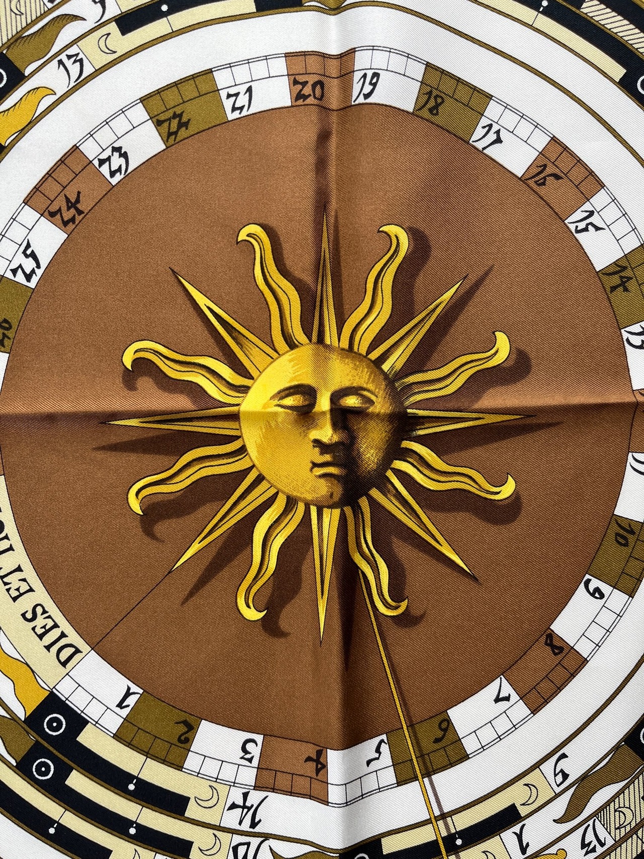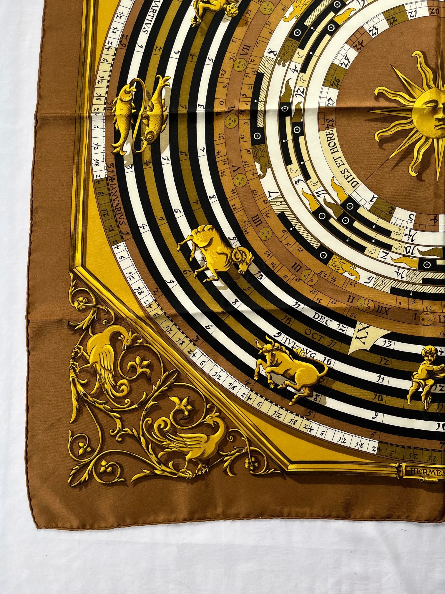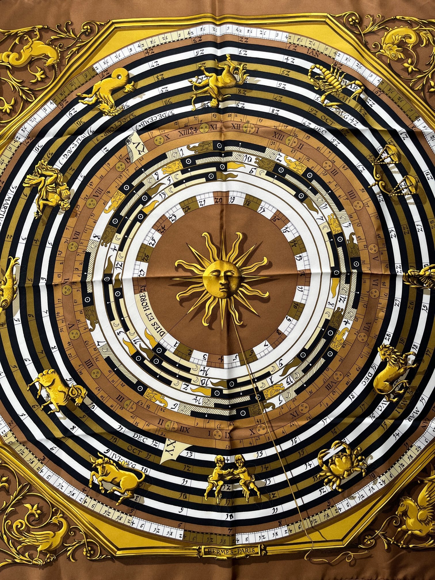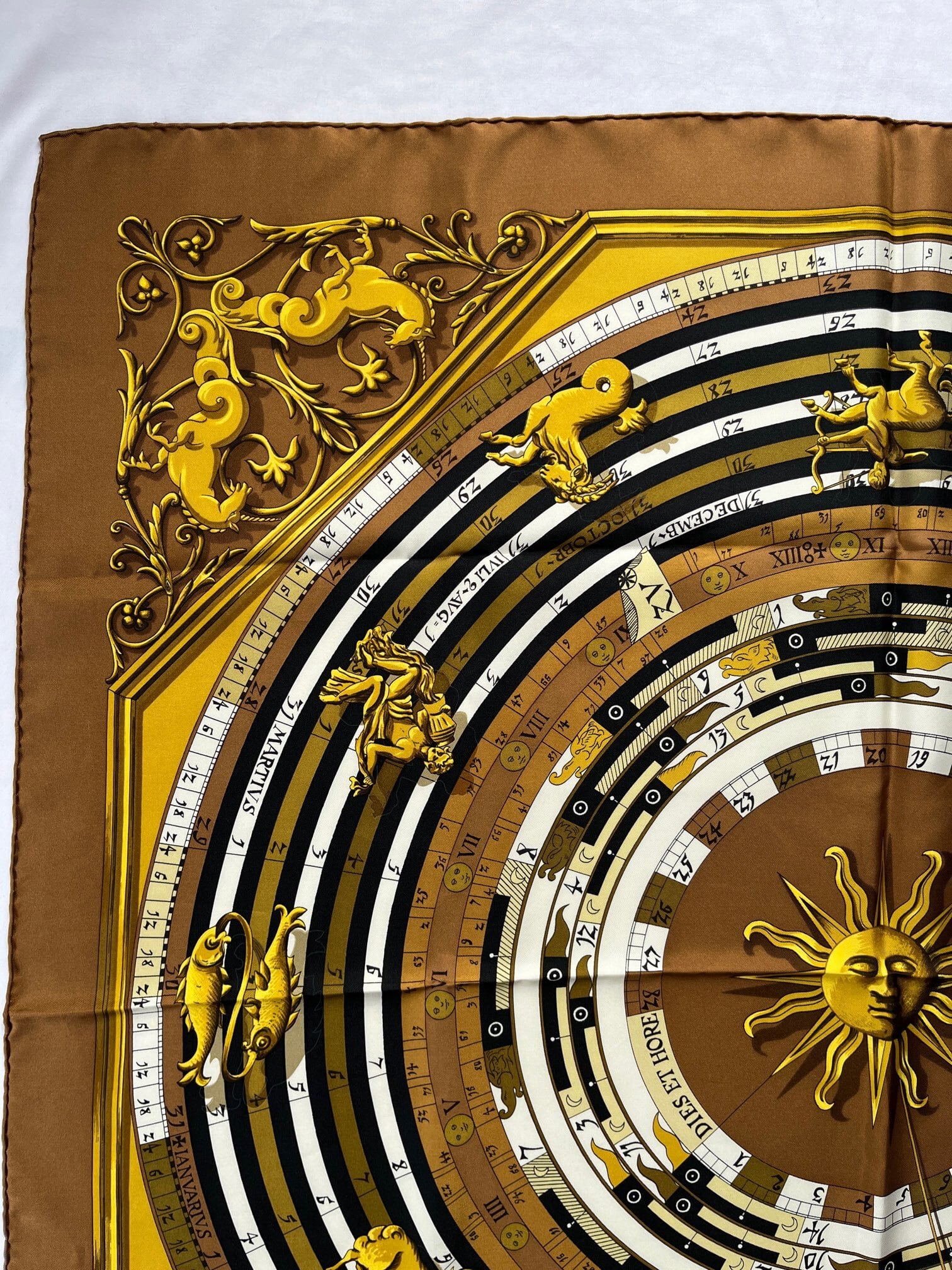 星座の絵柄が神秘的なHERMES Vintageスカーフ細かい暦のデザインが時の流れと“運命”を感じる 一枚。つやのあるブラウンが気品のあるカラーリングで、 使いやすさも魅力的です。