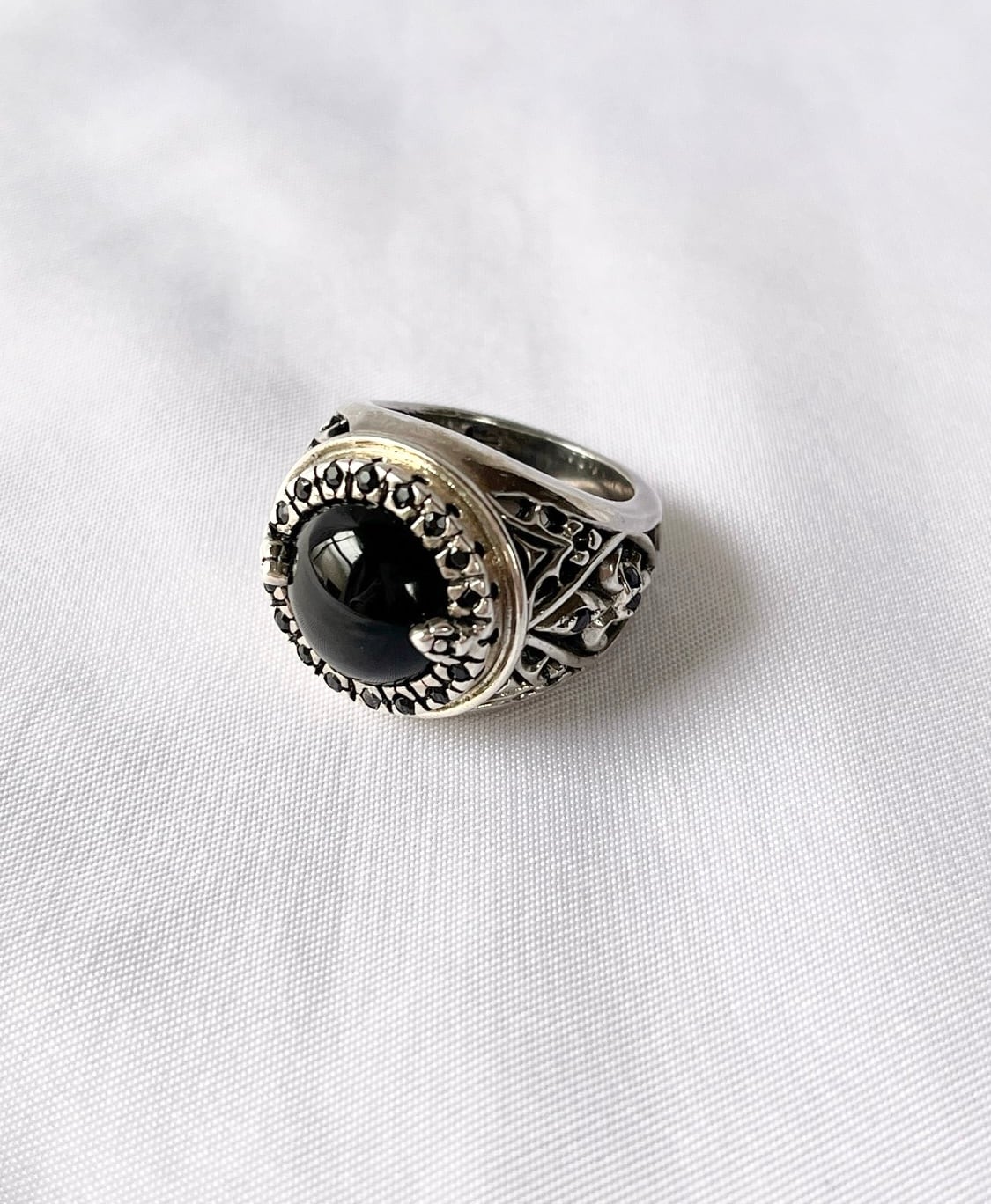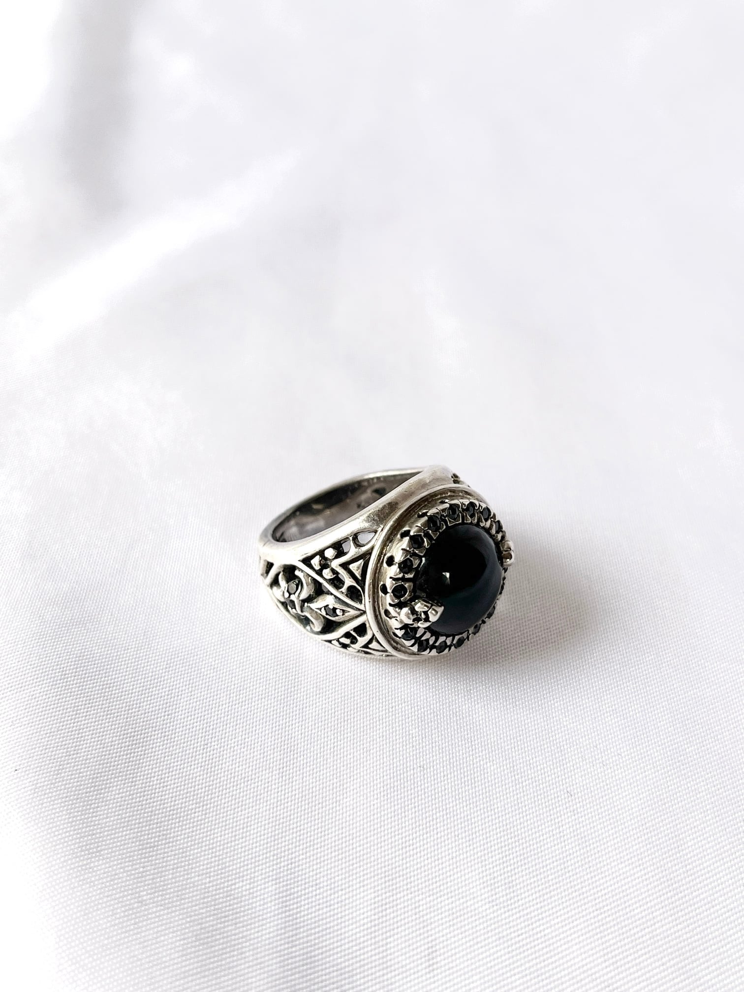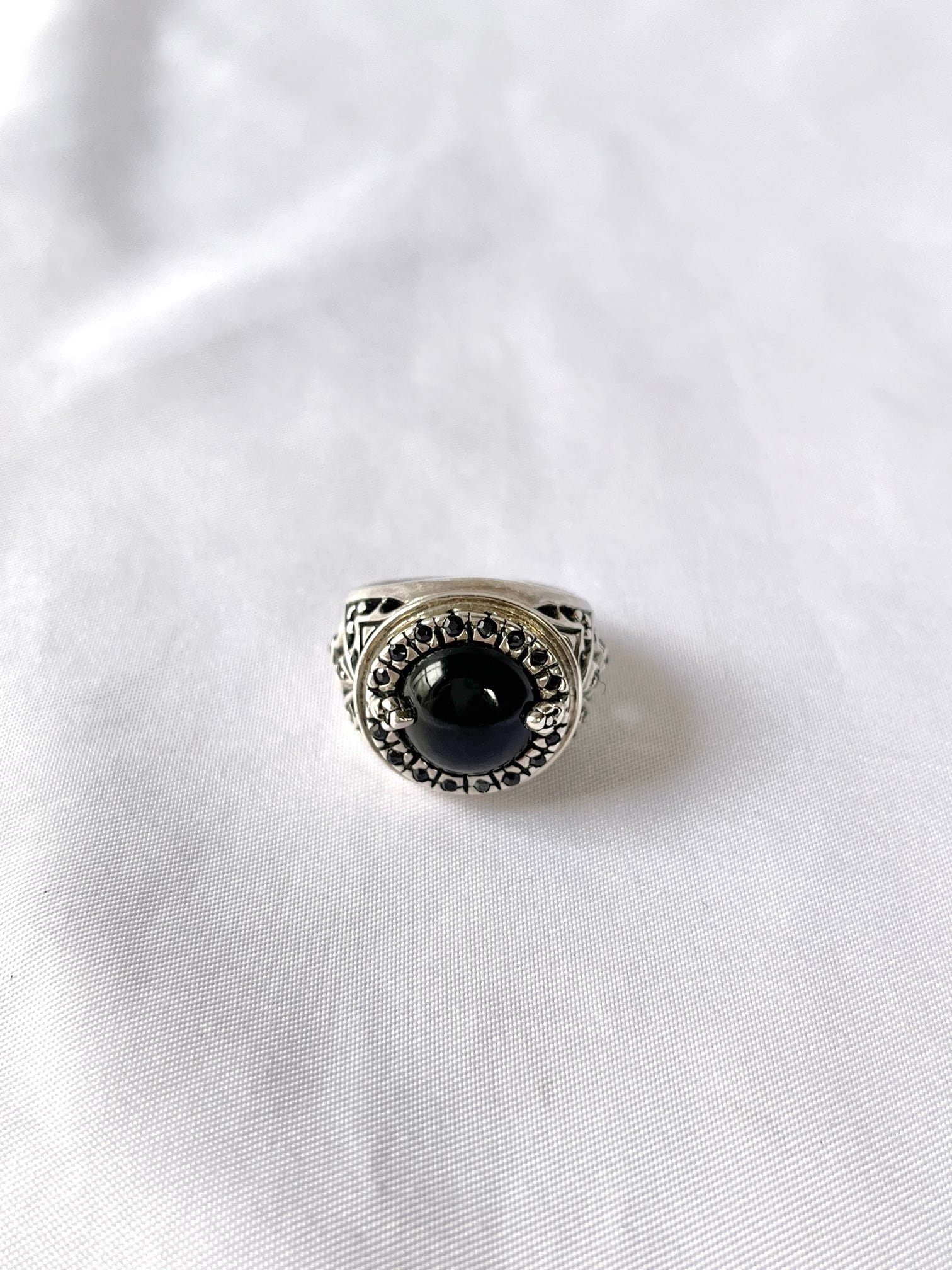 大きなセンターのブラックストーンに、小さなブラックのラインストーンがキラキラと輝くVintage Silver925 リング