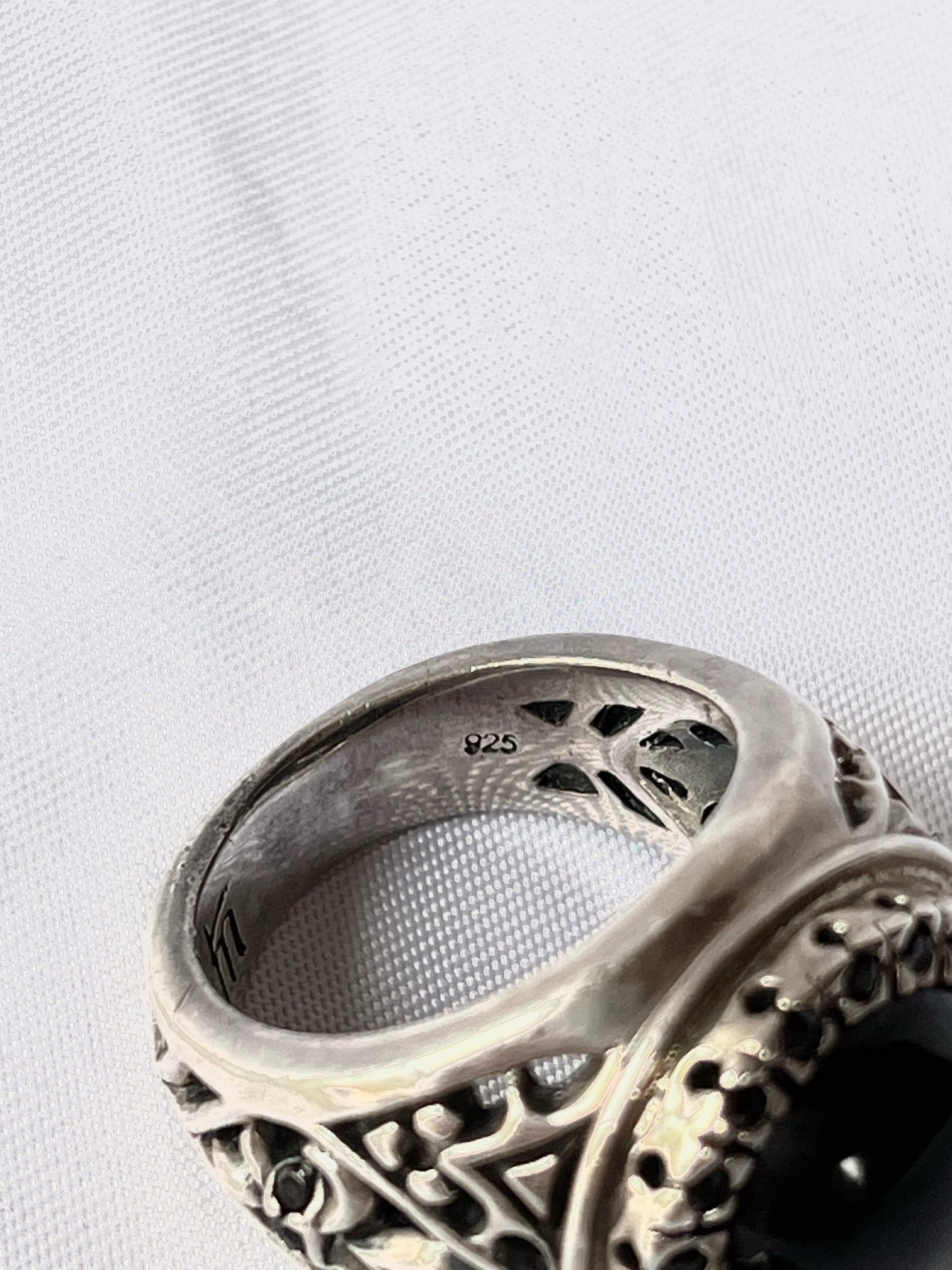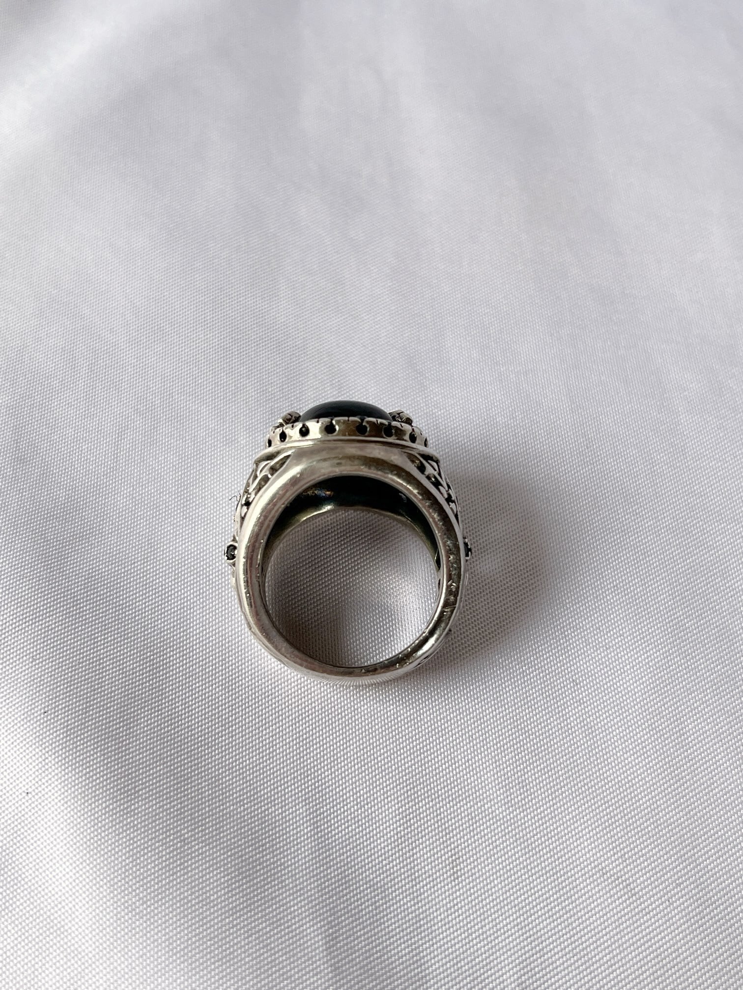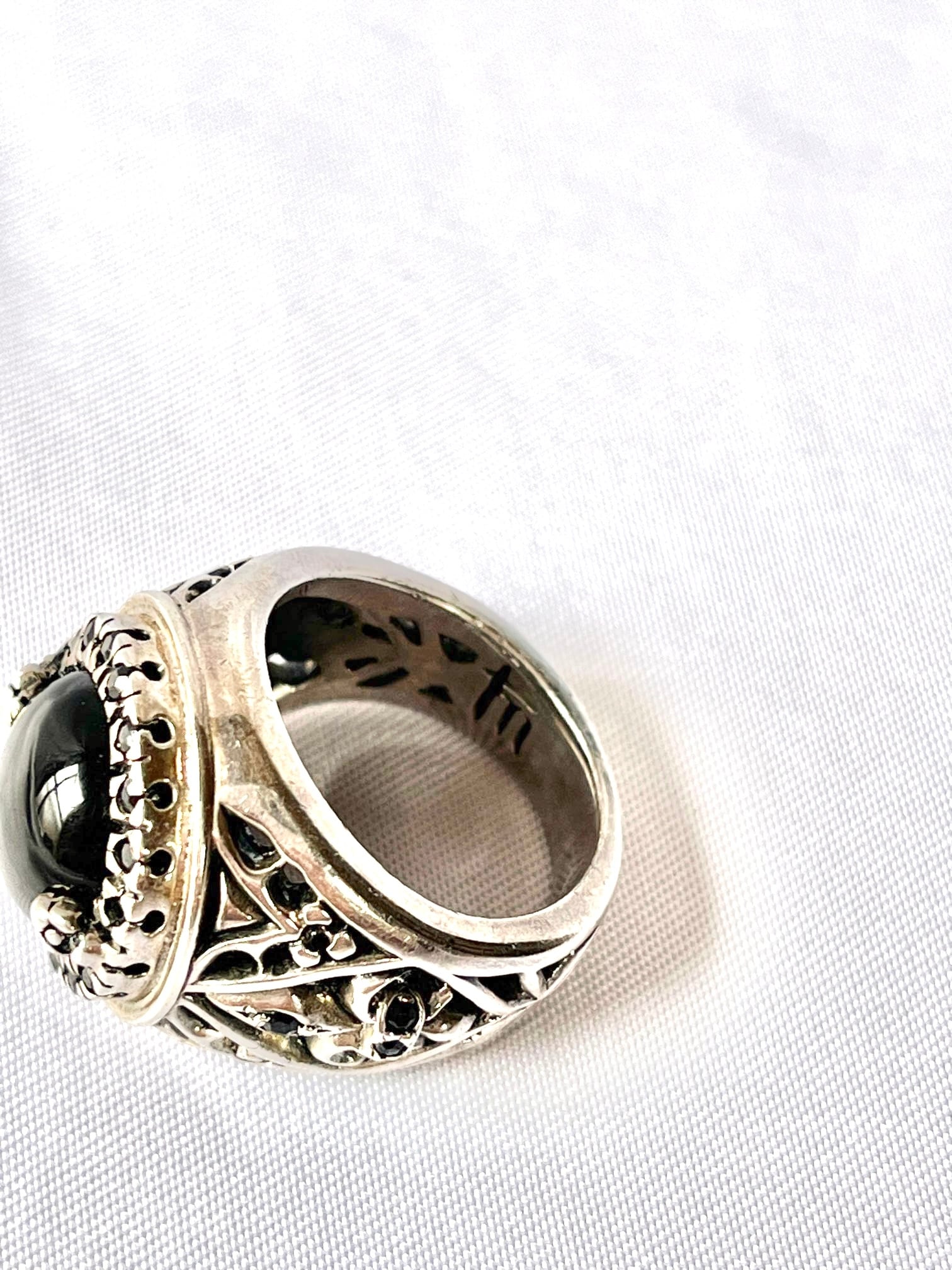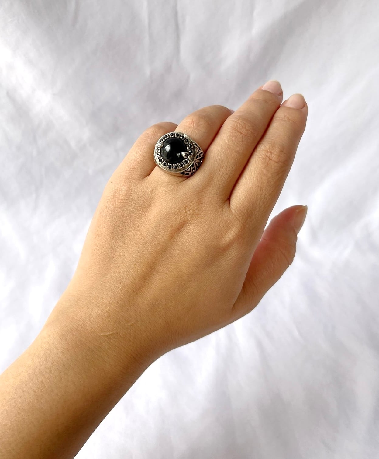 大きなセンターのブラックストーンに、小さなブラックのラインストーンがキラキラと輝くVintage Silver925 リング