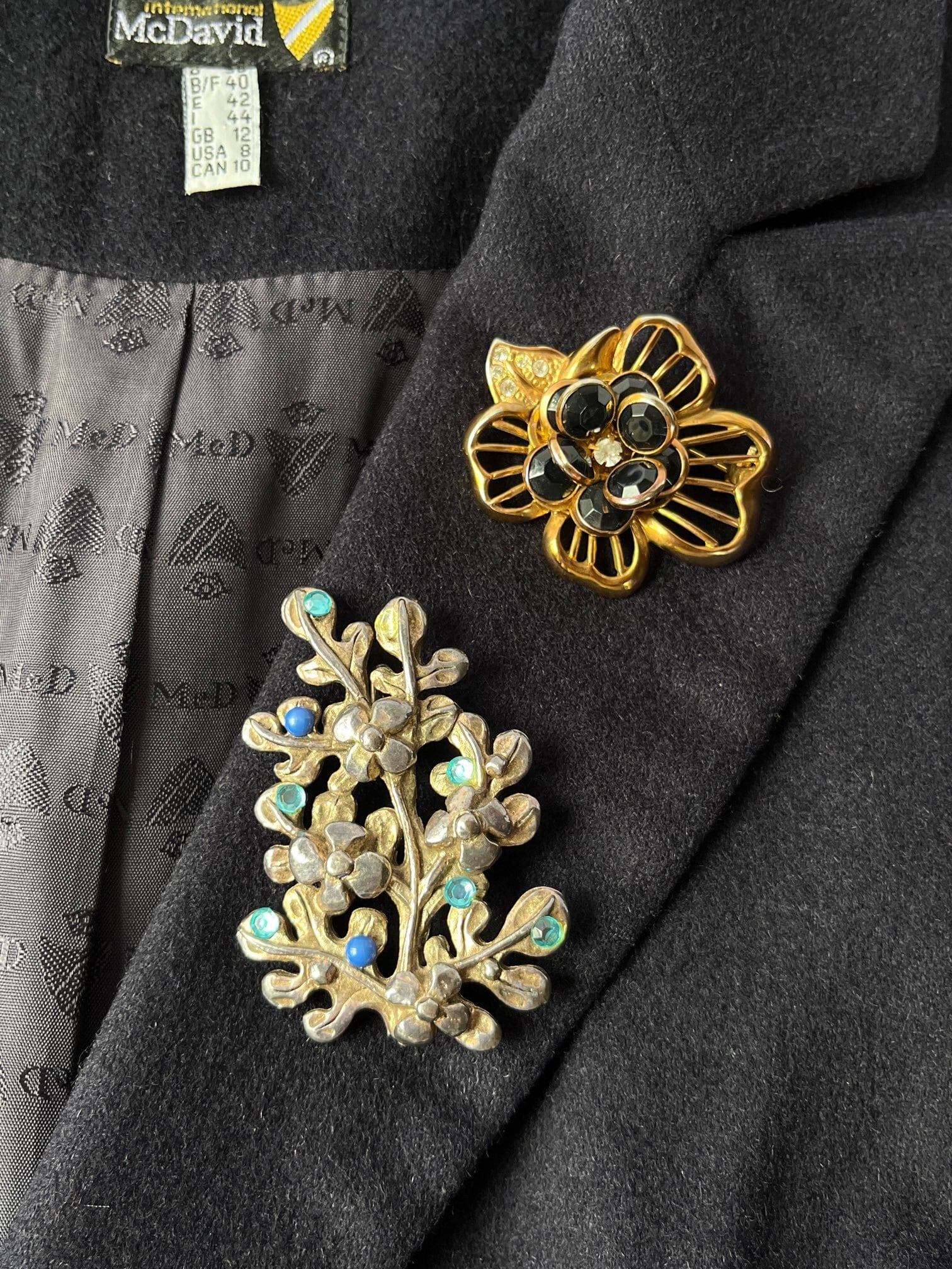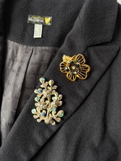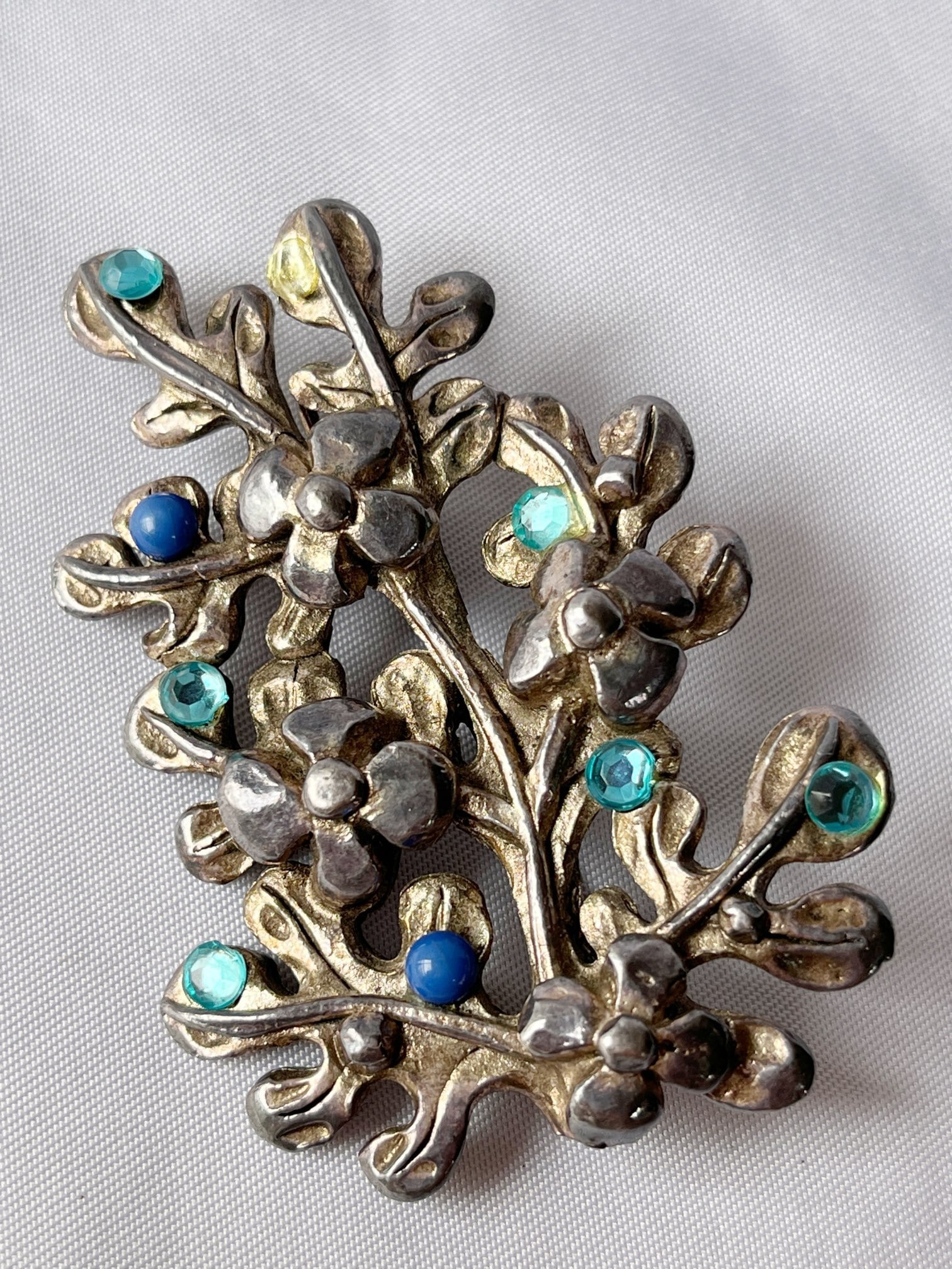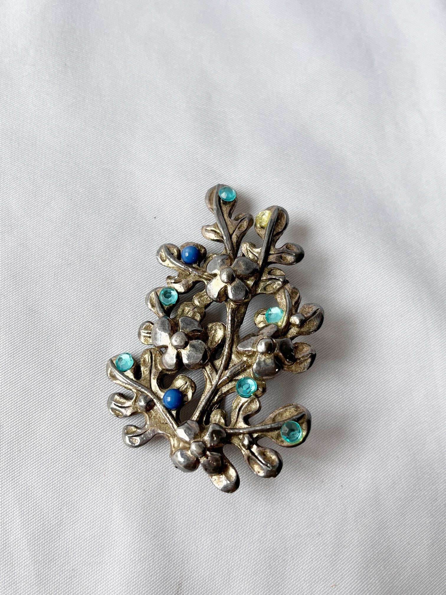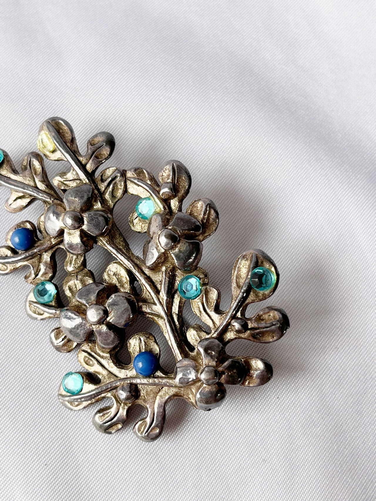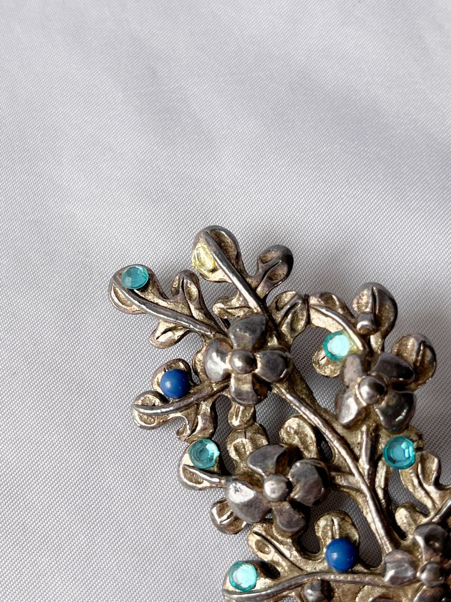 シルバーの木に青い実がなっているようなデザインが ユニークなFrance 60's Vintage ブロ-チ。水色の ラインストーンやブルーがさわやかなアクセント★ 大ぶりなので、華やかな存在感が魅力の一品です。