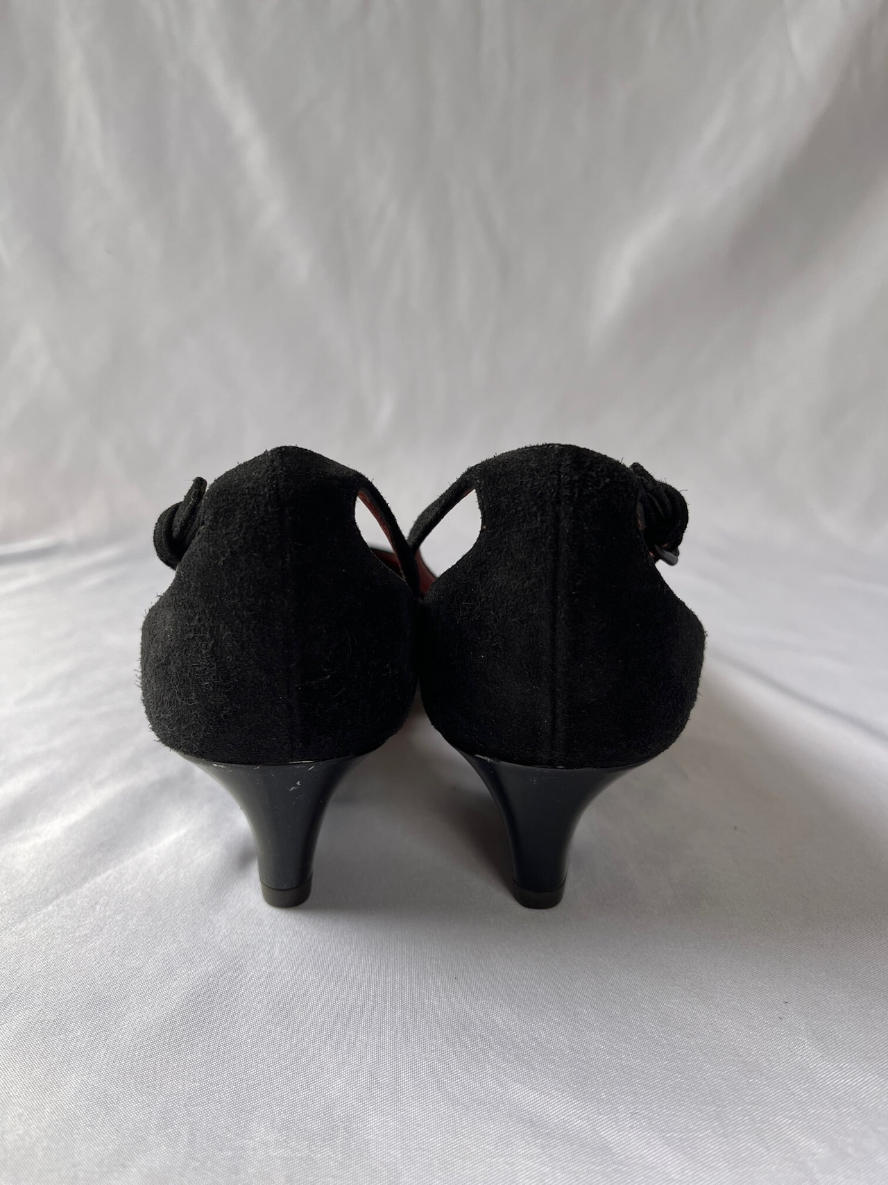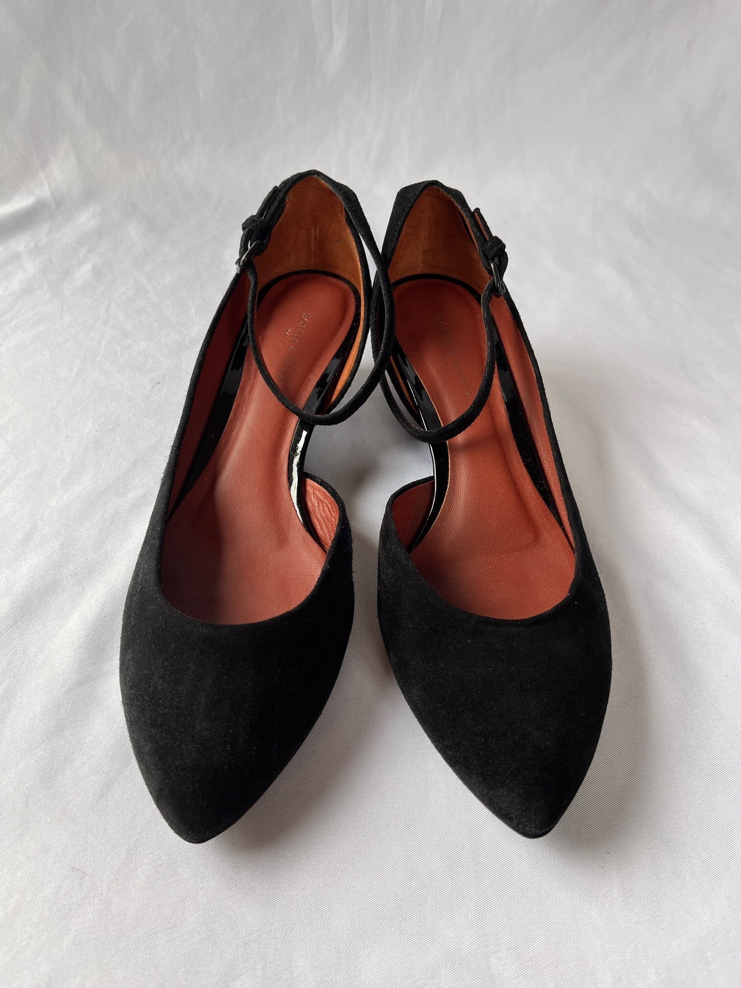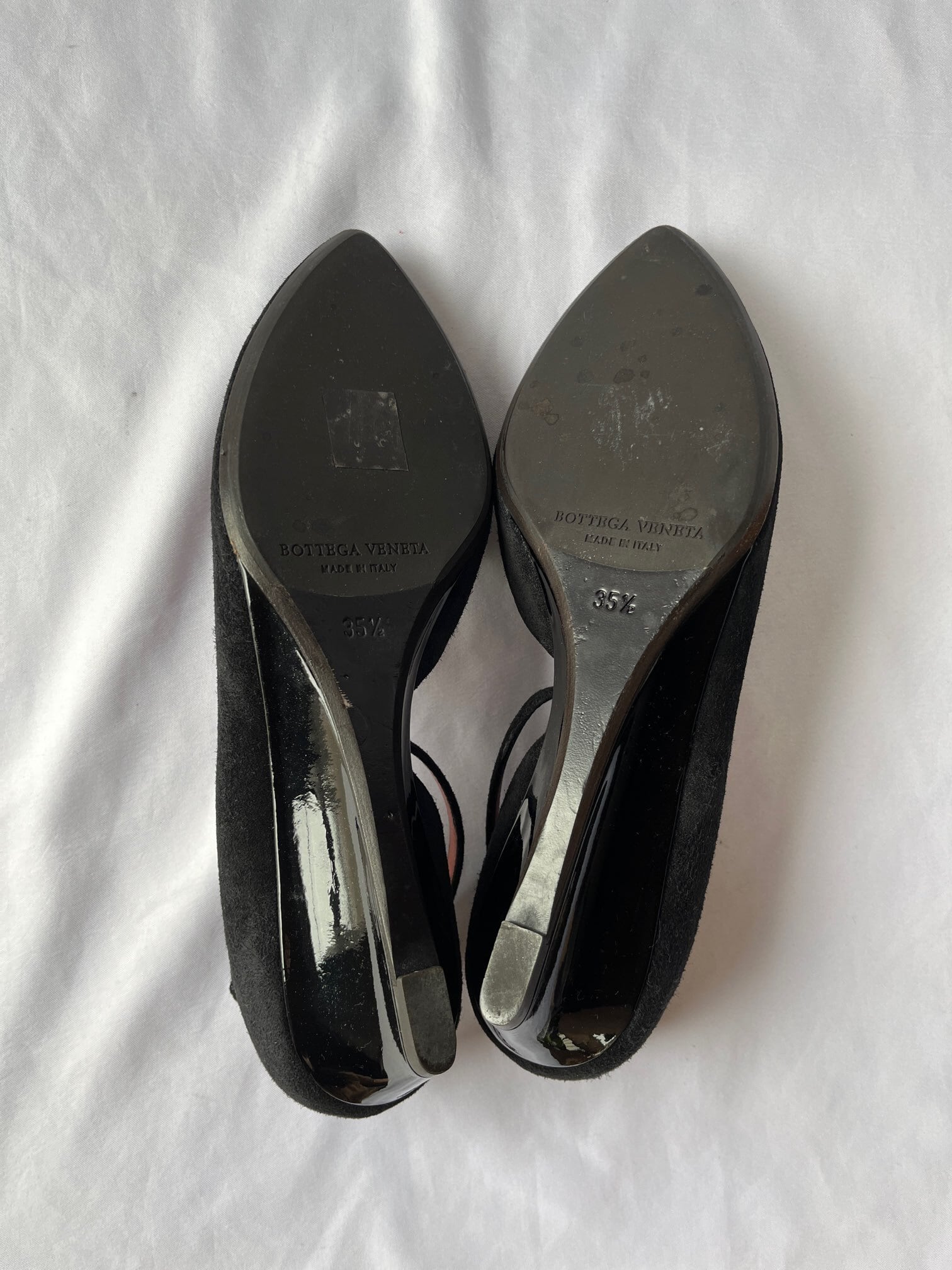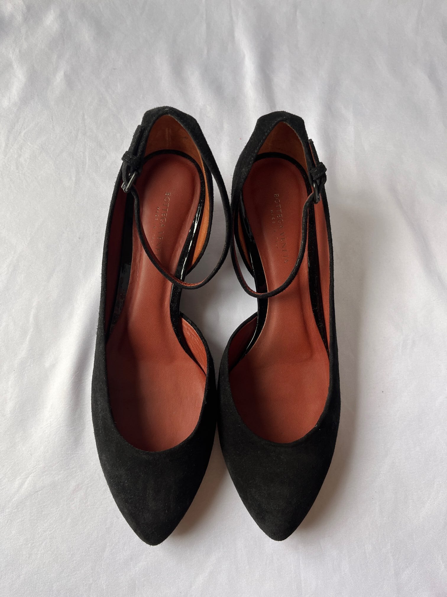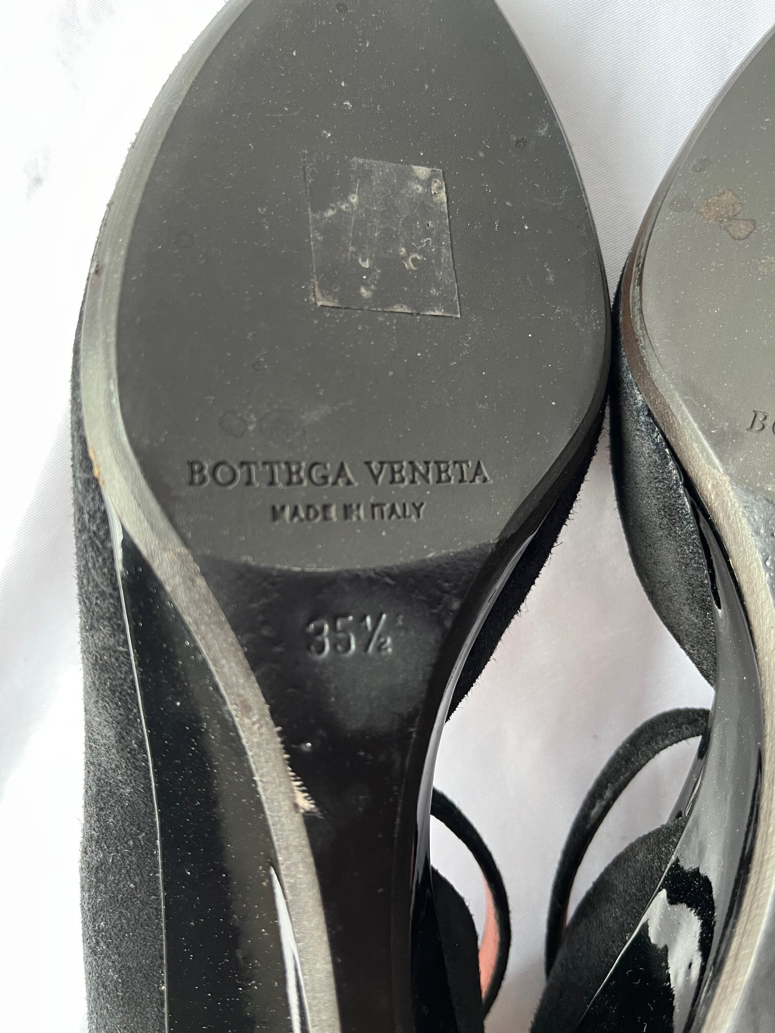 ブラックのスエード地がエレガントなBOTTEGAのパンプス。足首のベルドが華奢でレディな雰囲気が魅力的。エナメルのヒール部分がつややかで異素材が目をひく一品です。