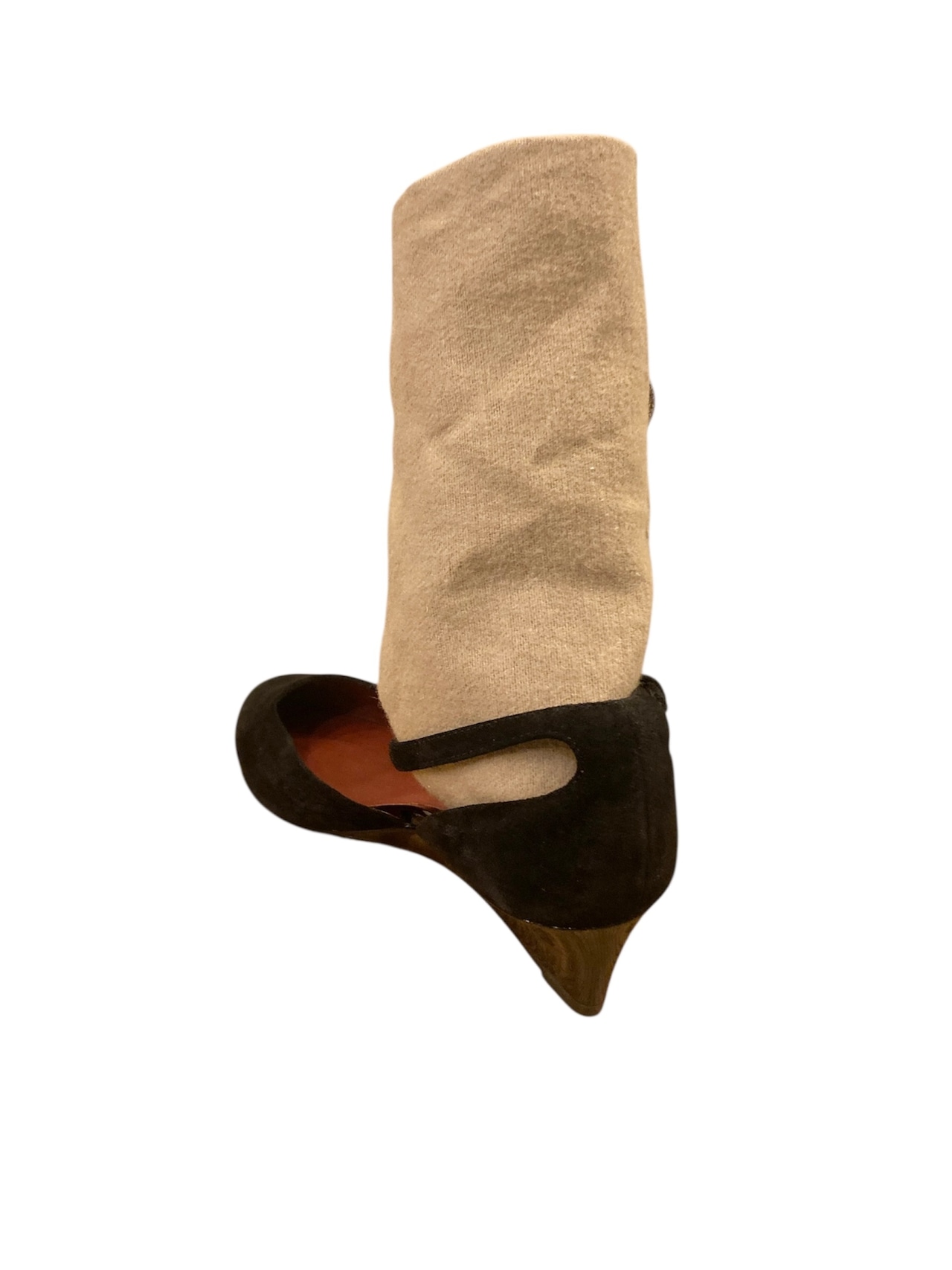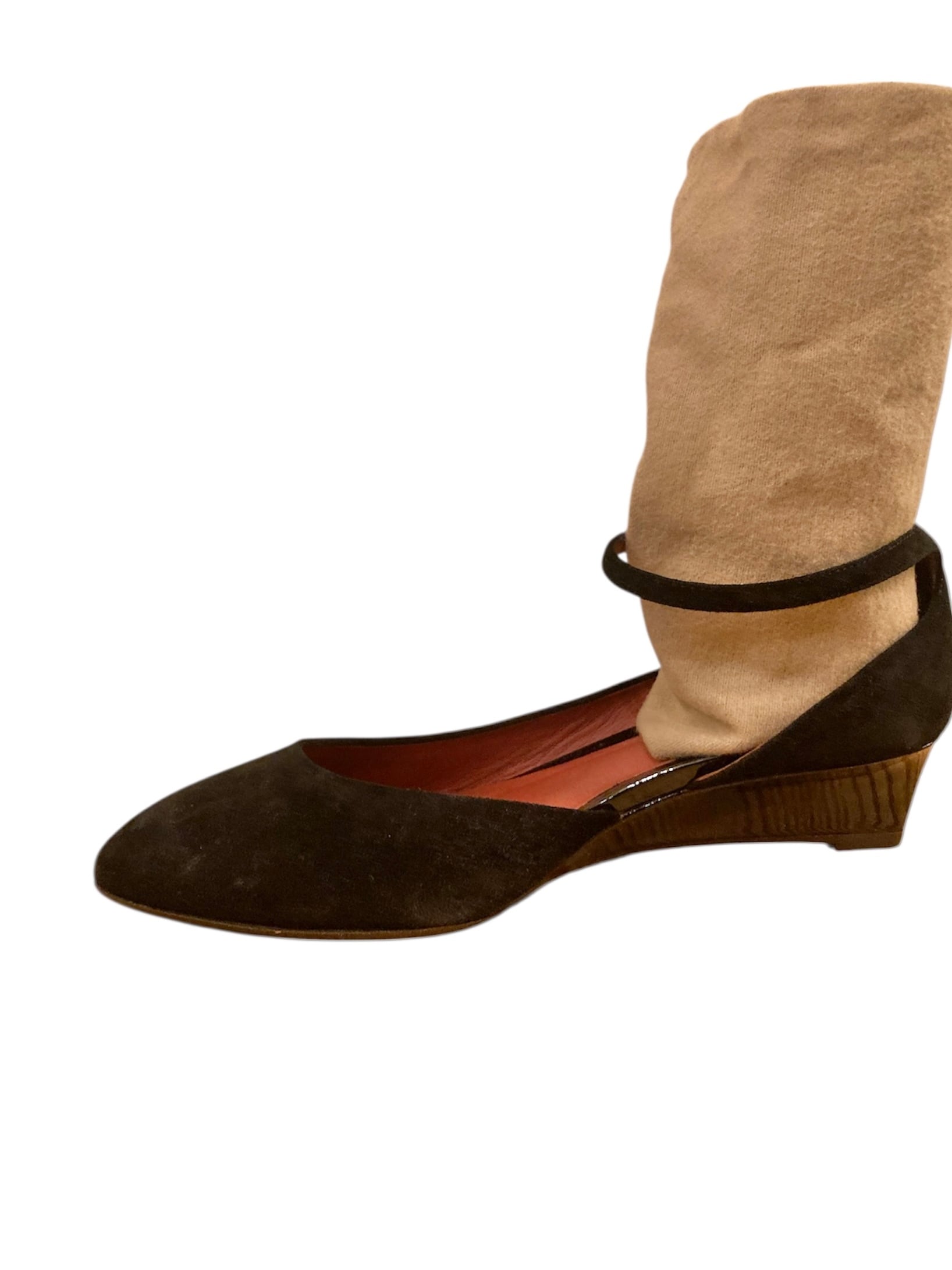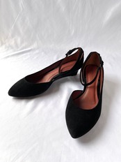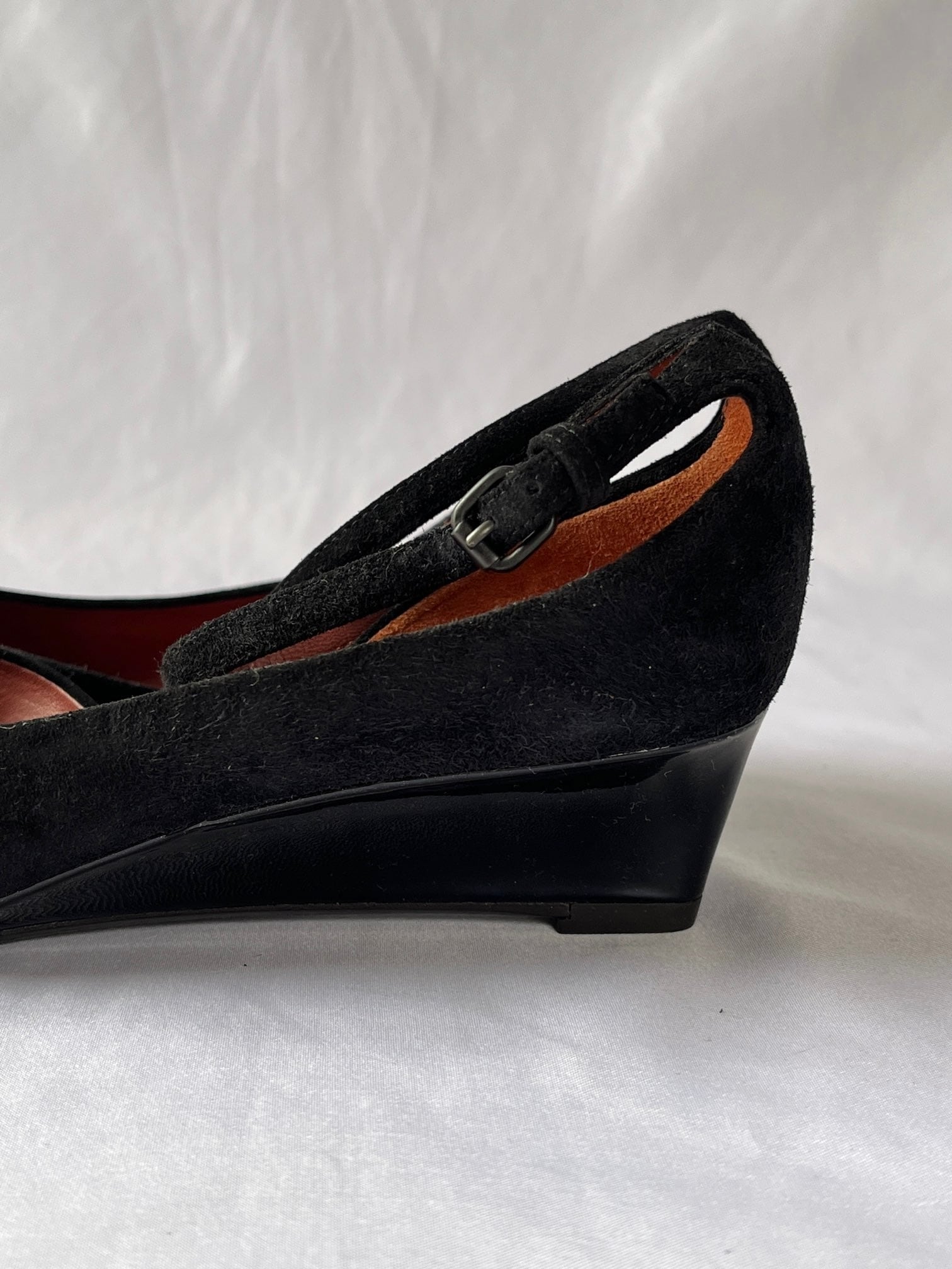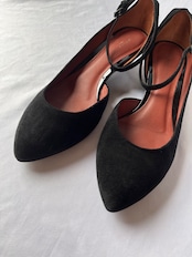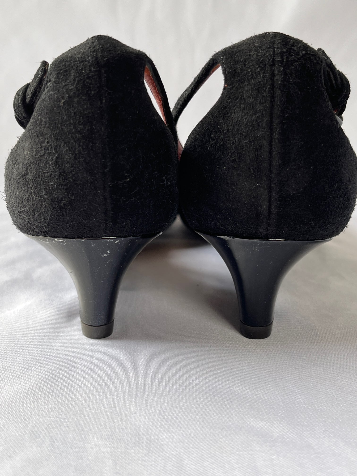 ブラックのスエード地がエレガントなBOTTEGAのパンプス。足首のベルドが華奢でレディな雰囲気が魅力的。エナメルのヒール部分がつややかで異素材が目をひく一品です。