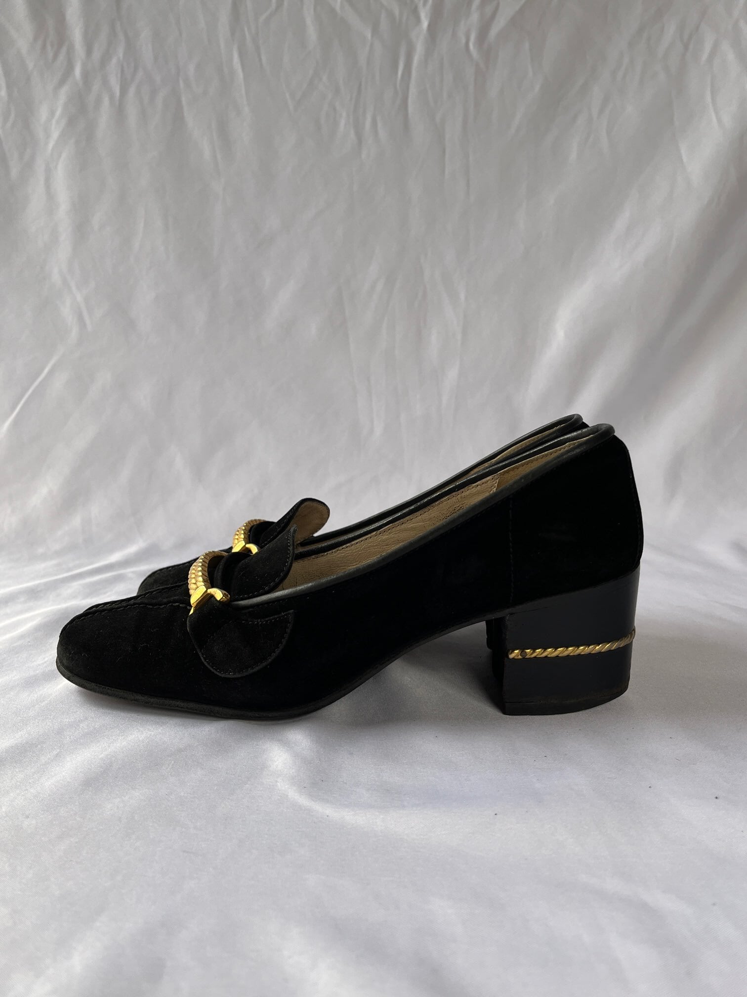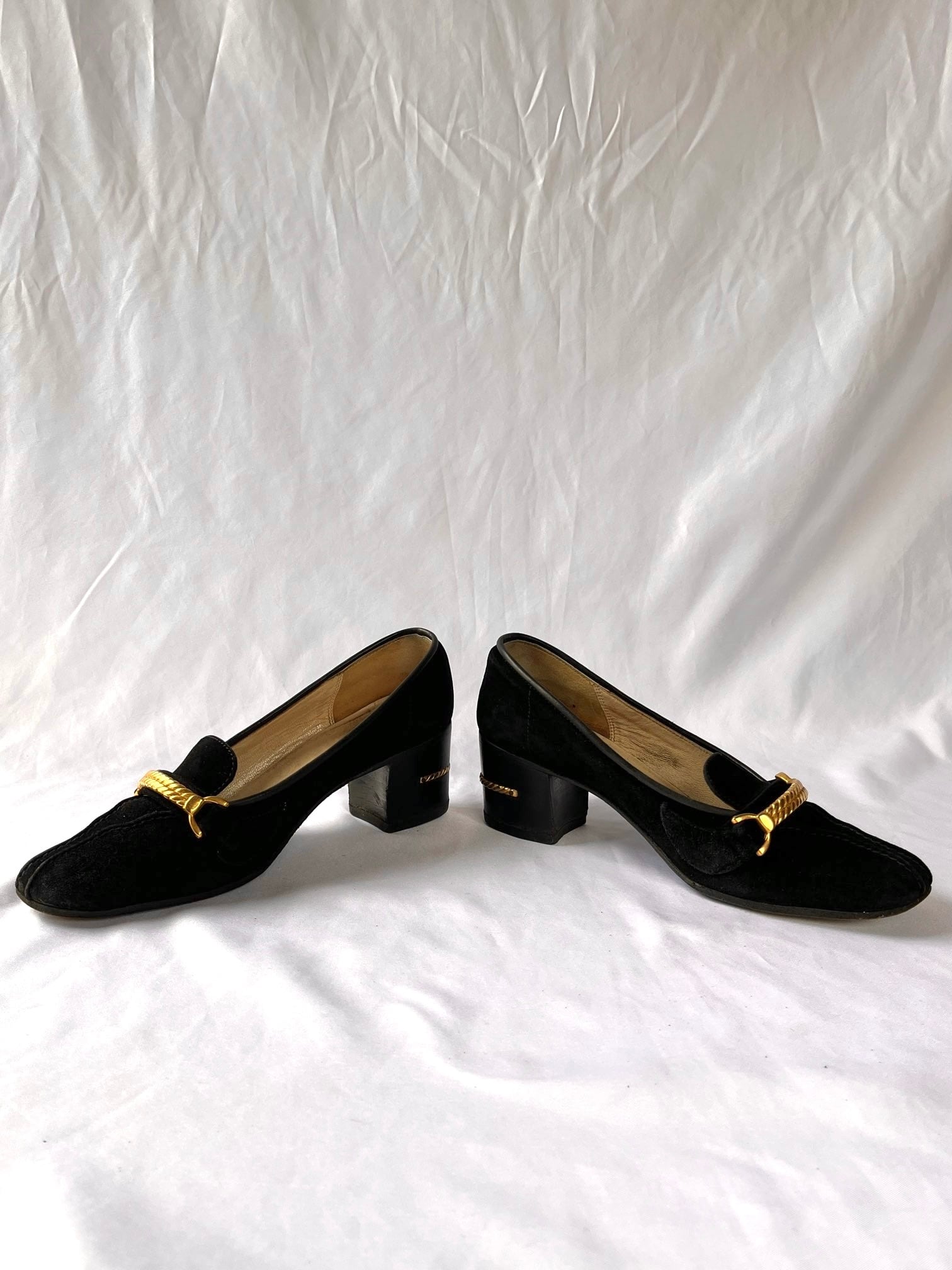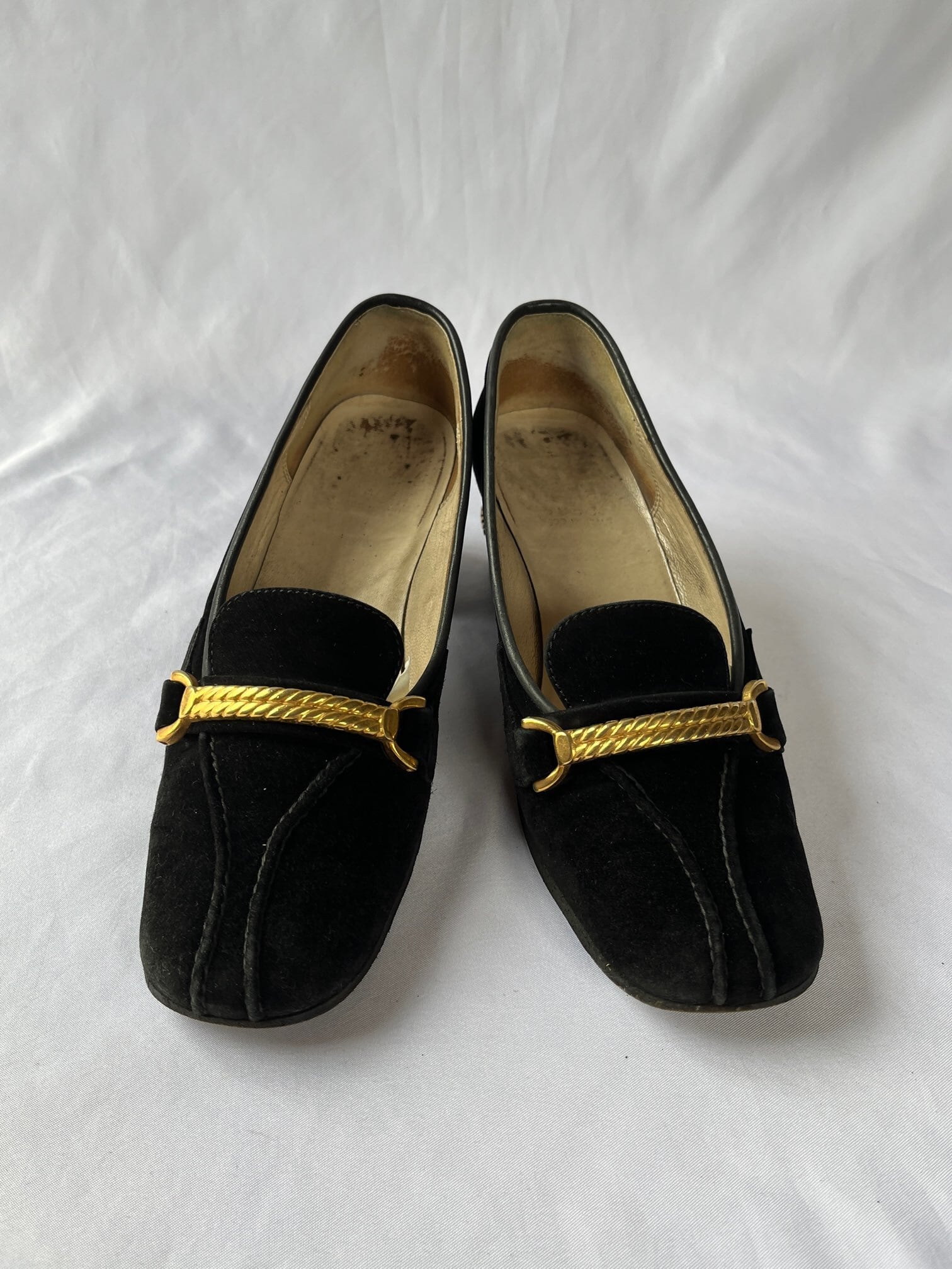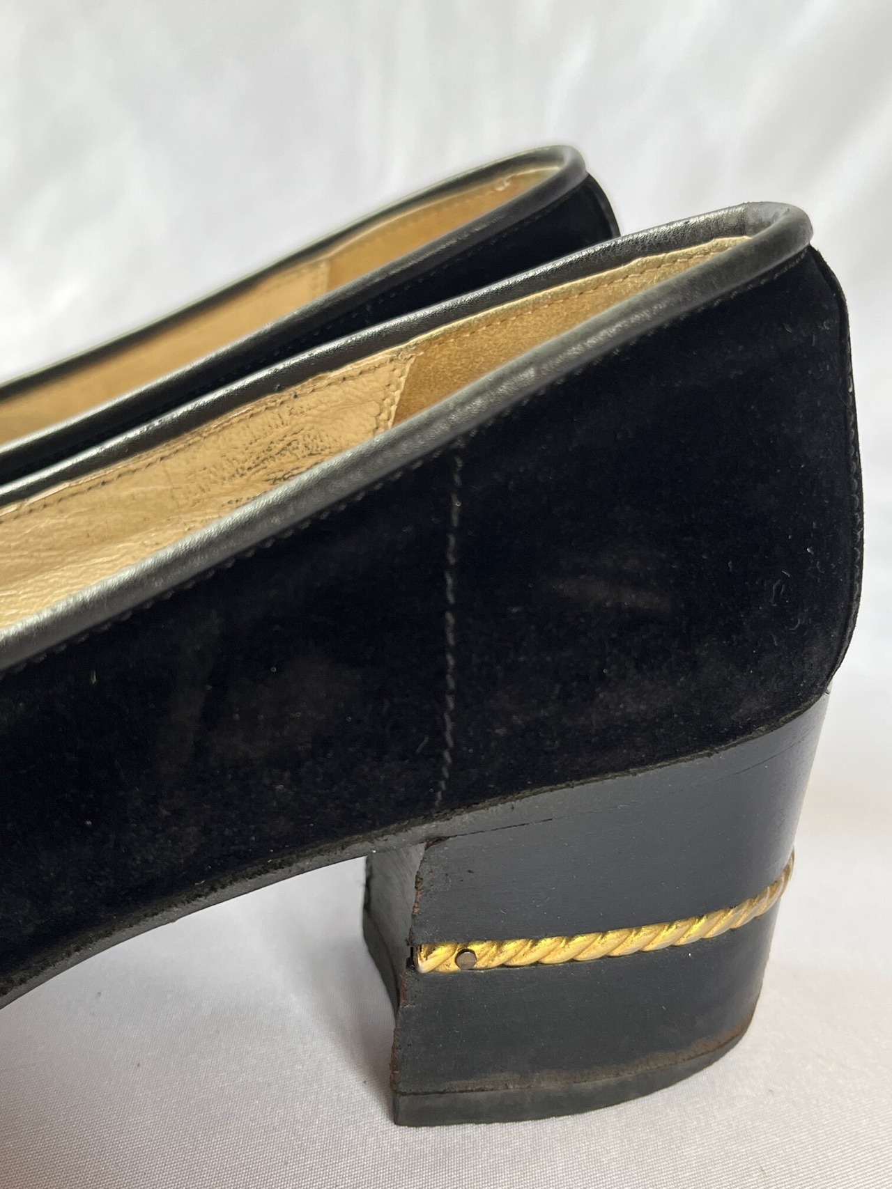 ブラックのスエード地にゴールドチェーンがアクセントに効いたGUCCI 70's Vintage パンプス。