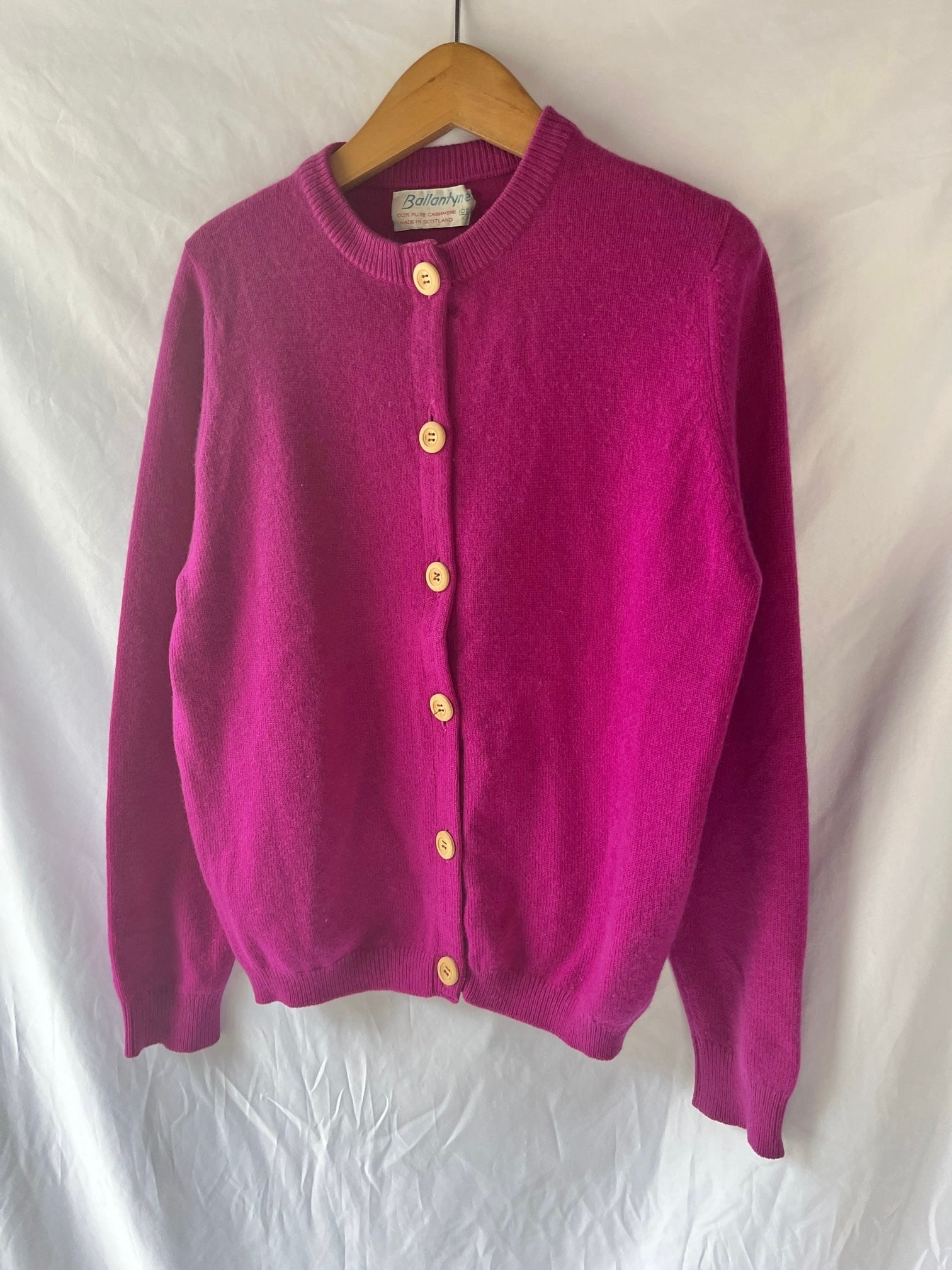鮮やかなパープルピンクにウッドボタンがあたたかみのあるBallantyne のカシミアニットカーデ。柔らかく肌限りの良い極上のカシミア素材がさすがBallantyne。飽きのこないデザインが魅力的です。
