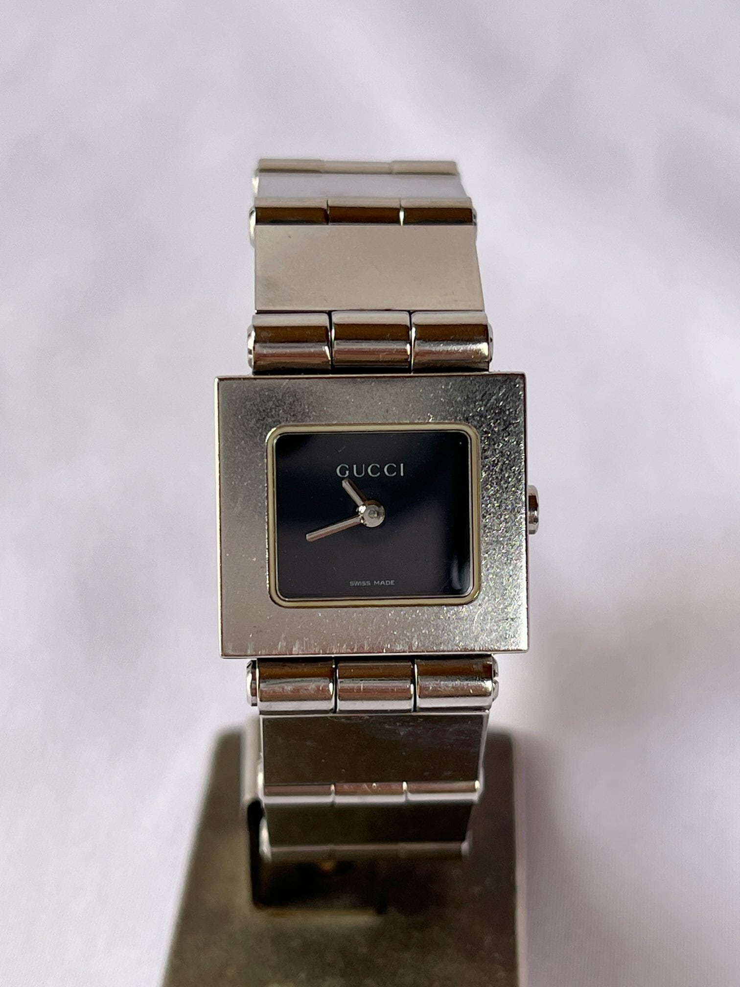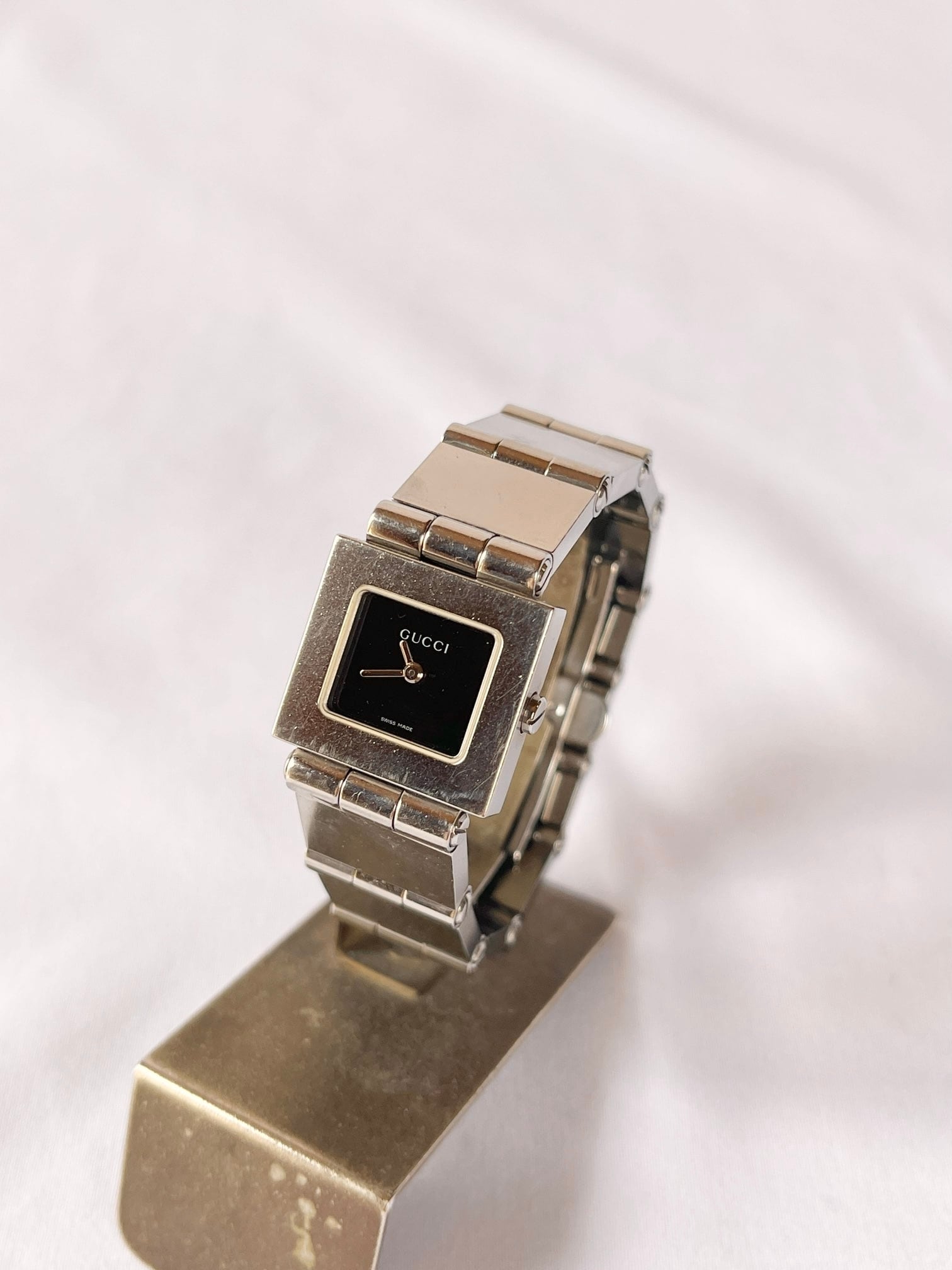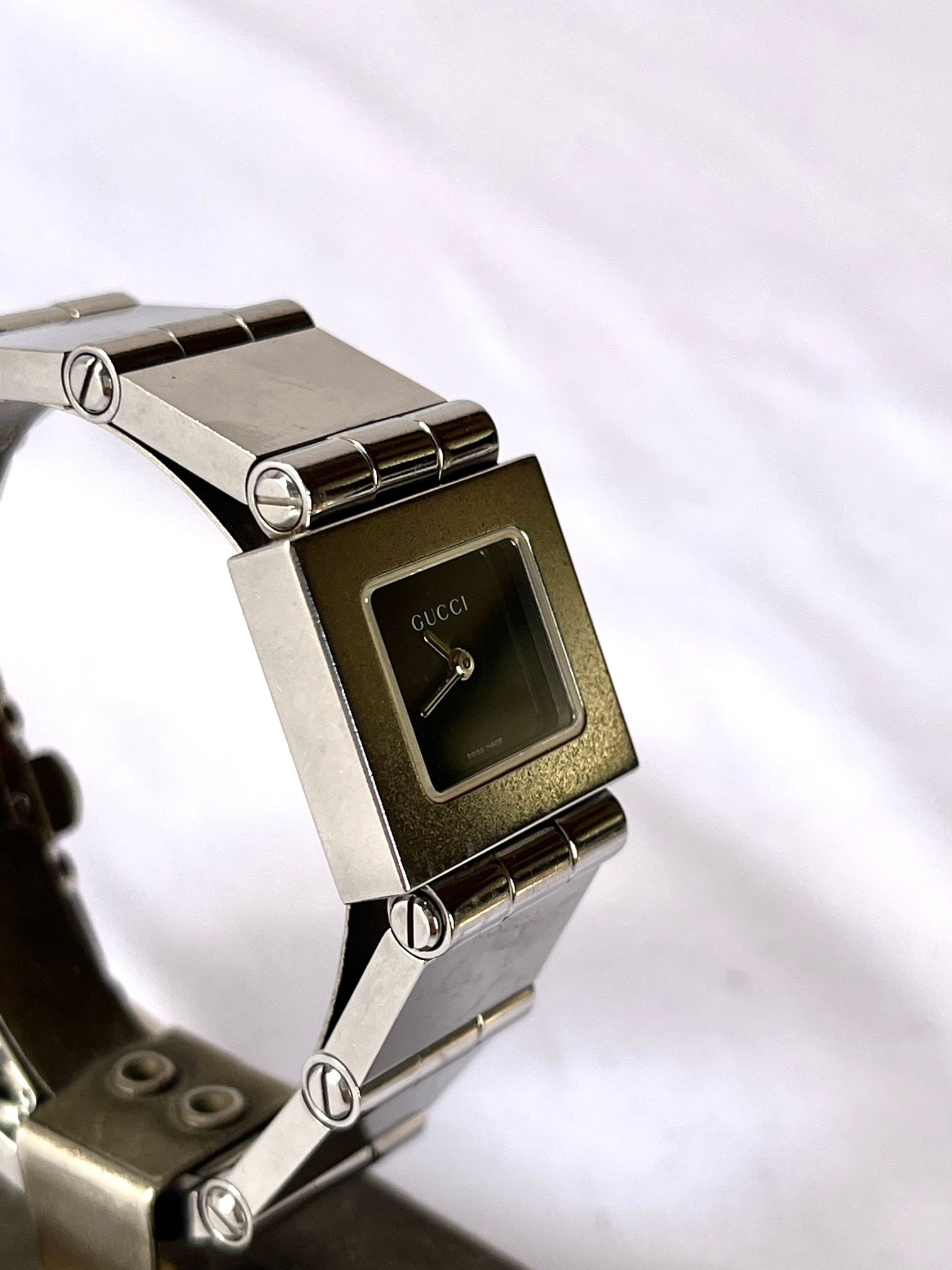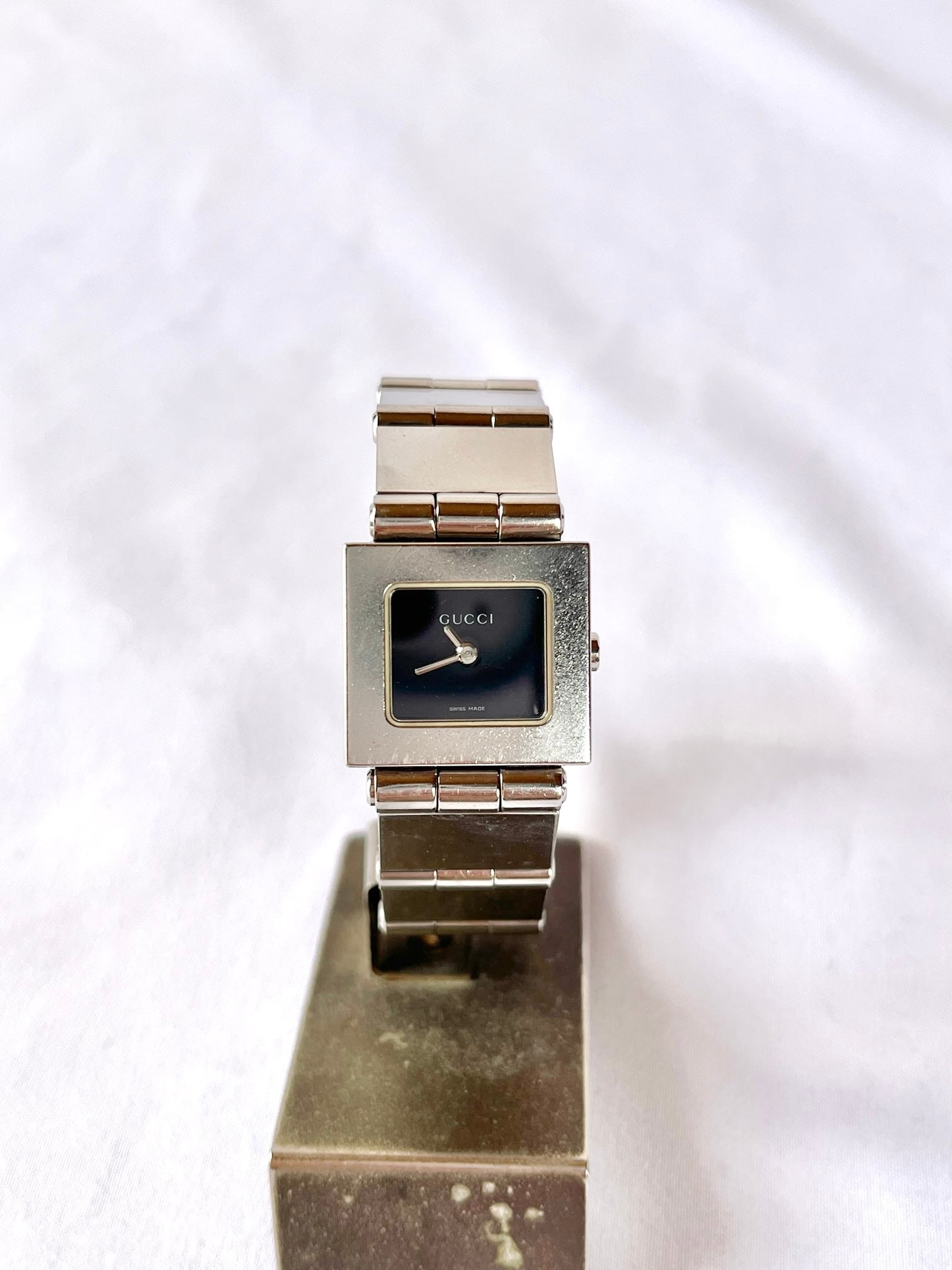 正方形のフェイスがモードなGucciメタルウォッチ。インデックスレスで、スタイリッシュなブラックの文字盤が知的な印象。ブロック型のブレスが、アクセとしても目をひく一品です。