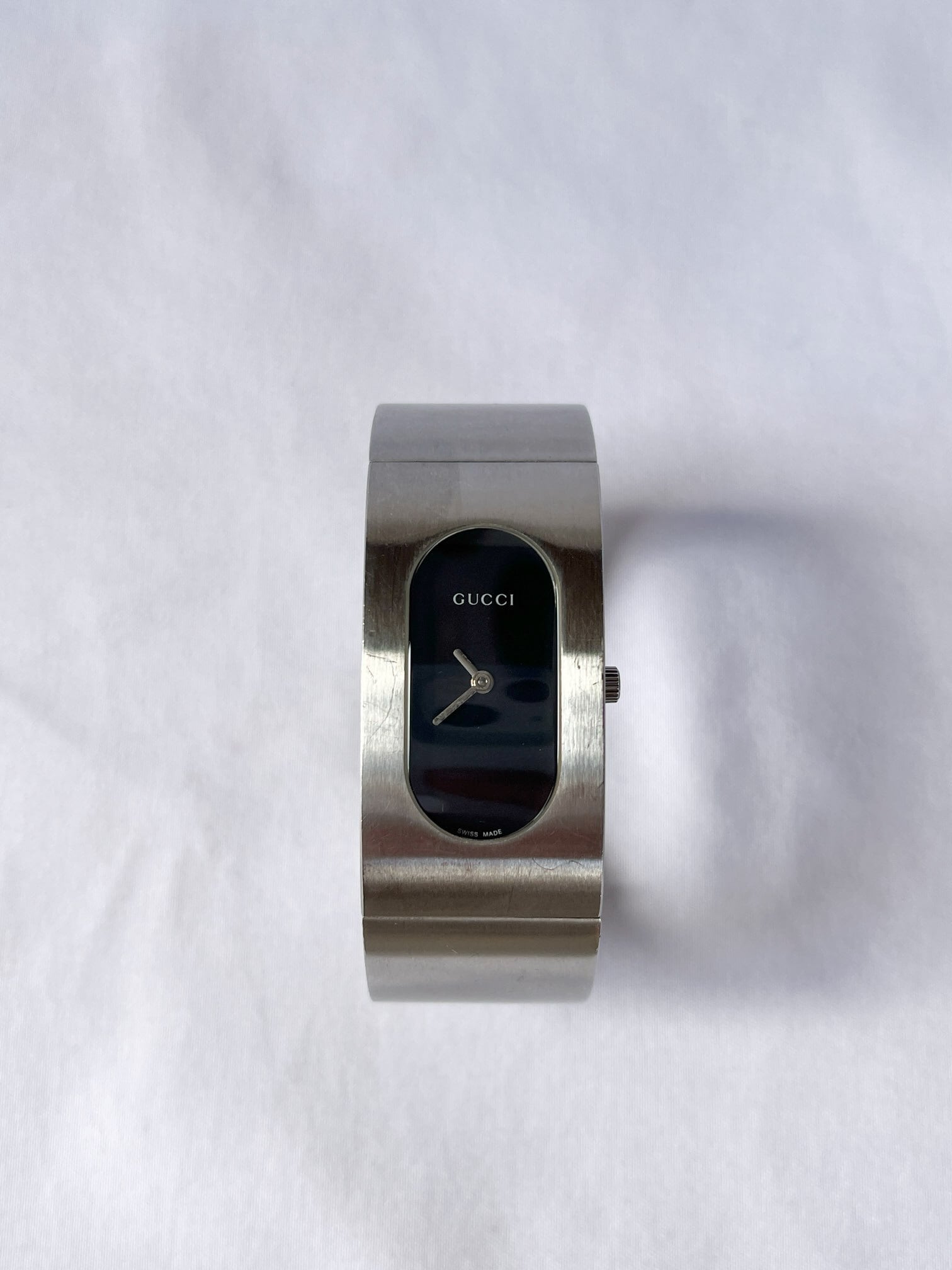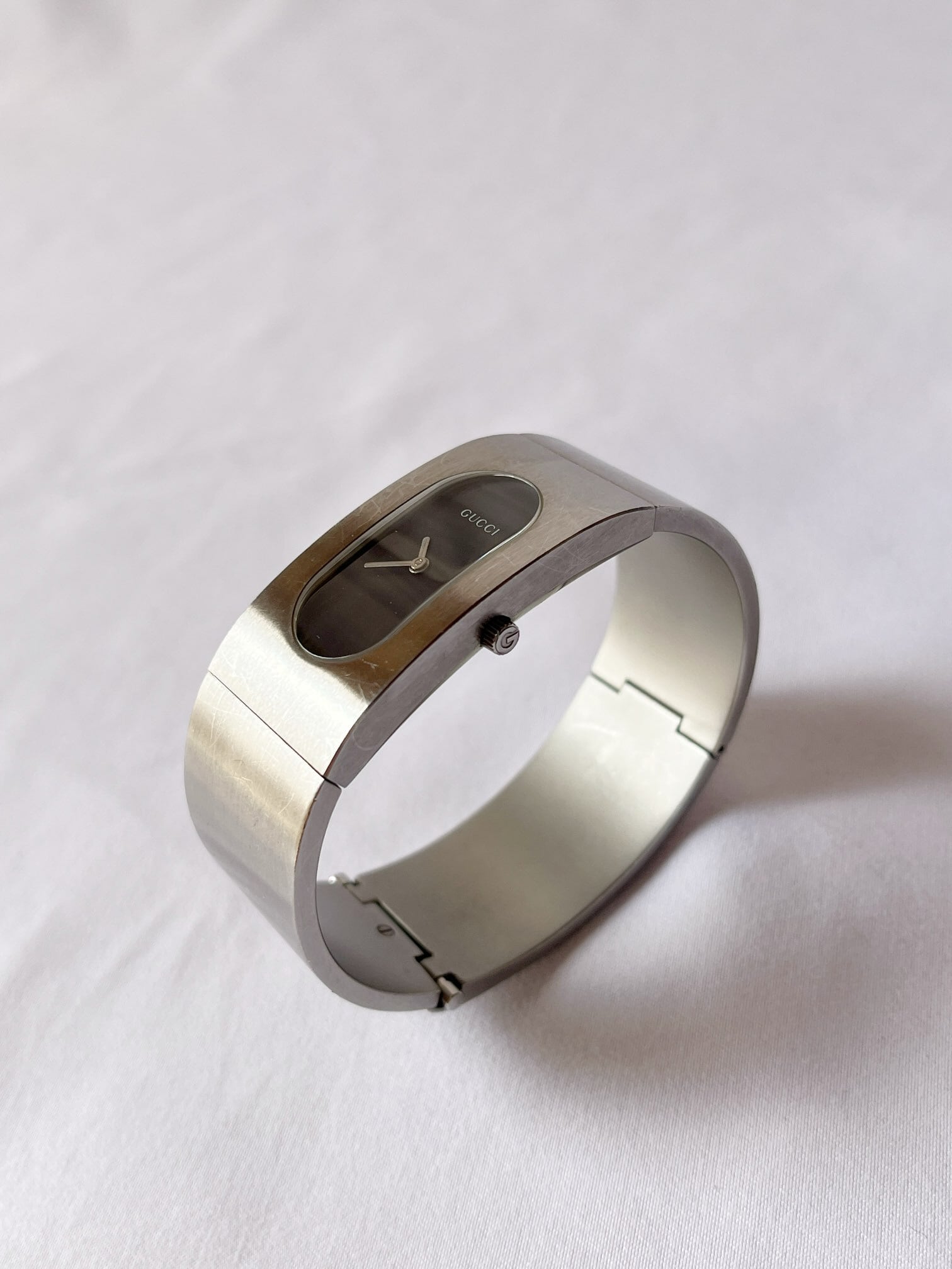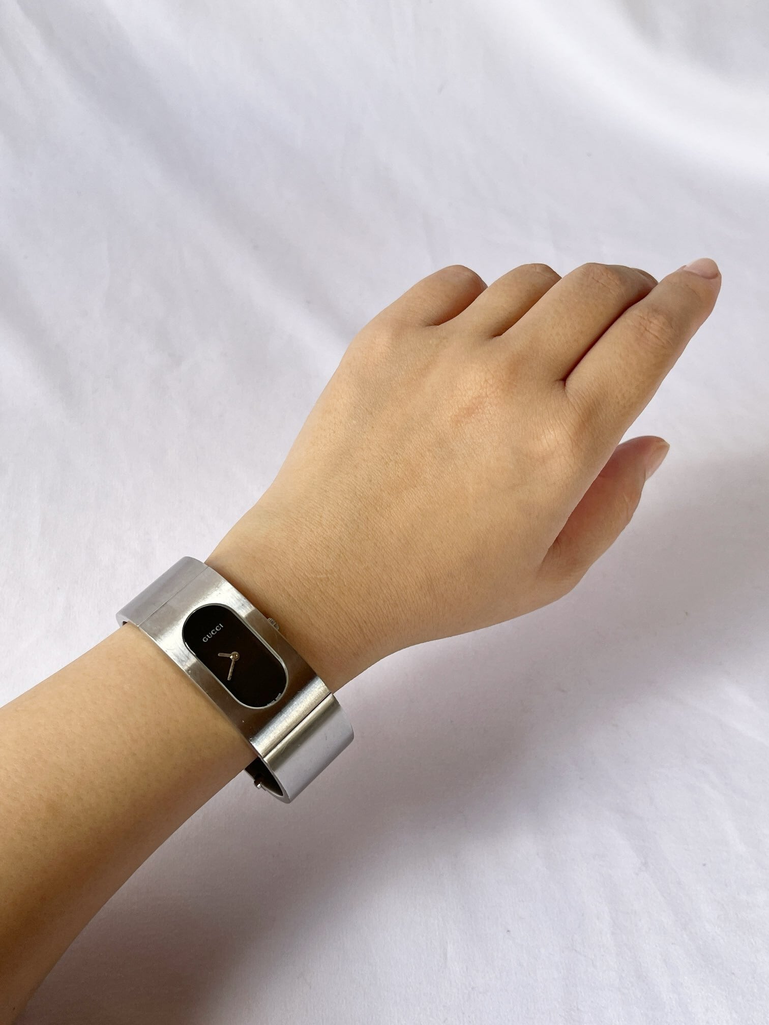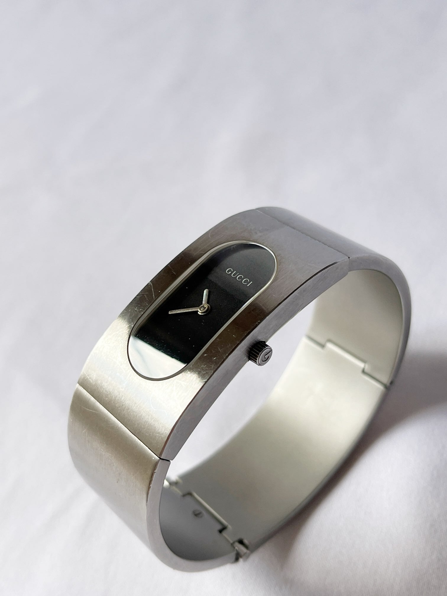 惰円型のフェイスがユニークなGUCCIのバングルウォッチ。
