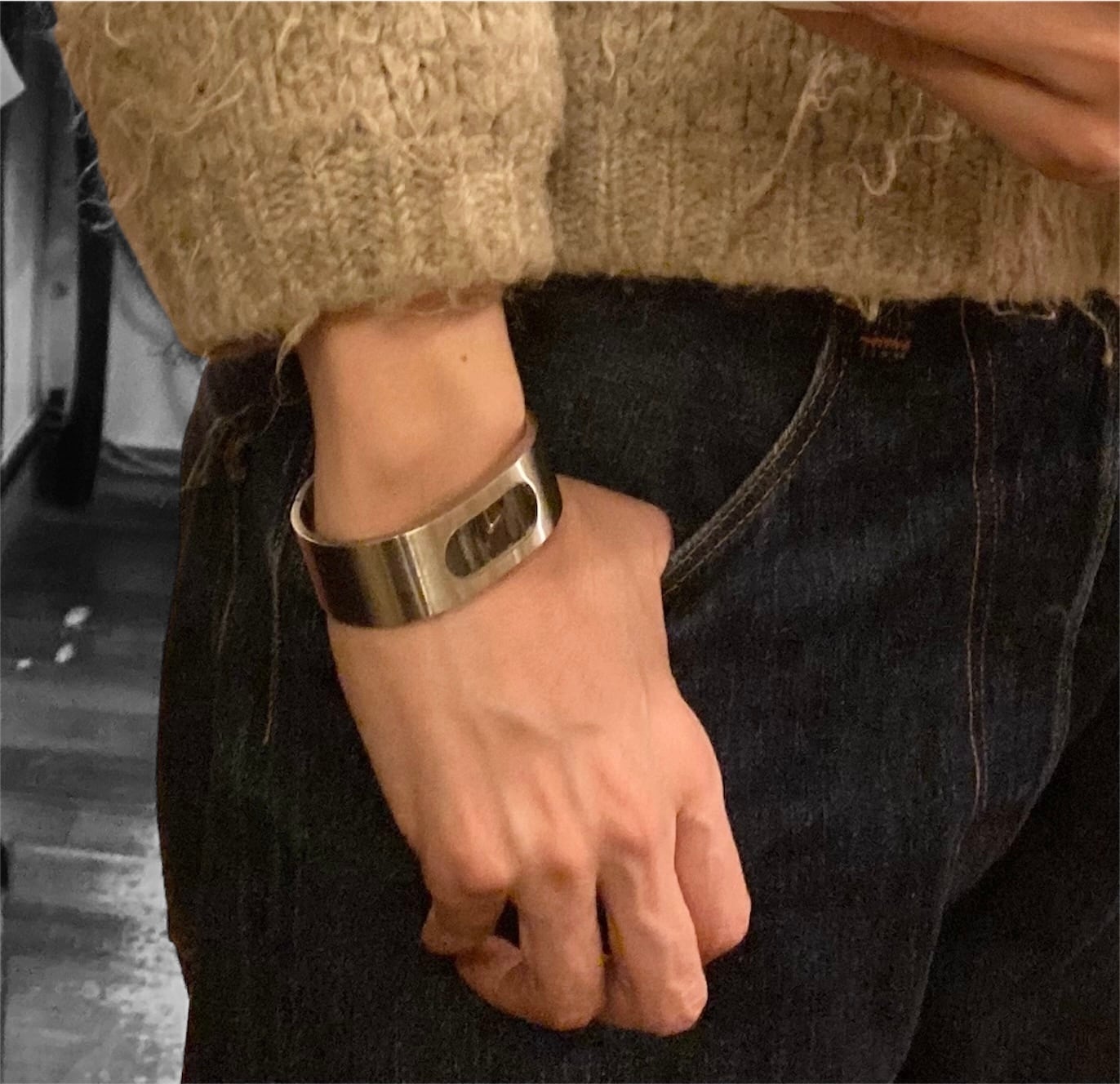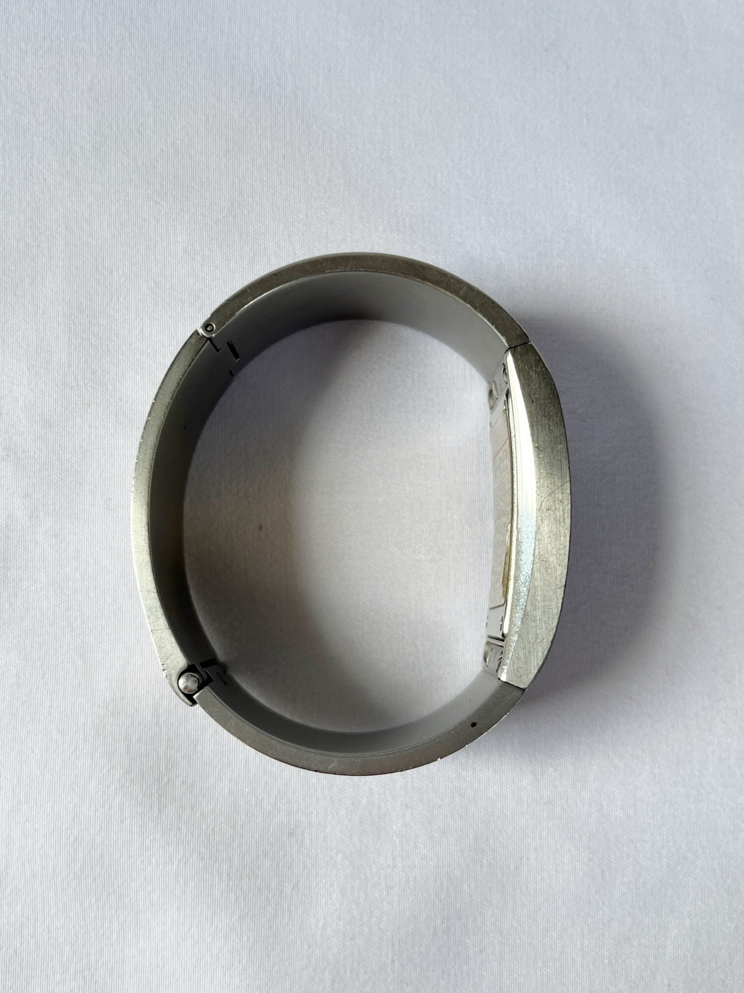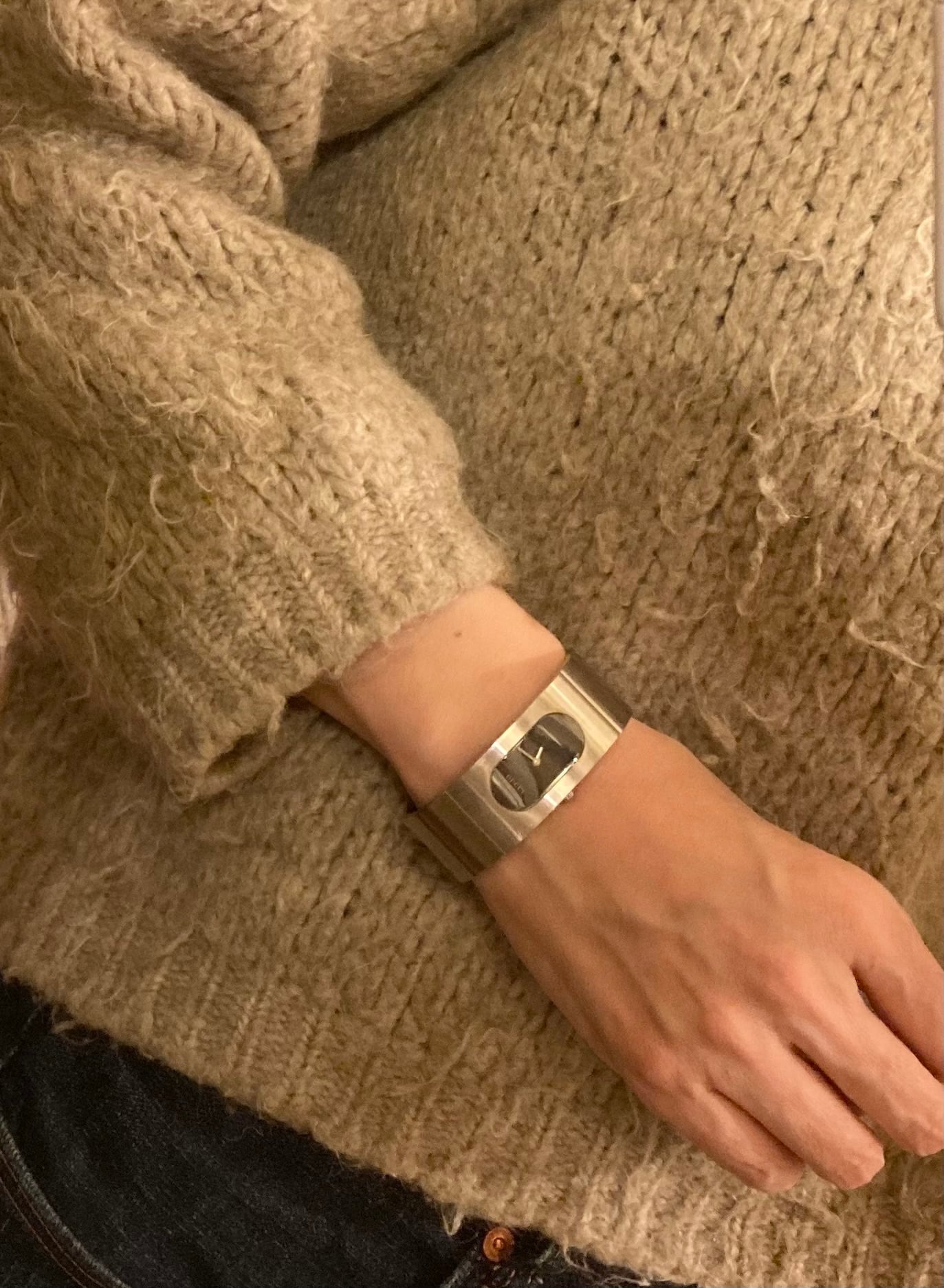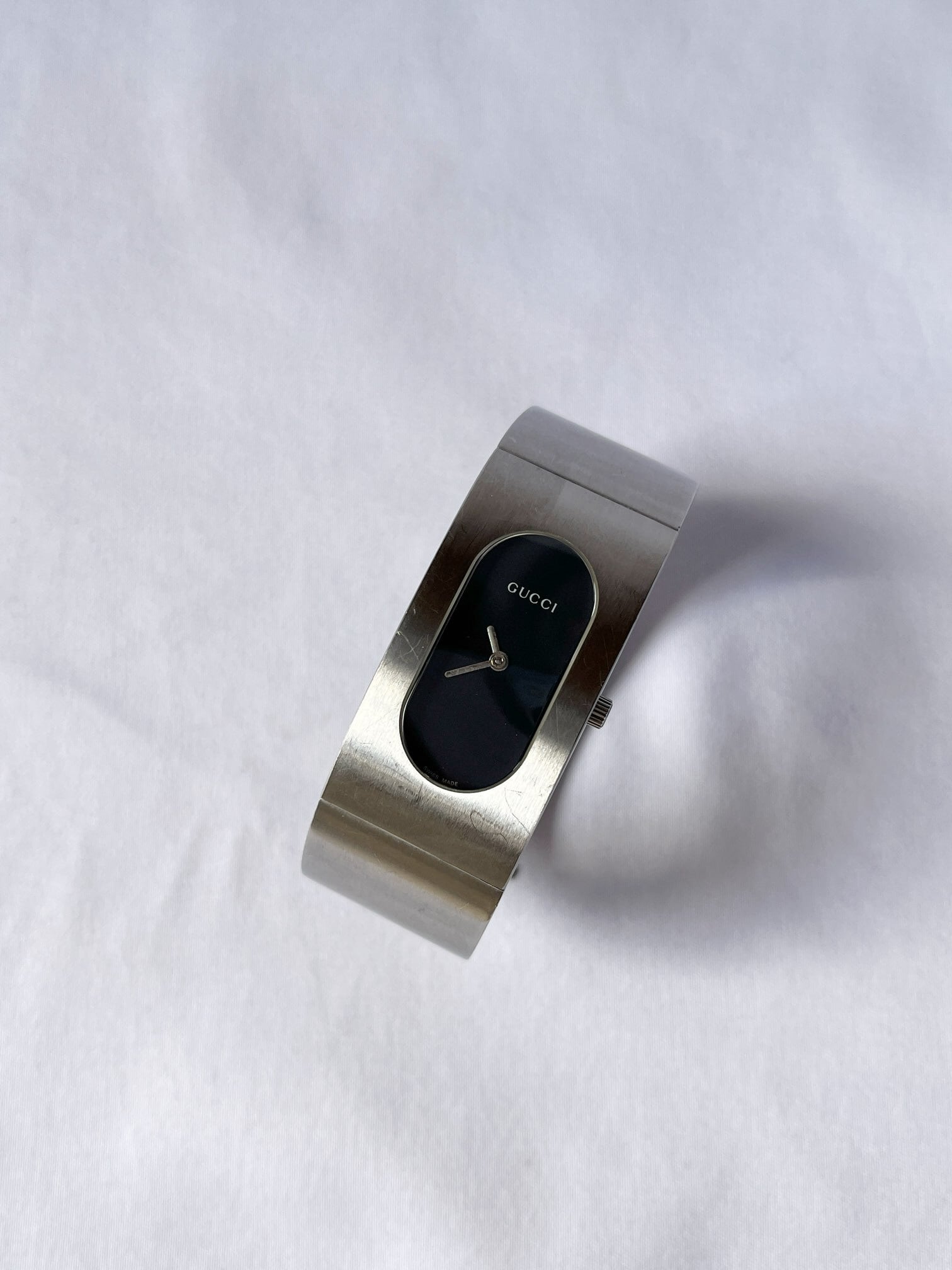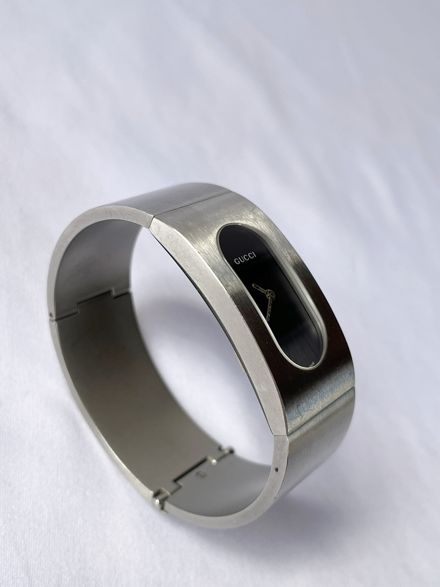 惰円型のフェイスがユニークなGUCCIのバングルウォッチ。
