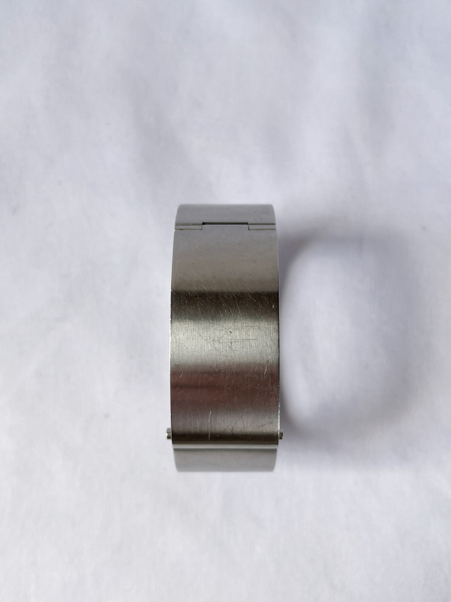 インデックスレスで、スタイリッシュなブラックの文字盤が知的な印象。太めのバングルは一切ムダのないデザインで、 無機質さがスペース感のある一品です。