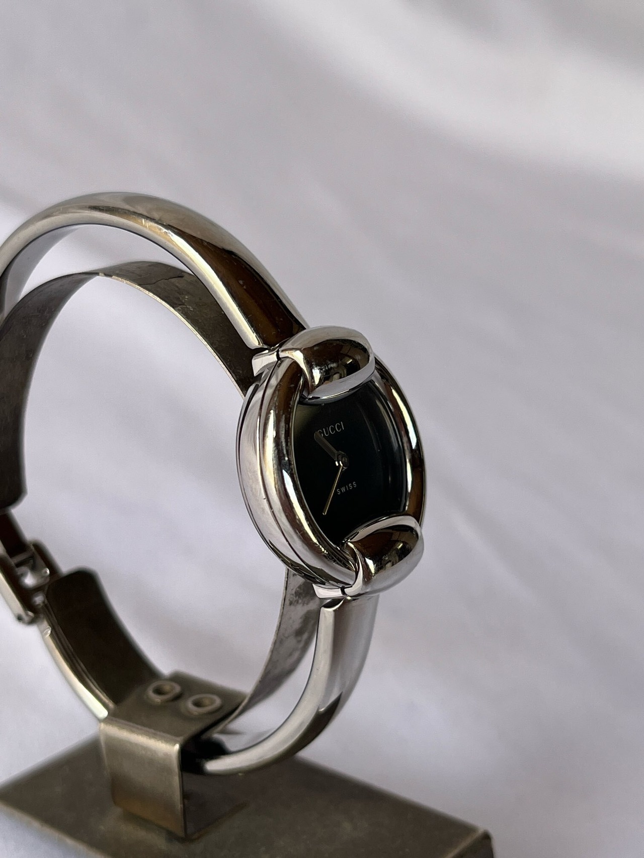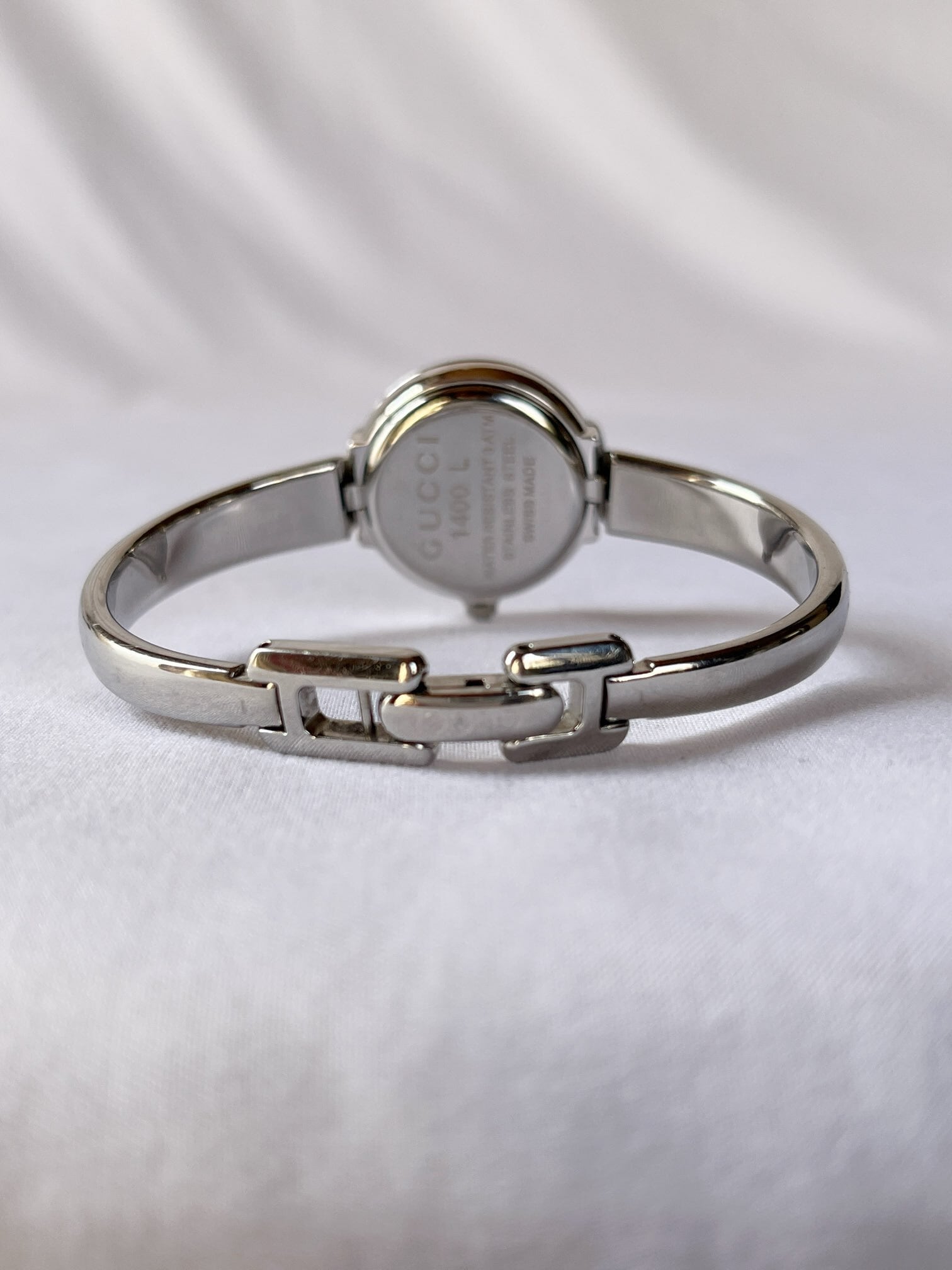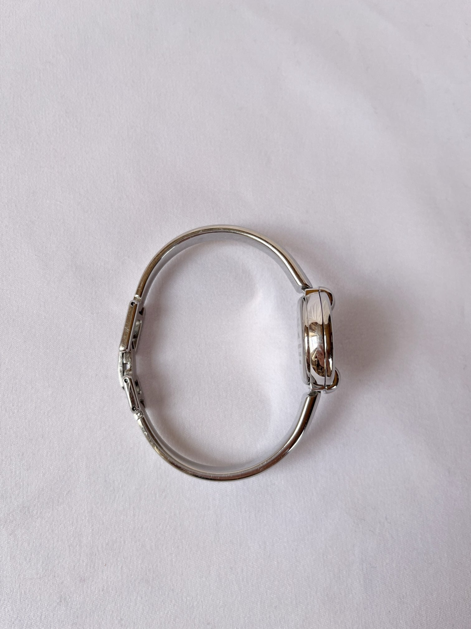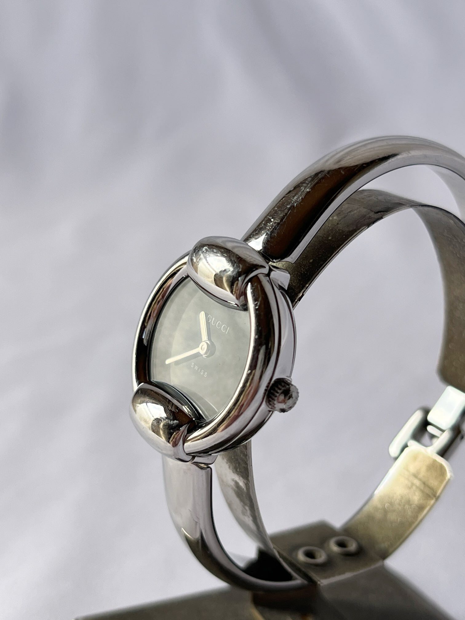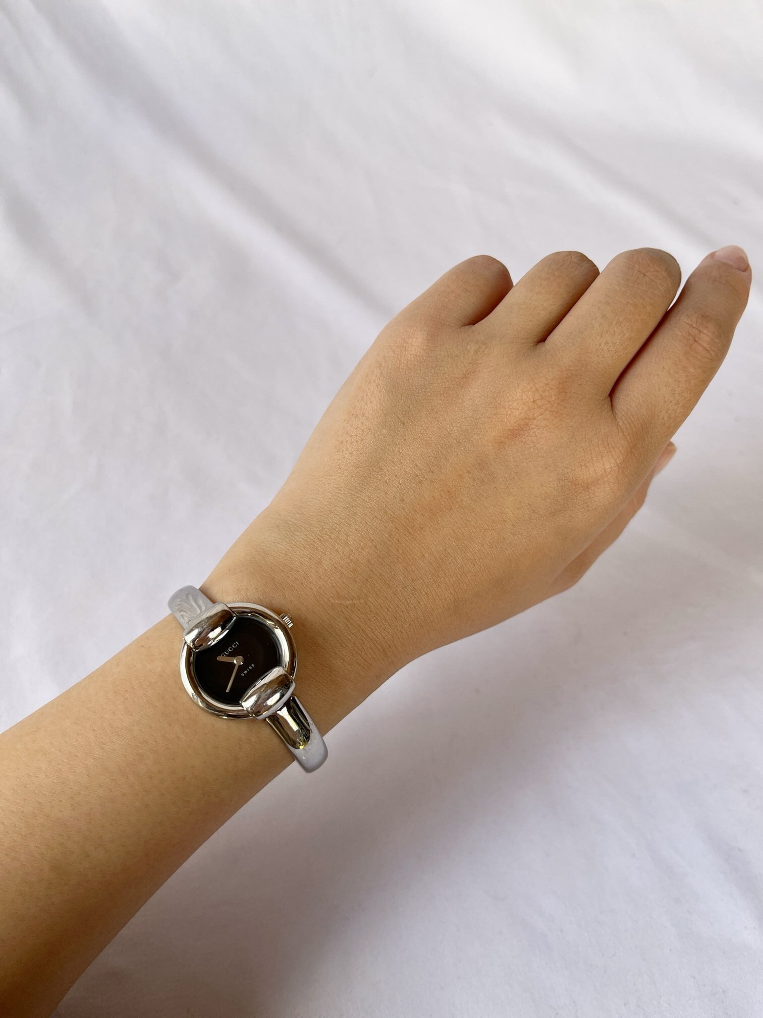 ラウンド型のフェイスが柔らかな雰囲気のGUCCIメタルウォッチ。