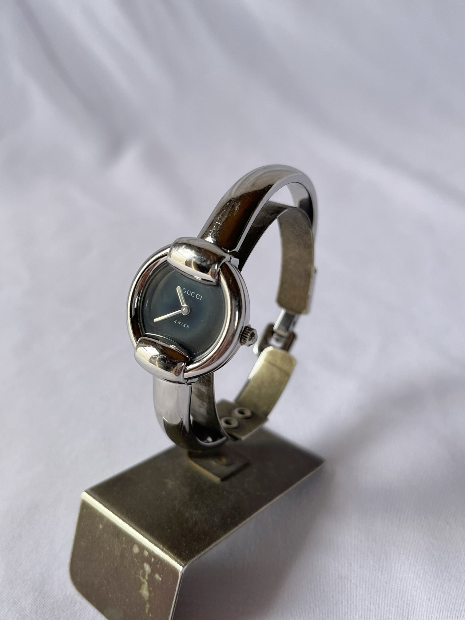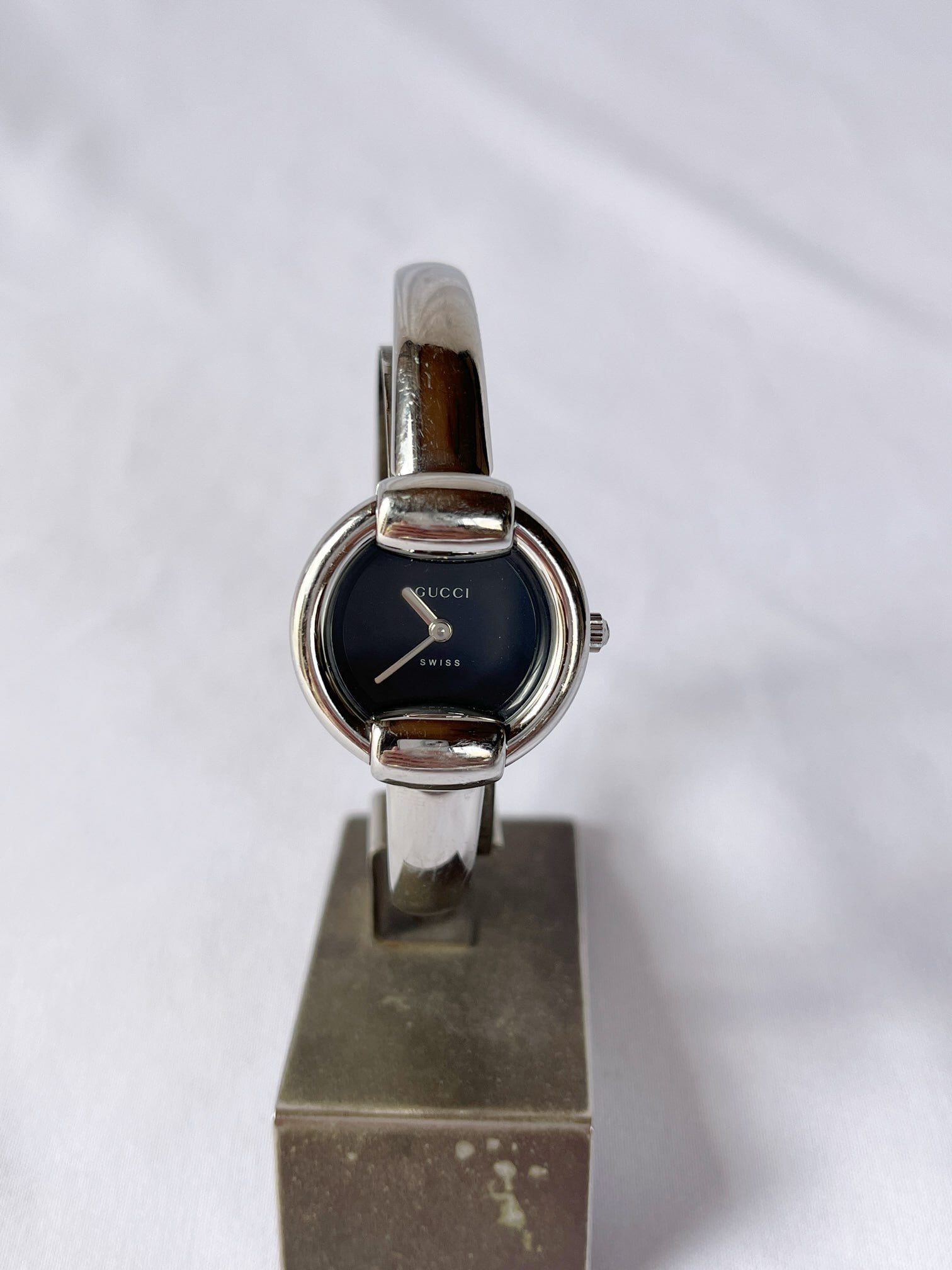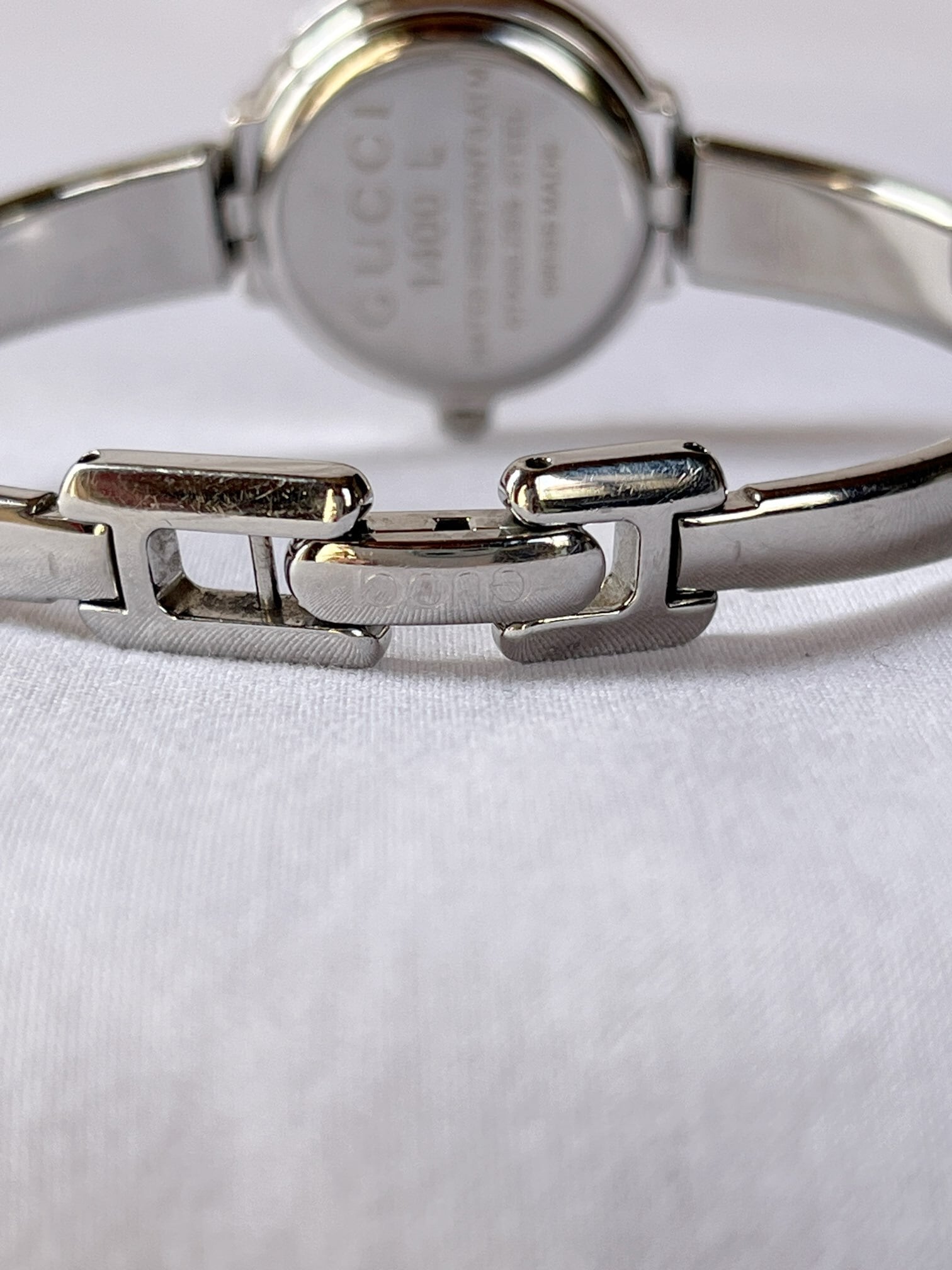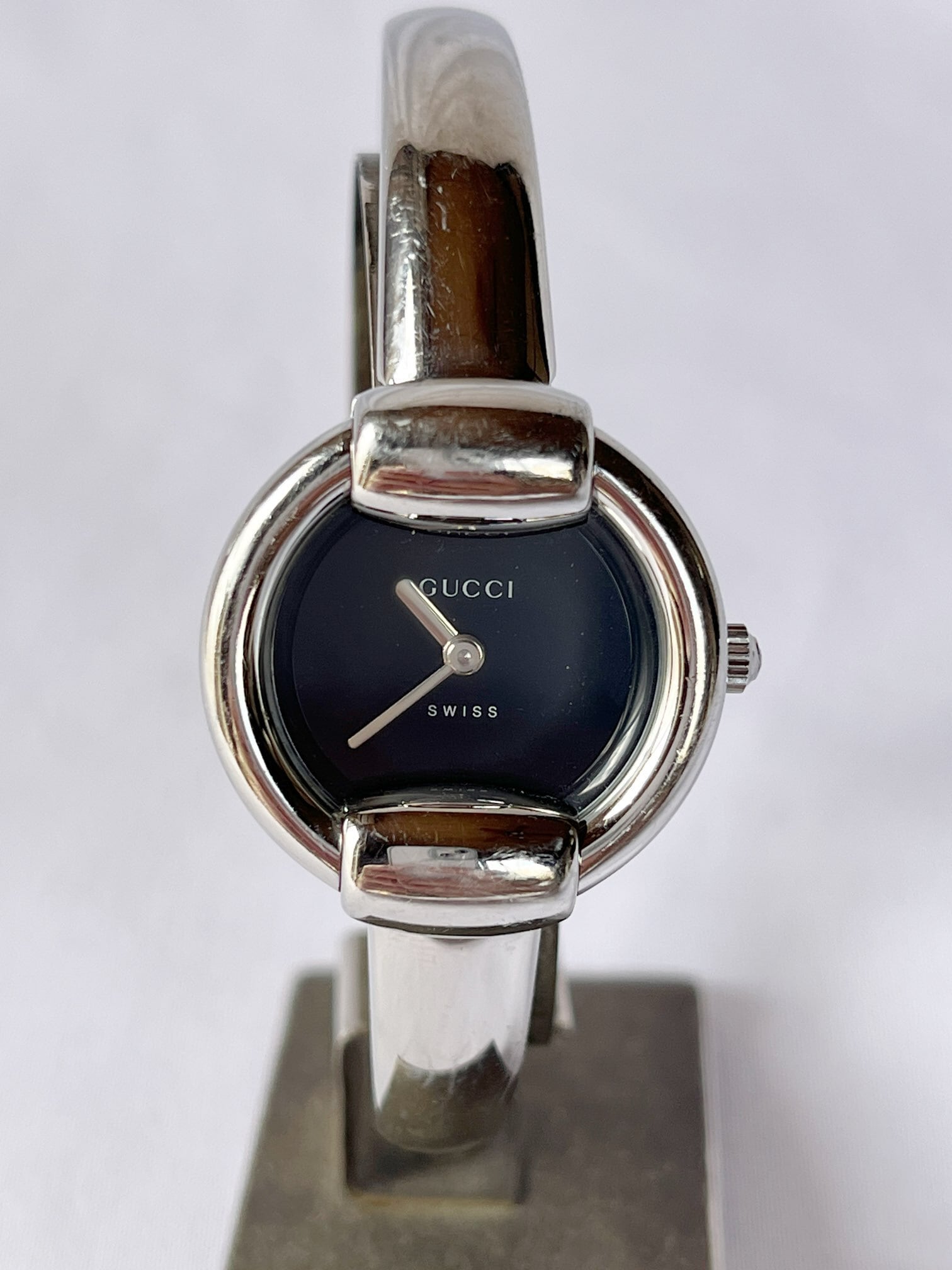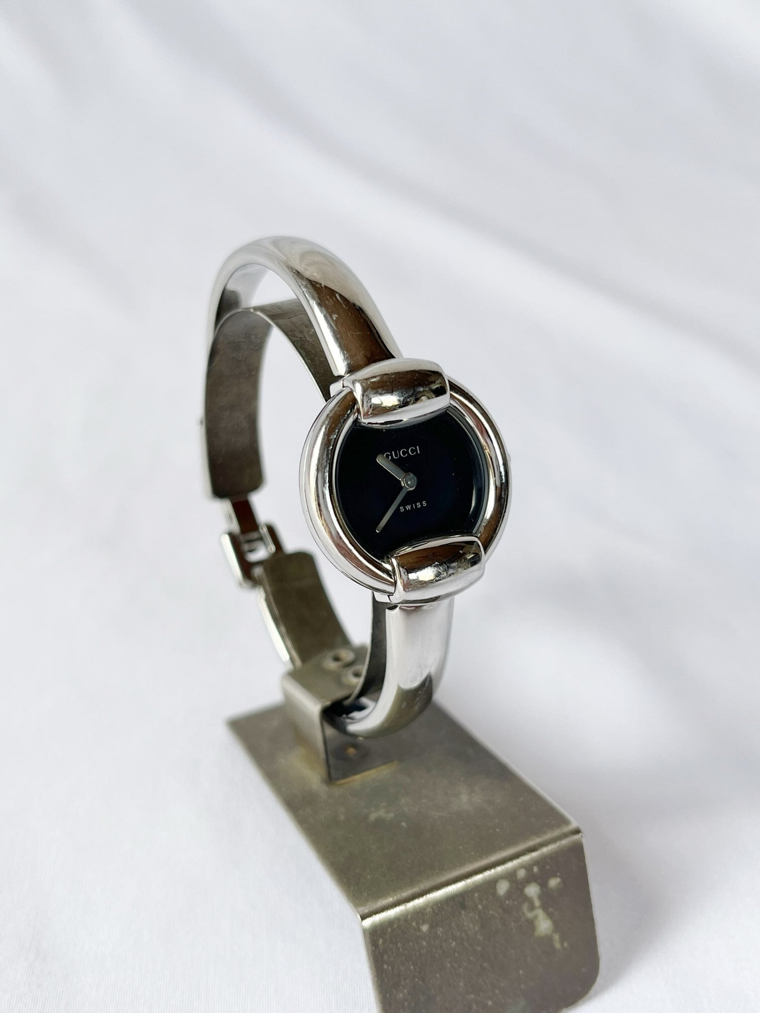 ラウンド型のフェイスが柔らかな雰囲気のGUCCIメタルウォッチ。