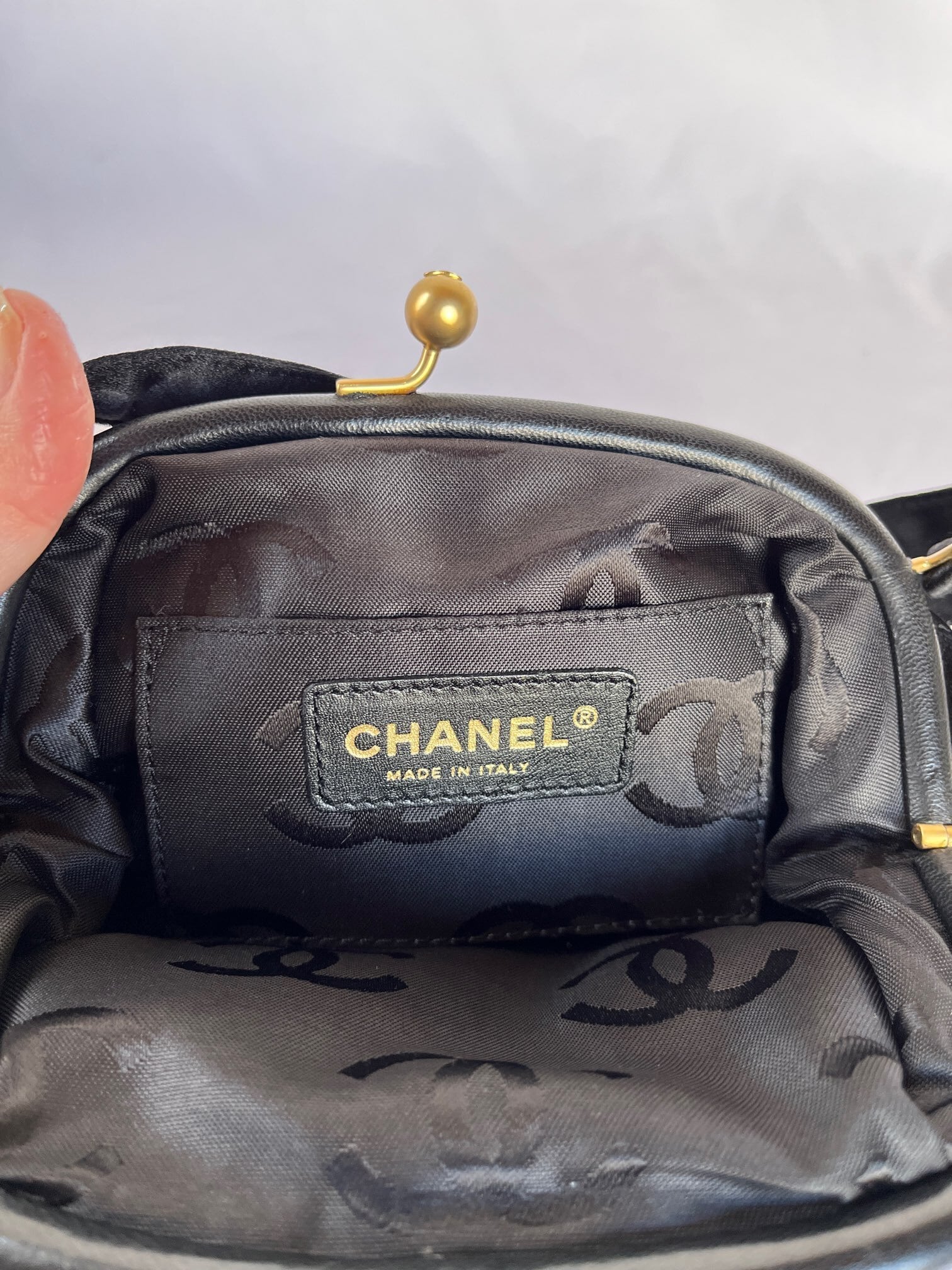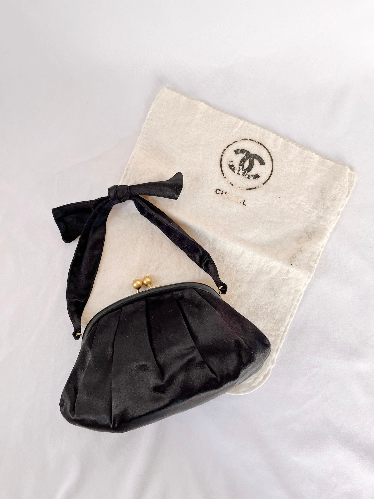 光沢のあるブラックサテン地とがま口が可憐なCHANELミニハンドバッグ, 2005-6年 vintage。